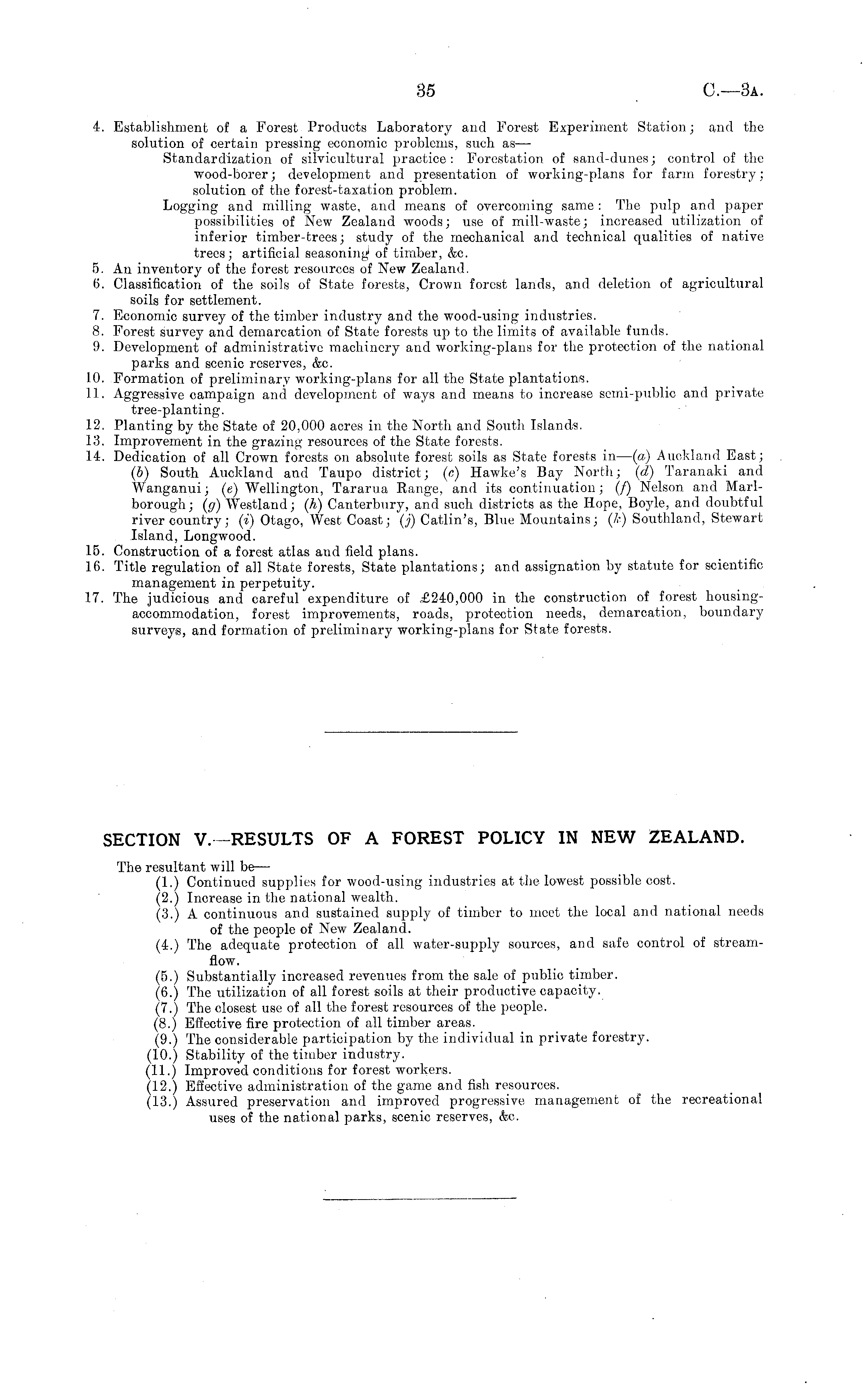 SECTION V. -RESULTS OF A FOREST POLICY IN NEW ZEALAND. The resultant will be — (1.) Continued supplies for wood-using industries at the lowest possible cost. (2.) Increase in the national wealth. (3.) A continuous and sustained supply of timber to meet the local and national needs of the people of New Zealand. (4.) The adequate protection of all water-supply sources, and safe control of streamflow. (5.) Substantially increased revenues from the sale of public timber. (6.) The utilization of all forest soils at their productive capacity. (7.) The closest use of all the forest resources of the people. (8.) Effective fire protection of all timber areas. (9.) The considerable participation by the individual in private forestry. (10.) Stability of the timber industry. (11.) Improved conditions for forest workers. (12.) Effective administration of the game and fish resources. (13.) Assured preservation and improved progressive management of the recreational uses of the national parks, scenic reserves, &c.