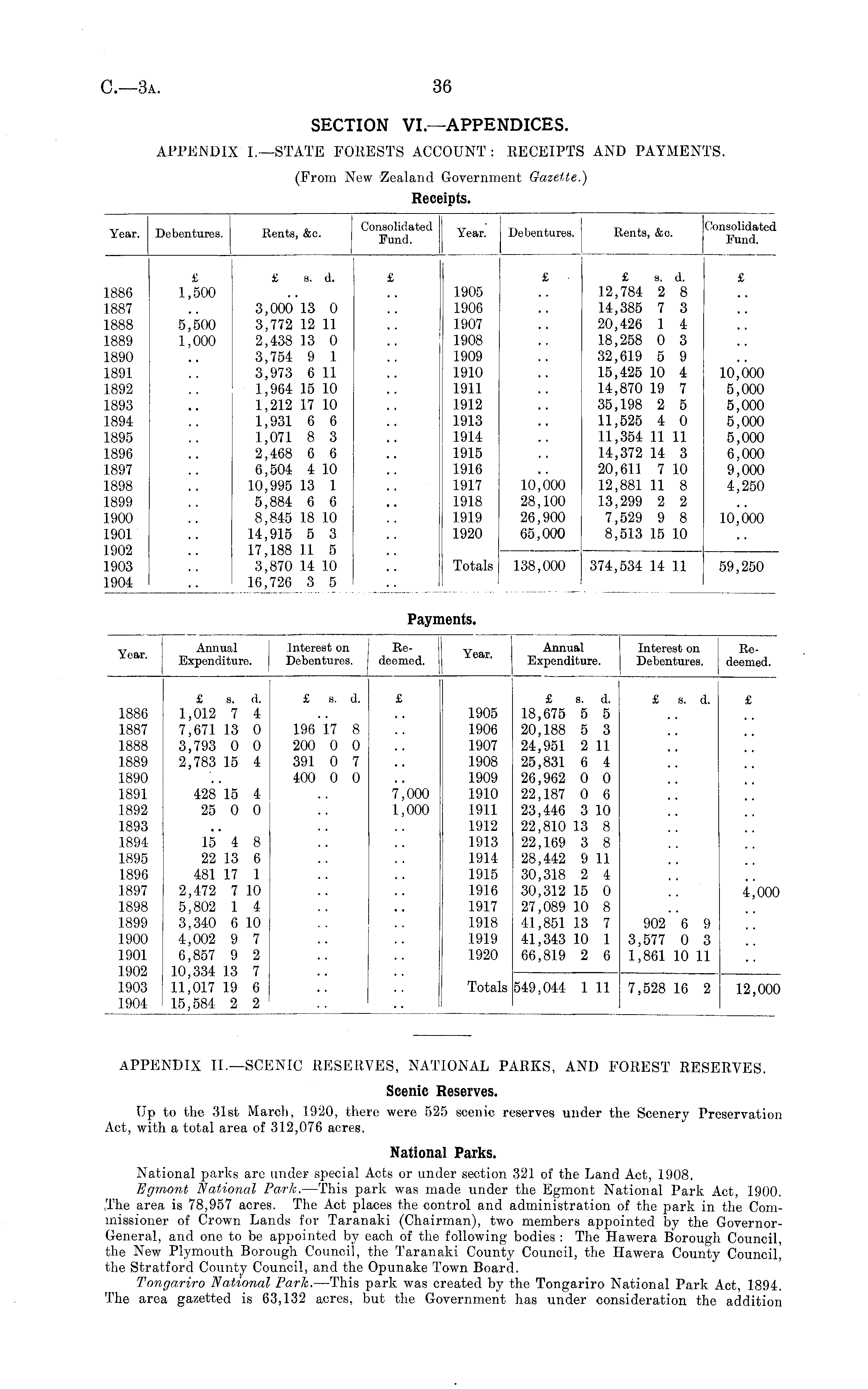 APPENDIX II.—SCENIC RESERVES, NATIONAL PARKS, AND FOREST RESERVES. Scenic Reserves. Up to the 31st March, 1920, there were 525 scenic reserves under the Scenery Preservation Act, with a total area of 312,076 acres. National Parks. National parks are under special Acts or under section 321 of the Land Act, 1908. Egmont National Park. —This park was made under the Egmont National Park Act, 1900. The area is 78,957 acres. The Act places the control and administration of the park in the Commissioner of Crown Lands for Taranaki (Chairman), two members appointed by the GovernorGeneral, and one to be appointed by each of the following bodies : The Hawera Borough Council, the New Plymouth Borough Council, the Taranaki County Council, the Hawera County Council, the Stratford County Council, and the Opunake Town Board. Tongariro National Park. —This park was created by the Tongariro National Park Act, 1894. The area gazetted is 63,132 acres, but the Government has under consideration the addition