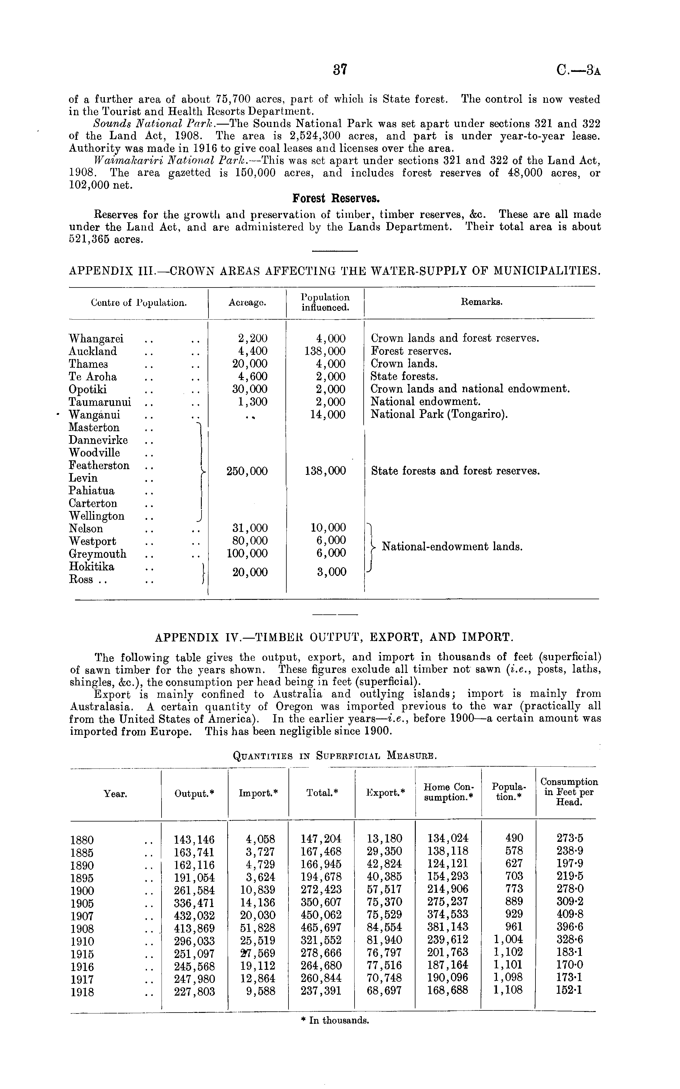 APPENDIX IV.—TIMBER OUTPUT, EXPORT, AND IMPORT. The following table gives the output, export, and import in thousands of feet (superficial) of sawn timber for the years shown. These figures exclude all timber not sawn (i.e., posts, laths, shingles, &c), the consumption per head being in feet (superficial). Export is mainly confined to Australia and outlying islands; import is mainly from Australasia. A. certain quantity of Oregon was imported previous to the war (practically all from the United States of America). In the earlier years — i.e., before 1900 —a certain amount was imported from Europe. This has been negligible since 1900.