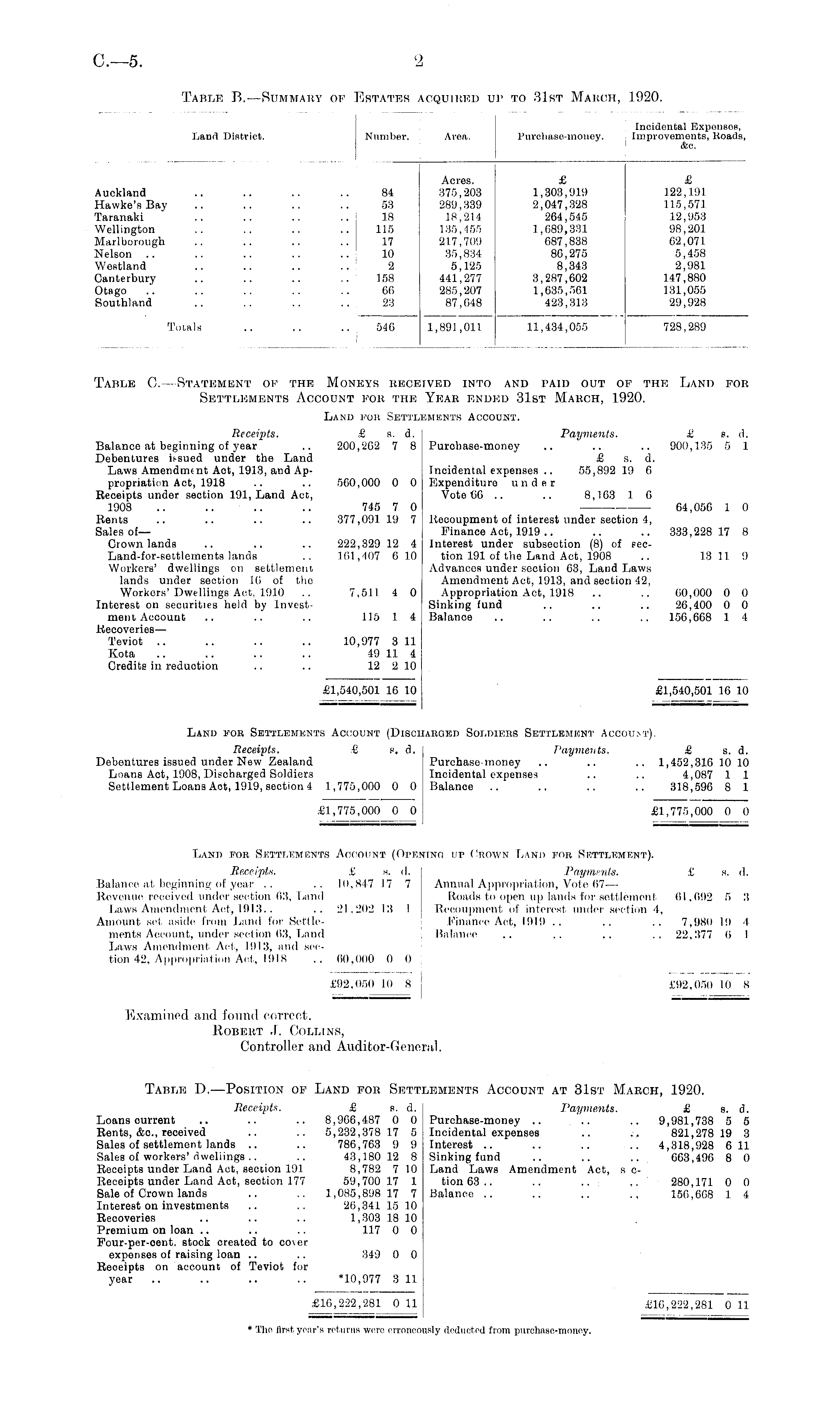 Table 0. —Statement of the Moneys received into and faid out of the Land for Settlements Account for the Year ended 31st March, 1920. Land for Settlements Account. Receipts. £ s. d. Payments. £ s. d. Balance at beginning of year .. 200,262 7 8 Purchase-money .. .. .. 900,135 5 1 Debentures hsued under the Land £ s. d. Laws Amendment Act, 1913, arid Ap- Incidental expenses .. 55,892 19 6 propriation Act, 1918 .. .. 560,000 0 0 Expenditure under Receipts under section 191, Land Act, Vote CO .. .. 8,163 1 6 1908 .. .. .. .. 745 7 0 64,056 1 0 Bents .. .. .. .. 377,091 19 7 Recoupment of interest under section 4, Sales of— Finance Act, 1919 .. .. .. 333,228 17 8 Crown lands .. .. .. 222,329 12 4 Interest under subsection (8) of sec-Land-for-settlements lands .. 161,407 6 10 tion 191 of the Land Act, 1908 .. 13 11 9 Workers' dwellings on settlement Advances under section 63, Land Laws lands under section 16 of the Amendment Act, 1913, and section 42, Workers' Dwellings Act, 1910 .. 7,511 4 0 Appropriation Act, 1918 .. .. 60,000 0 0 Interest on securities held by Invest- Sinking fund .. .. .. 26,400 0 0 merit Account .. .. .. 115 1 4 Balance .. .. .. .. 156,668 1 4 Recoveries — Teviot .. .. .. .. 10,977 311 Kota .. .. .. .. 49 11 4 Credits in reduction .. .. 12 2 10 £1,540,501 16 10 £1,540,501 16 10 Land for Settlements Account (Discharged Soldiers Settlement Account). Receipts. £ s. d. Payments. £ s. d. Debentures issued under New Zealand Purchase-money .. .. .. 1,452,316 10 10 Loans Act, 1908, Discharged Soldiers Incidental expenses .. .. 4,087 1 1 Settlement Loans Aot, 1919, section 4 1,775,000 0 0 Balanoe .. .. .. .. 318,596 8 1 £1,775,000 0 0 £1,775,000 0 0 Land for Settlements Account (Opening: up Crown Land for Settlement). Receipts. il s. d. Payments. .£ s. d. Balanoe at beginning of year .. .. 10,847 17 7 Annual Appropriation, Vote 67— Revenue received under section 63, Land Roads to open up lands for Settlement 61.692 5 3 Laws Amendment Act, 1913.. .. 21,202 13 1 Recoupment of interest under section 4, Amount set aside from Land for Settle- Finance Aot, 1919 .. .. .. 7,980 19 4 ments Account, under section 63, Land Balanoe .. .. .. .. 22,377 6 I Laws Amendment Act, 1913, and section 42, Appropriation Ait, 1918 .. 60,000 0 0 £92,050 10 8 £92,050 10 8 Examined and found correct. Robert .1. Collins, Controller and Auditor-General. Table D. —Position of Land for Settlements Account at 31st March, 1920. Receipts. £ s. d. Payments. £ s. 6. Loans current .. .. .. 8,906,487 0 0 Purchase-money .. '.. .. 9,981,738 5 5 Rents, &0., received .. .. 5,232,378 17 5 Incidental expenses .. ... 821,278 19 3 Sales of settlement lands .. .. 786,763 9 9 Interest .. .. .. ... 4,318,928 611 Sales of workers'dwellings.. .. 43,180 12 8 Sinking fund .. .. .. 663,496 8 0 Receipts under Land Act, section 191 8,782 7 10 Land Laws Amendment Act, s cReceipts under Land Act, section .177 59,700 17 1 tion 63 .. .. .. ~ ' 280,171 0 0 Sale of Crown lands .. .. 1,085,898 17 7 Balance .. .. .. ~ 156,608 1 4 Interest on investments .. .. 26,341 15 10 Recoveries .. .. .. 1,303 18 10 Premium on loan .. .. .. 117 0 0 Four-per-oent. stock created to cover expenses of raising loan .. .. 349 0 0 Receipts on account of Teviot for year .. .. .. .. *10,977 311 £16,222,281 0 11 £16,222,281 0 11 * The first year's returns were erroneously deducted from purchase-money.