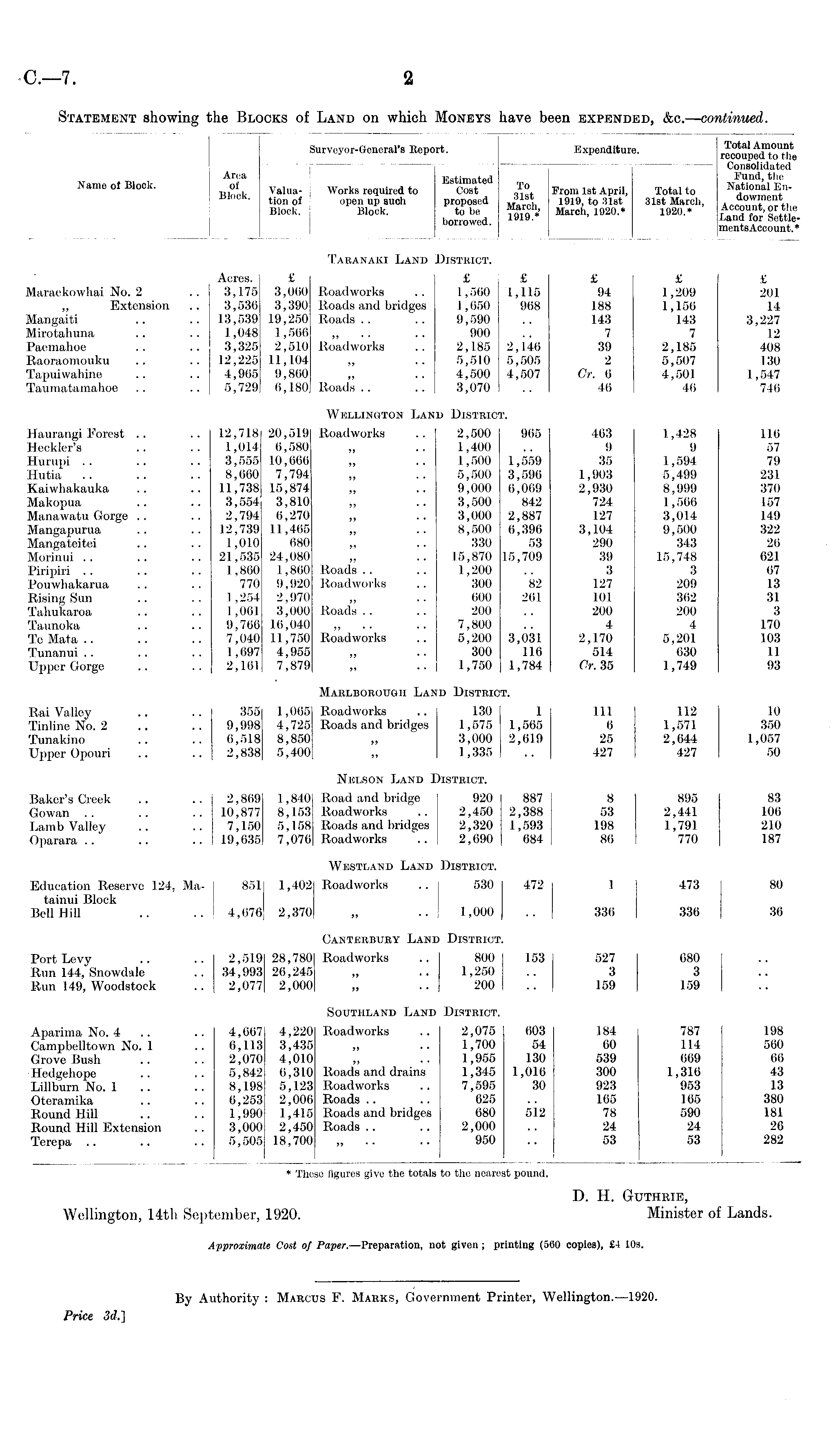 D. H. Guthrie, Wellington, 14th September, 1920. Minister of Lands.
