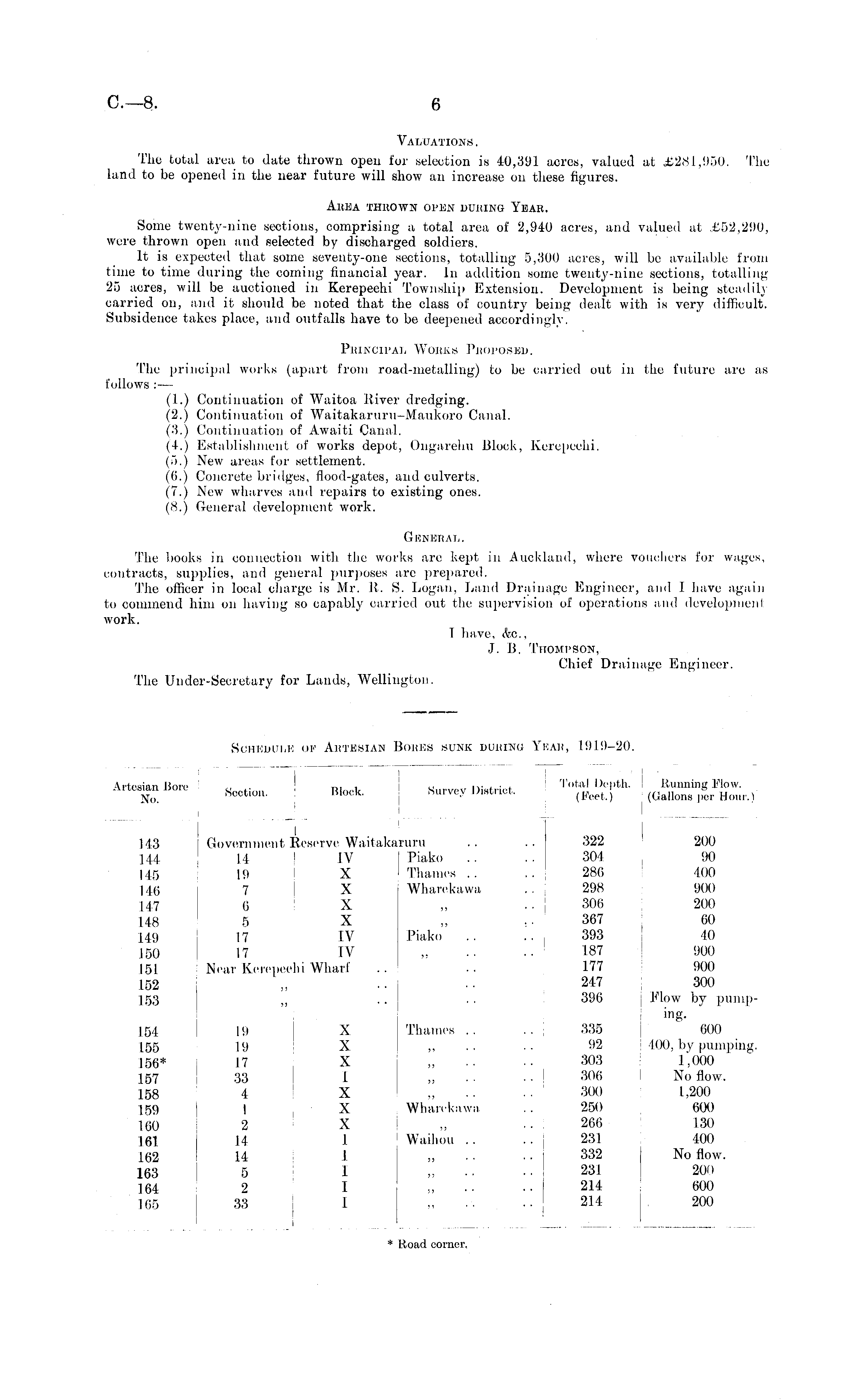 Valuations. The total area to date thrown open for selection is 40,391 acres, valued at £281,950-. The land to be opened in the near future will show an increase on these figures. Area thrown open during Year. Some twenty-nine sections, comprising a total area of 2,940 acres, and valued at £52,290, were thrown open and selected by discharged soldiers. It is expected that some seventy-one sections, totalling 5,300 acres, will be available from time to time during the coming financial year. In addition some twenty-nine sections, totalling 25 acres, will be auctioned in Kerepeehi Township Extension. Development is being steadily carried on, and it should be noted that the class of country being dealt with is very difficult. Subsidence takes place, and outfalls have to be deepened accordingly. Principal Works Proposed. The principal works (apart from road-metalling) to be carried out in the future are as follows : — (1.) Continuation of Waitoa River dredging. (2.) Continuation of Waitakaruru—Maukoro Canal. (3.) Continuation of Awaiti Canal. (4.) Establishment of works depot, Ongarehu Block, Kerepeehi. (5.) New areas for settlement. ((i.) Concrete bridges, flood-gates, and culverts. (7.) New wharves and repairs to existing ones. (8.) General development work. General. The books in connection with the works are kept in Auckland, where vouchers for wages, contracts, supplies, and general purposes are prepared. The officer in local charge is Mr. It. S. Logan. Land Drainage Engineer, and I have again to commend him on having so capably carried out the supervision of operations and development work. I have, ifec, .1. IS. Thompson, Chief Drainage Engineer. The Under-Secretary for Lands, Wellington.