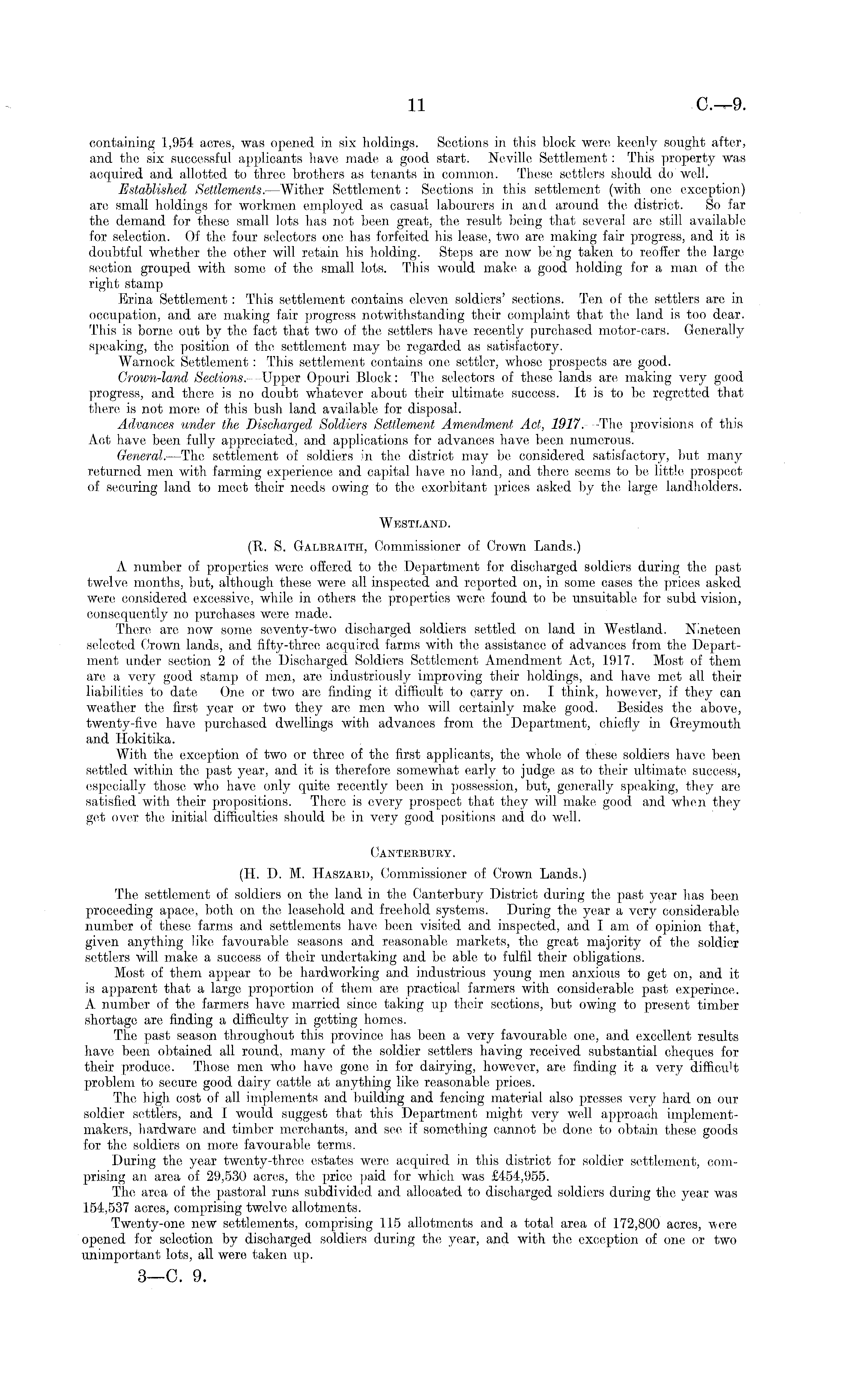 containing 1,954 acres, was opened in six holdings. Sections in this block were keenly sought after, and the six successful applicants have made, a good start. Neville Settlement : This property was acquired and allotted to three brothers as tenants in common. These settlers should do well. Established Settlements. —Wither Settlement : Sections in this settlement (with one, exception) are small holdings for workmen employed as casual labourers in and around the district. So far the demand for these small lots has not been great, the result being that several are still available for selection. Of the four selectors one has forfeited his lease, two are making fair progress, and it is doubtful whether the other will retain his holding. Steps are now beng taken to reoffer the large section grouped with some of the small lots. This would make a good holding for a man of the right stamp Erina Settlement : This settlement contains eleven soldiers' sections. Ten of the. settlers are in occupation, and are making fair progress notwithstanding their complaint that the land is too dear. This is borne out by the fact that two of the settlers have recently purchased motor-cars. Generally speaking, the position of the settlement may be regarded as satisfactory. Warnock Settlement : This settlement contains one settler, whose prospects are good. Crown-land Sections.- -Upper Opouri Block: The selectors of these lands are making very good progress, and there is no doubt whatever about their ultimate success. It is to be regretted that there is not more of this bush land available for disposal. Advances under the Discharged Soldiers Settlement Amendment Act, 1917. The provisions of this Aot have been fully appreciated, and applications for advances have been numerous. General. —The settlement of soldiers in the district may be considered satisfactory, but many returned men with, farming experience and capital have no land, and there seems to be little prospect of securing land to meet their needs owing to the exorbitant prices asked by the large landholders. Westland. (B. S. Galbraitii, Commissioner of Crown Lands.) A number of properties were offered to the Department for discharged soldiers during the past twelve months, but, although these were all inspected and reported on, in some cases the prices asked were considered excessive, while in others the properties were found to be unsuitable for subd vision, consequently no purchases were made. There are now some seventy-two discharged soldiers settled on land in Westland. Nineteen selected Crown lands, and fifty-three acquired farms with the assistance of advances from the Department under section 2of the Discharged Soldiers Settlement Amendment Act, 1917. Most of them arc a very good stamp of men, are industriously improving their holdings, and have met all their liabilities to date One or two are finding it difficult to carry on. I think, however, if they can weather the first year or two they are men who will certainly make good. Besides the above, twenty-five have purchased dwellings with advances from the, Department, chiefly in Greymouth and Hokitika. With the exception of two or three of the first applicants, the whole of these soldiers have been settled within the, past year, and it is therefore somewhat early to judge as to their ultimate success, especially those who have only quite recently been in possession, but, generally speaking, they are satisfied with their propositions. There is every prospect that they will make good and when they get over the initial difficulties should be in very good positions and do well. Canterbury. (H. D. M. Haszabd, Commissioner of Crown Lands.) The settlement of soldiers on the land in the Canterbury Distriot during the past year has been proceeding apace, both on the leasehold and freehold systems. During the year a very considerable number of these, farms and settlements have been visited and inspected, and I am of opinion that, given anything like favourable seasons and reasonable markets, the great majority of the soldier settlers will make a success of their undertaking and bo able to fulfil their obligations. Most of them appear to be hardworking and industrious young men anxious to get on, and it is apparent that a large proportion of them are practical farmers with considerable past experince. A number of the farmers have married since taking up their sections, but owing to present timber shortage are finding a difficulty in getting homes. The past season throughout this province has been a very favourable, one, and excellent results have been obtained all round, many of the soldier settlers having received substantial cheques for their produce. Those men who have gone in for dairying, however, are finding it a very difficult problem to secure good dairy cattle at anything like reasonable prices. The high cost, of all implements and building and fencing material also presses very hard on our soldier settlers, and I would suggest that this Department might very well approach implementmakers, hardware and timber merchants, and see if something cannot be done to obtain these goods for the soldiers on more favourable terms. During the year twenty-three estates were acquired in this district for soldier settlement, comprising an area of 29,530 acres, the price paid for which was £454,955. The area of the. pastoral runs subdivided and allocated to discharged soldiers during the year was 154,537 acres, comprising twelve allotments. Twenty-one new settlements, comprising 115 allotments and a total area of 172,800 acres, were opened for selection by discharged soldiers during the year, and with the exception of one or two unimportant lots, all were taken up.