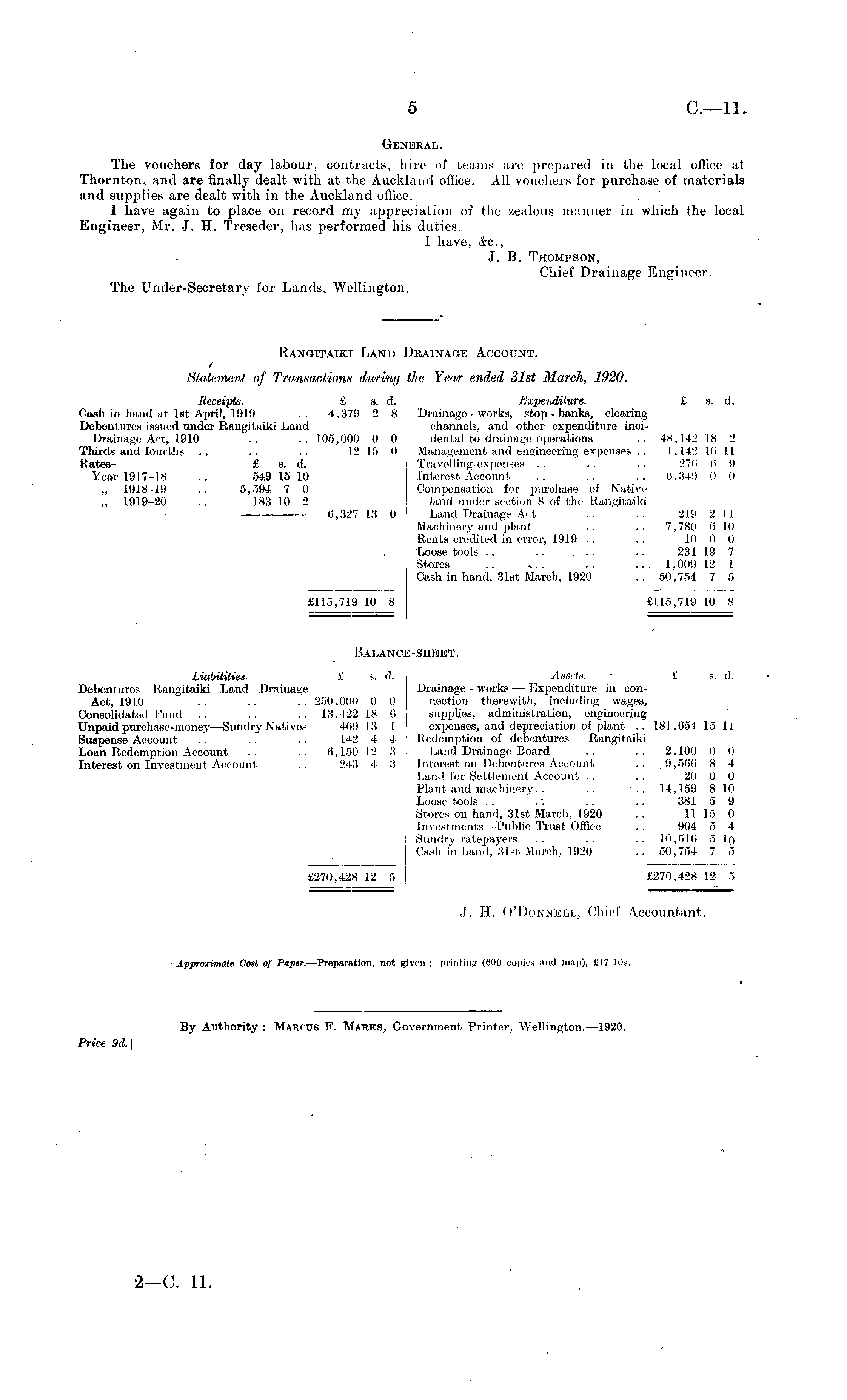 General. The vouchers for day labour, contracts, hire of teams are prepared in the local office at Thornton, and are finally dealt with at the Auckland office. All vouchers for purchase of materials and supplies are dealt with in the Auckland office. I have again to place on record my appreciation of the zealous manner in which the local Engineer, Mr. J. H. Treseder, has performed his duties. I have, &c, J. B. Thompson, Chief Drainage Engineer. The Under-Secretary for Lands, Wellington. Rangitaiki Land Drainage Account. Statement of Transactions during the Year ended 31st March, 1920. Receipts. £ s. d. Expenditure. £ s. d. Cash in hand at Ist April, 1919 .. 4,379 2 8 Drainage - works, stop - banks, clearing Debentures issued under Rangitaiki Land channels, and other expenditure inoiDrainage Act, 1910 .. .. 105,000 0 0 dental to drainage operations .. 48,142 18 2 Thirds and fourths .. .. .. 12 15 0 Management and engineering expenses .. 1,142 16 It Rates — £ s. d. Travelling-expenses .. .. .. 276 6 9 Year 1917-18 .. 549 15 10 Interest Account ... .. .. 6,349 0 0 „ 1918-19 .. 5,594 7 0 Compensation for purchase of Native „ 1919-20 .. 183 10 2 . land under section Bof the Rangitaiki 6,327 13 0 Land Drainage Act .. .. 219 2 11 Machinery and plant .. .. 7,780 6 10 Rents credited in error, 1919 .. .. 10 0 0 Loose tools .. .. 234 19 7 Stores .. .... .. ... 1,009 12 1 Cash, in hand, 31st March, 1.920 .. 50,754 7 5 £115,719 10 8 £115,719 10 8 Balance-sheet. Liabilities. £ s. d. Assets. ■ £ s. d. Debentures —Rangitaiki Land Drainage Drainage - works — Kxpenditure in eonAct, 191.0 .. .. .. 250,000 0 0 nection therewith, including wages, Consolidated Fund .. .. .. 13,422 18 6 supplies, administration, engineering Unpaid purchase-money—Sundry Natives 469 13 1 expenses, and depreciation of plant .. .181.654 15 11 Suspense Account .. . . .. 142 4 4 ■ Redemption of debentures — Rangitaiki Loan Redemption Account .. .. 6,150 12 3 I l.aml Drainage Board .. .. 2,100 0 0 Interest on Investment Account .. 243 4 3 i Interest on Debentures Account .. .9,566 8 4 [ Land for Settlement Account . . .. 20 0 0 Plant and machinery.. .. .. 14,159 8 10 Loose tools . . . -. .. .. 381 5 9 Stores on hand, 31st March, 1920 .. 11 15 0 Investments—Public Trust Office .. 904 5 4 Sundry ratepayers .. .. .. 10,516 510 Cash in hand, 31st March, 1.920 .. 50,754 7 5 £270,428 12 5 £270,428 12 5 ,1. H. O'Donnell, Chitd Accountant.