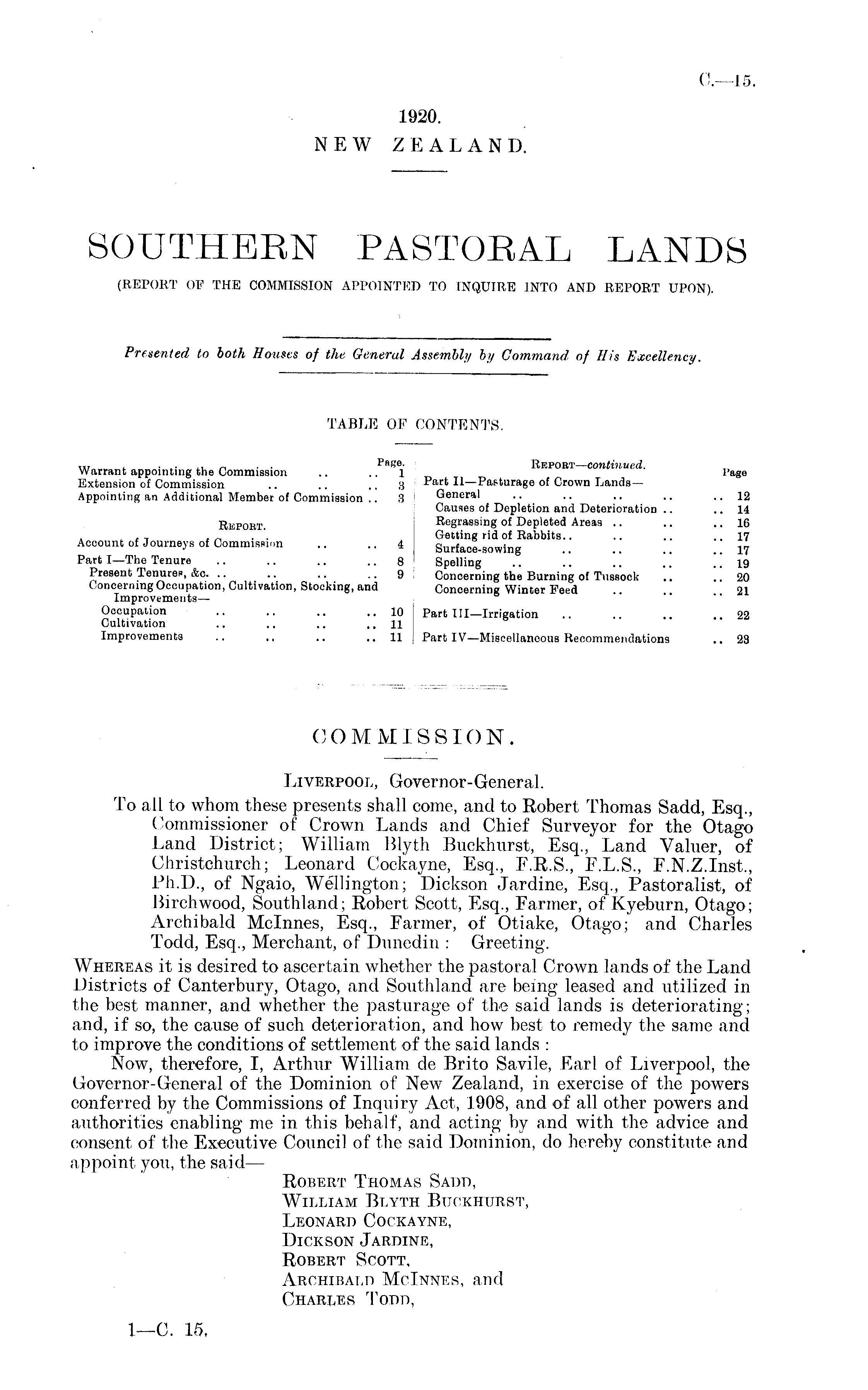 COMMISSION. Liverpool, Govern or-General. To all to whom these presents shall come, and to Robert Thomas Sadd, Esq., Commissioner of Crown Lands and Chief Surveyor for the Otago Land District; William Blyth Buckhurst, Esq., Land Valuer, of Christchurch; Leonard Cockayne, Esq., F.R.S., F.L.S., F.N.Z.lnst., Ph.D., of Ngaio, Wellington; Dickson Jardine, Esq., Pastoralist, of Birchwood, Southland; Robert Scott, Esq., Farmer, of Kyeburn, Otago; Archibald Mclnnes, Esq., Farmer, of Otiake, Otago; and Charles Todd, Esq., Merchant, of Dunedin : Greeting. Whereas it is desired to ascertain whether the pastoral Crown lands of the Land Districts of Canterbury, Otago, and Southland are being leased and utilized in the best manner, and whether the pasturage of the said lands is deteriorating; and, if so, the cause of such deterioration, and how best to remedy the same and to improve the conditions of settlement of the said lands : Now, therefore, I, Arthur William de Brito Savile, Earl of Liverpool, the Governor-General of the Dominion of New Zealand, in exercise of the powers conferred by the Commissions of Inquiry Act, 1908, and of all other powers and authorities enabling me in this behalf, and acting by and with the advice and consent of the Executive Council of the said Dominion, do hereby constitute and appoint you, the said— Robert Thomas Sadd, William Blyth Buckhurst, Leonard Cockayne, Dickson Jardine, Robert Scott, Archibald Mclnnes, and Charges Todd,