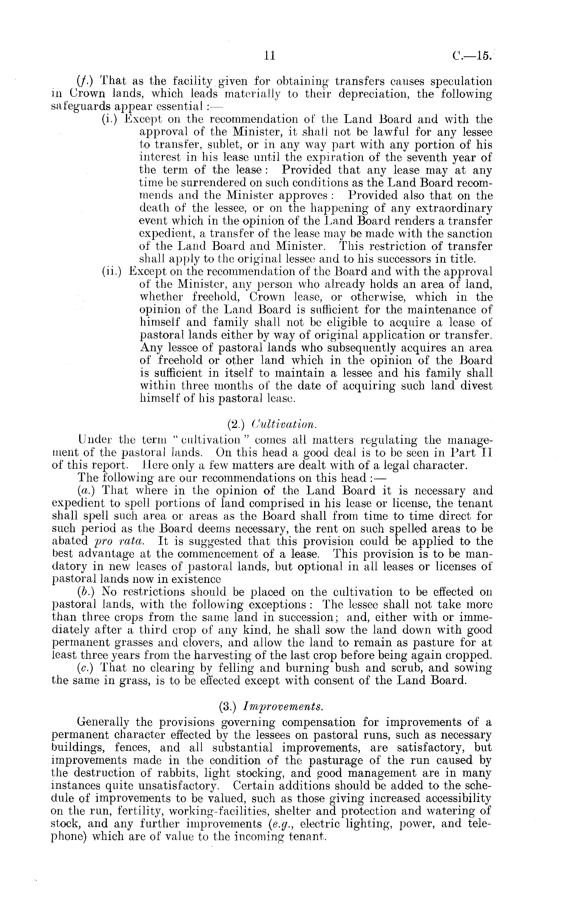 (/.) That as the facility given for obtaining transfers causes speculation in Crown lands, which leads materially to their depreciation, the following safeguards appear essential : — (i.) Except on the recommendation of the Land Board and with the approval of the Minister, it shall not be lawful for any lessee to transfer, sublet, or in any way part with any portion of his interest in his lease until the expiration of the seventh year of the term of the lease : Provided that any lease may at any time be surrendered on such conditions as the Land Board recommends and the Minister approves : Provided also that on the death of the lessee, or on the happening of any extraordinary event which in the opinion of the Land Board renders a transfer expedient, a transfer of the lease may be made with the sanction of the Land Board and Minister. This restriction of transfer shall apply to the original lessee and to his successors in title, (ii.) Except on the recommendation of the Board and with the approval of the Minister, any person who already holds an area of land, whether freehold, Crown lease, or otherwise, which in the opinion of the Land Board is sufficient for the maintenance of himself and family shall not be eligible to acquire a lease of pastoral lands either by way of original application or transfer. Any lessee of pastoral lands who subsequently acquires an area of freehold or other land which in the opinion of the Board is sufficient in itself to maintain a lessee and his family shall within three months of the date of acquiring such land divest himself of his pastoral lease. (2.) (Jultivation. Under the term "cultivation" comes all matters regulating the management of the pastoral lands. On this head a good deal is to be seen in Part II of this report. Here only a few matters are dealt with of a legal character. The following are our recommendations on this head : — (a.) That where in the opinion of the Land Board it is necessary and expedient to spell portions of land comprised in his lease or license, the tenant shall spell such area or areas as the Board shall from time to time direct for such period as the Board deems necessary, the rent on such spelled areas to be abated pro rata. It is suggested that this provision could be applied to the best advantage at the commencement of a lease. This provision is to be mandatory in new leases of pastoral lands, but optional in all leases or licenses of pastoral lands now in existence (b.) No restrictions should be placed on the cultivation to be effected on pastoral lands, with the following exceptions : The lessee shall not take more than three crops from the same land in succession; and, either with or immediately after a third crop of any kind, he shall sow the land down with good permanent grasses and clovers, and allow the land to remain as pasture for at least three years from the harvesting of the last crop before being again cropped. (c.) That no clearing by felling and burning bush and scrub, and sowing the same in grass, is to be effected except with consent of the Land Board. (3.) Improvements. Generally the provisions governing compensation for improvements of a permanent character effected by the lessees on pastoral runs, such as necessary buildings, fences, and all substantial improvements, are satisfactory, but improvements made in the condition of the pasturage of the run caused by the destruction of rabbits, light stocking, and good management are in many instances quite unsatisfactory. Certain additions should be added to the schedule of improvements to be valued, such as those giving increased accessibility on the run, fertility, working-facilities, shelter and protection and watering of stock, and any further improvements (e.g., electric lighting, power, and telephone) which are of value to the incoming tenant.