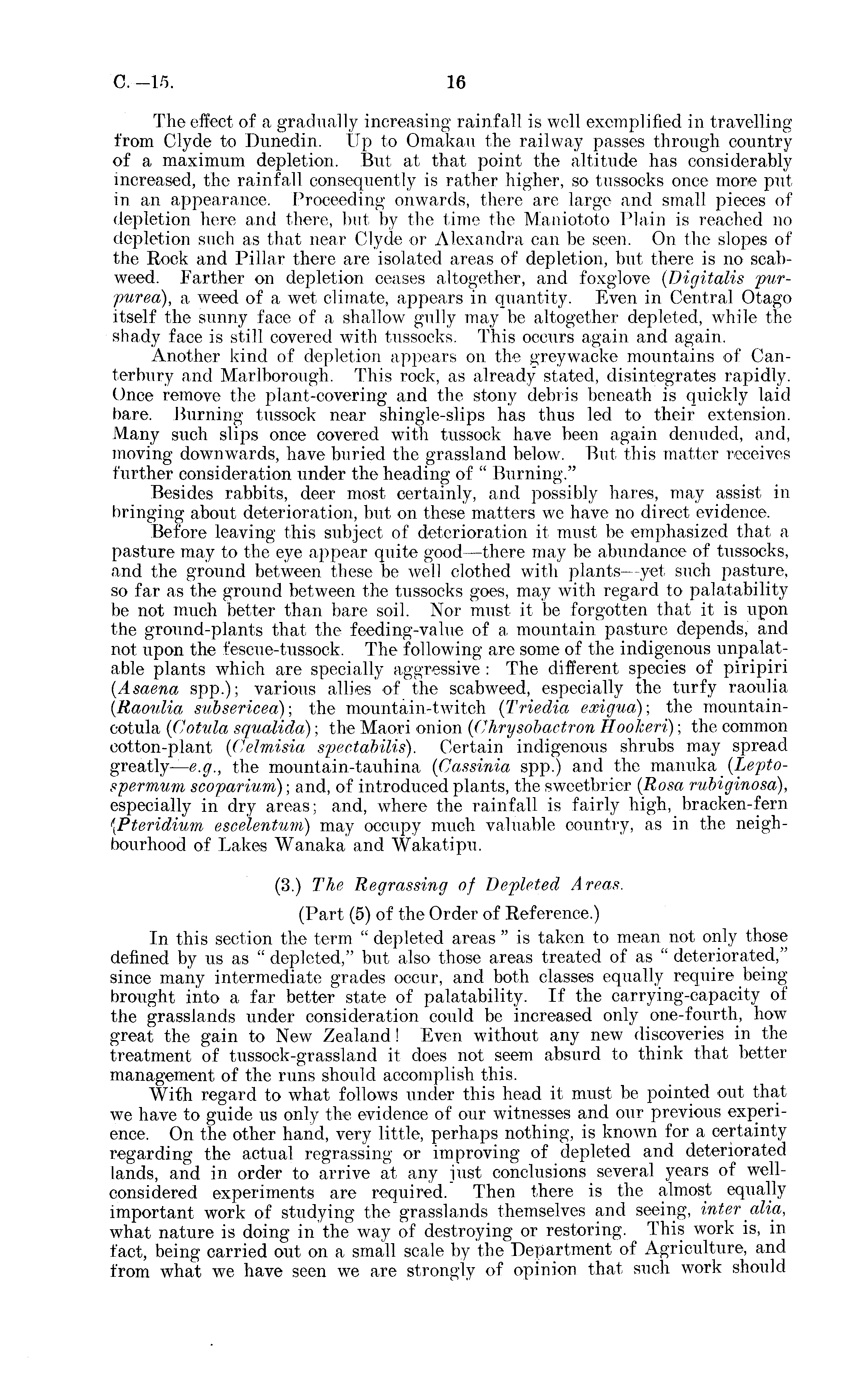 The effect of a gradually increasing rainfall is well exemplified in travelling from Clyde to Dunedin. tip to Omakau the railway passes through country of a maximum depletion. But at that point the altitude has considerably increased, the rainfall consequently is rather higher, so tussocks once more put in an appearance. Proceeding onwards, there are large and small pieces of depletion here and there, but by the time the Maniototo Plain is reached no depletion such as that near Clyde or Alexandra can be seen. On the slopes of the Rock and Pillar there are isolated areas of depletion, but there is no scabweed. Farther on depletion ceases altogether, and foxglove (Digitalis purpurea), a weed of a wet climate, appears in quantity. Even in Central Otago itself the sunny face of a shallow gully may be altogether depleted, while the shady face is still covered with tussocks. This occurs again and again. Another kind of depletion appears on the greywacke mountains of Canterbury and Marlborough. This rock, as already stated, disintegrates rapidly. Once remove the plant-covering and the stony debris beneath is quickly laid bare. Burning tussock near shingle-slips has thus led to their extension. Many such slips once covered with tussock have been again denuded, and, moving downwards, have buried the grassland below. But this matter receives further consideration under the heading of " Burning." Besides rabbits, deer most certainly, and possibly hares, may assist in bringing about deterioration, but on these matters we have no direct evidence. Before leaving this subject of deterioration it must be emphasized that a pasture may to the eye appear quite good—there may be abundance of tussocks, and the ground between these be well clothed with plants —yet such pasture, so far as the ground between the tussocks goes, may with regard to palatability be not much better than bare soil. Nor must it be forgotten that it is upon the ground-plants that the feeding-value of a mountain pasture depends, and not upon the fescue-tussock. The following are some of the indigenous unpalatable plants which are specially aggressive : The different species of piripiri (Asaena spp.); various allies of the scabweed, especially the turfy raoulia (Raoulia subsericea); the mountain-twitch (Triedia exigua); the mountaincotula (Cotula squalida) ; the Maori onion (dhrysobactron Hookeri) ; the common cotton-plant (Celmisia speetabilis). Certain indigenous shrubs may spread greatly—<?.<7., the mountain-tauhina (Cassinia spp.) and the manuka (Leptospermum scoparium) ; and, of introduced plants, the sweetbrier (Rosa rubiginosa), especially in dry areas; and, where the rainfall is fairly high, bracken-fern {Pteridium escelentum) may occupy rmich valuable country, as in the neighbourhood of Lakes Wanaka and Wakatipu. (3.) The Regrassing of Depleted Areas. (Part (5) of the Order of Reference.) In this section the term " depleted areas " is taken to mean not only those defined by us as " depleted," but also those areas treated of as " deteriorated," since many intermediate grades occur, and both classes equally require being brought into a far better state of palatability. If the carrying-capacity of the grasslands under consideration could be increased only one-fourth, how great the gain to New Zealand ! Even without any new discoveries in the treatment of tussock-grassland it does not seem absurd to think that better management of the runs should accomplish this. With regard to what follows under this head it must be pointed out that we have to guide us only the evidence of our witnesses and our previous experience. On the other hand, very little, perhaps nothing, is known for a certainty regarding the actual regrassing or improving of depleted and deteriorated lands, and in order to arrive at any just conclusions several years of wellconsidered experiments are required." Then there is the almost equally important work of studying the grasslands themselves and seeing, inter alia, what nature is doing in the way of destroying or restoring. This work is, in fact, being carried out on a small scale by the Department of Agriculture, and from what we have seen we are strongly of opinion that such work should