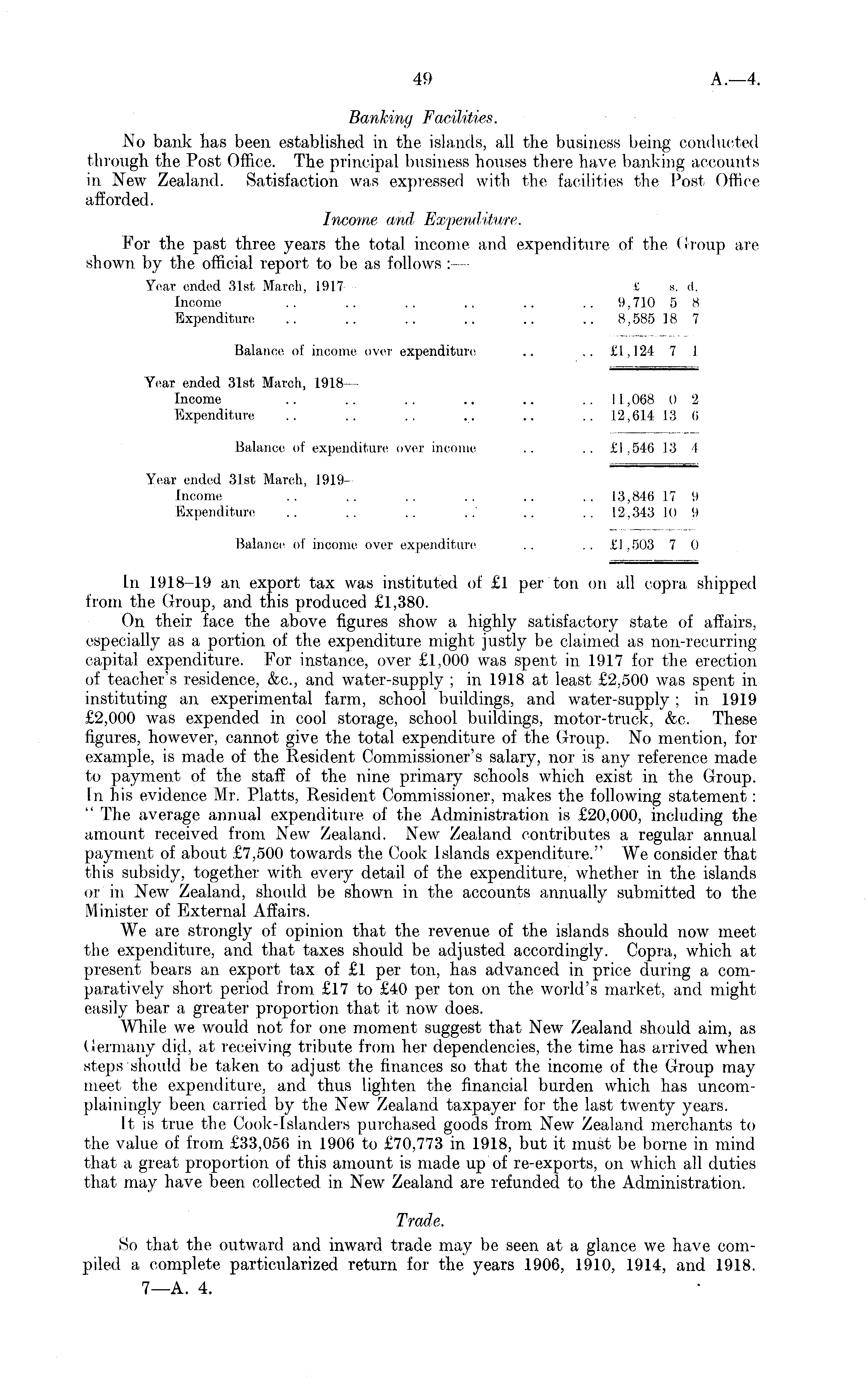 Banking Facilities. No bank has been established in the islands, all the business being conducted through the Post Office. The principal business houses there have banking accounts in New Zealand. Satisfaction was expressed with the facilities the Post Office afforded. Income and Expenditure. For the past three years the total income and expenditure of the Group are shown by the official report to be as follows : — Year ended 31st March, 1917 — £ b. d. Income .. .. .. .. .. .. 9,710 5 8 Expenditure .. .. .. .. .. .. 8,585 18 7 Balance of income over expenditure .. .. £1,124 7 1 Year ended 31st March, 1918— Income .. .. .. .. .. .. 11,068 0 2 Expenditure .. .. .. .. .. .. 12,614 13 6 Balance of expenditure over income .. .. £1,546 13 4 Year ended 31st March, 1919Income .. .. .. .. .. .. 13,846 17 9 Expenditure .. .. .. .. .. .. 12,343 10 9 Balance of income over expenditure .. .. £1,503 7 0 In 1918-19 an export tax was instituted of £l per ton on all copra shipped from the Group, and this produced £1,380. On their face the above figures show a highly satisfactory state of affairs, especially as a portion of the expenditure might justly be claimed as non-recurring capital expenditure. For instance, over £1,000 was spent in 1917 for the erection of teacher's residence, &c, and water-supply ; in 1918 at least £2,500 was spent in instituting an experimental farm, school buildings, and water-supply ; in 1919 £2,000 was expended in cool storage, school buildings, motor-truck, &c. These figures, however, cannot give the total expenditure of the Group. No mention, for example, is made of the Resident Commissioner's salary, nor is any reference made to payment of the staff of the nine primary schools which exist in the Group. In his evidence Mr. Platts, Resident Commissioner, makes the following statement : " The average annual expenditure of the Administration is £20,000, including the amount received from New Zealand. New Zealand contributes a regular annual payment of about £7,500 towards the Cook Islands expenditure." We consider that this subsidy, together with every detail of the expenditure, whether in the islands or in New Zealand, should be shown in the accounts annually submitted to the Minister of External Affairs. We are strongly of opinion that the revenue of the islands should now meet the expenditure, and that taxes should be adjusted accordingly. Copra, which at present bears an export tax of £l per ton, has advanced in price during a comparatively short period from £17 to £40 per ton on the world's market, and might easily bear a greater proportion that it now does. While we would not for one moment suggest that New Zealand should aim, as Germany did, at receiving tribute from her dependencies, the time has arrived when steps should be taken to adjust the finances so that the income of the Group may meet the expenditure, and thus lighten the financial burden which has uncomplainingly been carried by the New Zealand taxpayer for the last twenty years. It is true the Cook-Islanders purchased goods from New Zealand merchants to the value of from £33,056 in 1906 to £70,773 in 1918, but it must be borne in mind that a great proportion of this amount is made up of re-exports, on which all duties that may have been collected in New Zealand are refunded to the Administration. Trade. So that the outward and inward trade may be seen at a glance we have compiled a complete particularized return for the years 1906, 1910, 1914, and 1918.