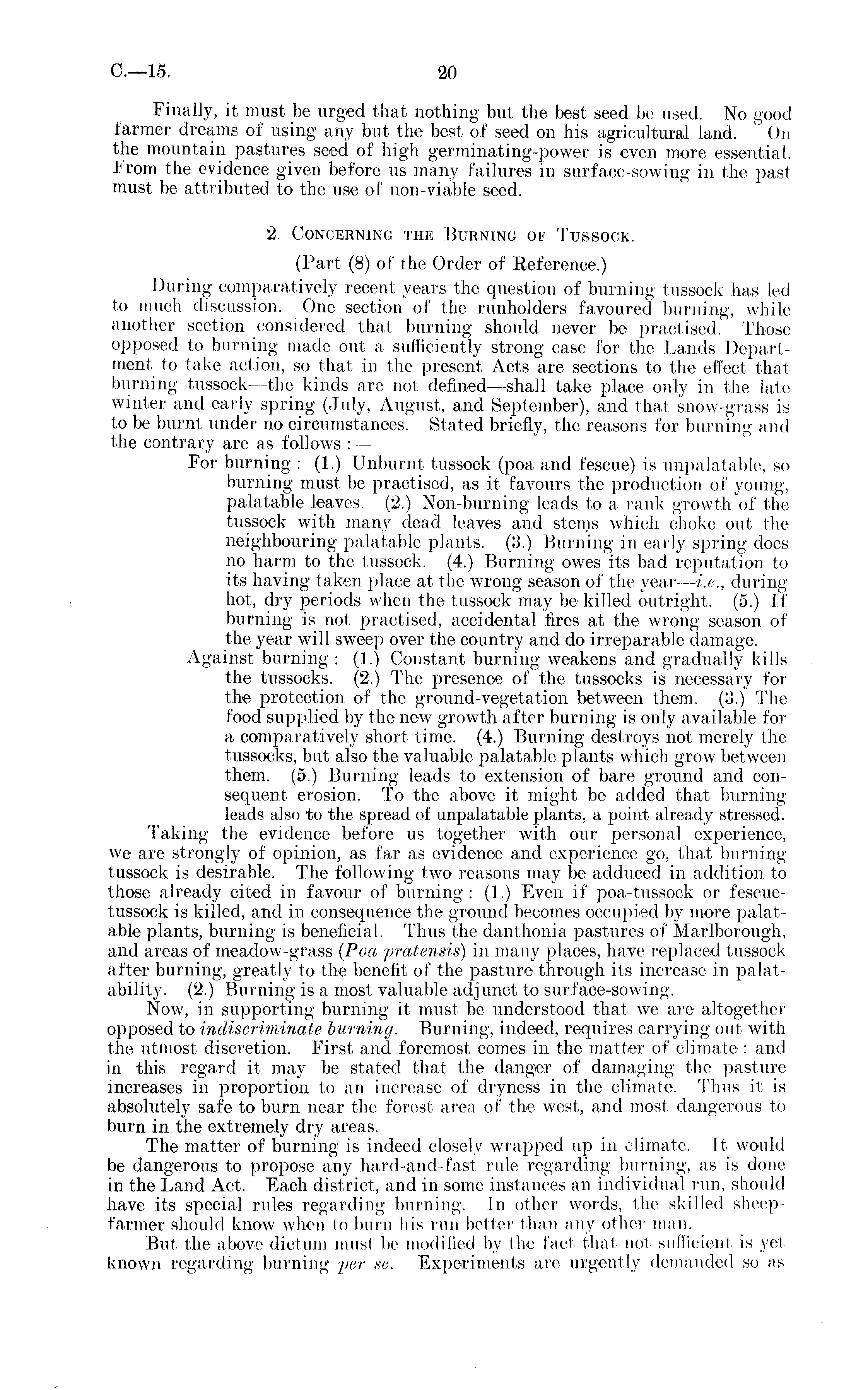 Finally, it must be urged that nothing but the best seed be used. No good farmer dreams of using any but the best of seed on his agricultural land. 'On the mountain pastures seed of high gerininating-power is even more essential. From the evidence given before us many failures in surface-sowing in the past must be attributed to the use of non-viable seed. 2. Concerning the Burning of Tussock. (Part (8) of the Order of Reference.) During comparatively recent years the question of burning tussock has led to much discussion. One section of the riinholders favoured burning, while another section considered that burning should never be practised. Those opposed to burning made out a sufficiently strong case for the Lands Department to take action, so that in the present Acts are sections to the effect that burning tussock—the kinds are not defined —shall take place only in the late winter and early spring (July, August, and September), and that snow-grass is to be burnt under no circumstances. Stated briefly, the reasons for burning and the contrary are as follows :— For burning : (1.) Unburnt tussock (poa and fescue) is unpalatable, so burning must be practised, as it favours the production of young, palatable leaves. (2.) Non-burning leads to a rank growth of the tussock with many dead leaves and steins which choke out the neighbouring palatable plants. (3,) Burning in early spring does no harm to the tussock. (4.) Burning owes its bad reputation to its having taken place at the wrong season of the year— i.e., during hot, dry periods when the tussock may be killed outright. (5.) If burning is not practised, accidental fires at the wrong season of the year will sweep over the country and do irreparable damage. Against burning : (1.) Constant burning weakens and gradually kills the tussocks. (2.) The presence of the tussocks is necessary for the protection of the ground-vegetation between them. (3.) The food supplied by the new growth after burning is only available for a comparatively short time. (4.) Burning destroys not merely the tussocks, but also the valuable palatable plants which grow between them. (5.) Burning leads to extension of bare ground and consequent erosion. To the above it might be added that burning leads also to the spread of unpalatable plants, a point already stressed. Taking the evidence before us together with our personal experience, we are strongly of opinion, as far as evidence and experience go, that burning tussock is desirable. The following two reasons may be adduced in addition to those already cited in favour of burning : (1.) Even if poa-tussock or fescuetussock is killed, and in consequence the ground becomes occupied by more palatable plants, burning is beneficial. Thus the danthonia pastures of Marlborough, and areas of meadow-grass {Poa pratensis) in many places, have replaced tussock after burning, greatly to the benefit of the pasture through its increase in palatability. (2.) Burning is a most valuable adjunct to surface-sowing. Now, in supporting burning it must be understood that we are altogether opposed to indiscriminate burning. Burning, indeed, requires carrying out with the utmost discretion. First and foremost comes in the matter of climate : and in this regard it may be stated that the danger of damaging the pasture increases in proportion to an increase of dryness in the climate. Thus it is absolutely safe to burn near the forest area of the west, and most dangerous to burn in the extremely dry areas. The matter of burning is indeed closely wrapped up in climate. It would be dangerous to propose any hard-and-fast rule regarding burning, as is done in the Land Act. Each district, and in some instances an individual run, should have its special rules regarding burning. In other words, the skilled sheepfarmer should know when to burn his run better than any oilier man. But the above dictum must be modified by the fact that not sufficient is yet known regarding burning per Sβ. Experiments are urgently demanded so as