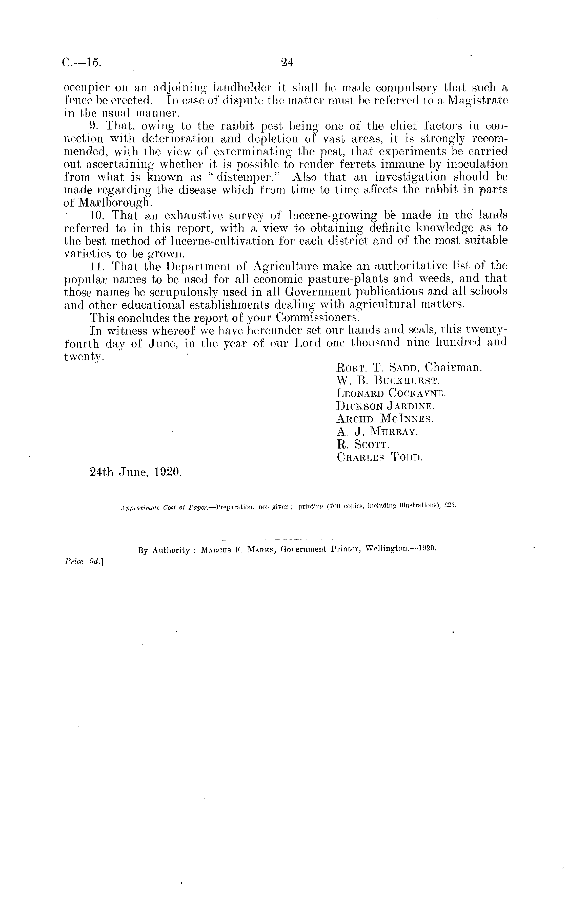 occupier on an adjoining , landholder it shall be made compulsory that such a Pence be erected. In case of dispute th-e matter must be referred to a Magistrate in the usual manner. 9. That, owing to the rabbit pest being one of the chief factors in connection with deterioration and depletion of vast areas, it is strongly recommended, with the view of exterminating the pest, that experiments be carried out ascertaining whether it is possible to render ferrets immune by inoculation from what is known as " distemper." Also that an investigation should be made regarding the disease which from time to time affects the rabbit in parts of Marlborough. 10. That an exhaustive survey of lucerne-growing be made in the lands referred to in this report, with a view to obtaining definite knowledge as to the best method of lucerne-cultivation for each district and of the most suitable varieties to be grown. 11. That the Department of Agriculture make an authoritative list of the popular names to be used for all economic pasture-plants and weeds, and that those names be scrupulously used in all Government publications and all schools and other educational establishments dealing with agricultural matters. This concludes the report of your Commissioners. In witness whereof we have hereunder set our hands and seals, this twentyfourth day of June, in the year of our Lord one thousand nine hundred and twenty. Bobt. T. Sattd, Chairman. W. B. Btjckhurst. Leonard Cockayne. Dickson Jardine. Archd. Mclnnes. A. J. Murray. R. Scott. Charles Tom). 24th June, 1920.