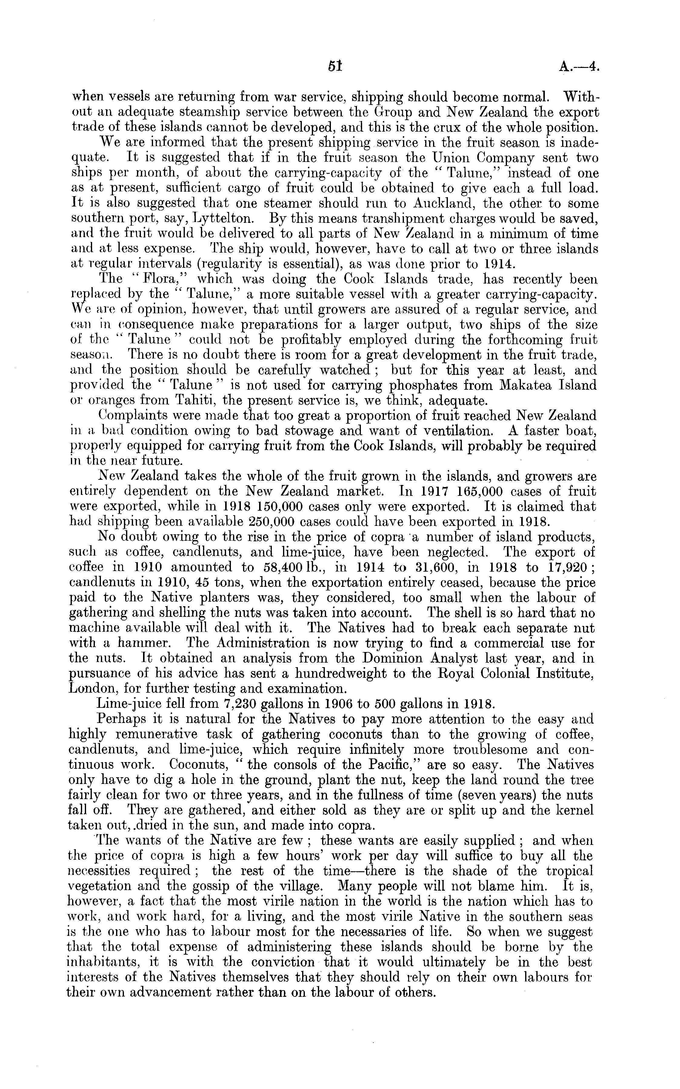 when vessels are returning from war service, shipping should become normal. Without an adequate steamship service between the Group and New Zealand the export trade of these islands cannot be developed, and this is the crux of the whole position. We are informed that the present shipping service in the fruit season is inadequate. It is suggested that if in the fruit season the Union Company sent two ships per month, of about the carrying-capacity of the " Talune," instead of one as at present, sufficient cargo of fruit could be obtained to give each a full load. It is also suggested that one steamer should run to Auckland, the other to some southern port, say, Lyttelton. By this means transhipment charges would be saved, and the fruit would be delivered to all parts of New Zealand in a minimum of time and at less expense. The ship would, however, have to call at two or three islands at regular intervals (regularity is essential), as was done prior to 1914. The " Flora," which was doing the Cook Islands trade, has recently been replaced by the " Talune," a more suitable vessel with a greater carrying-capacity. We are of opinion, however, that until growers are assured of a regular service, and can in consequence make preparations for a larger output, two ships of the size of the " Talune " could not be profitably employed during the forthcoming fruit season. There is no doubt there is room for a great development in the fruit trade, and the position should be carefully watched ; but for this year at least, and provided the " Talune " is not used for carrying phosphates from Makatea Island or oranges from Tahiti, the present service is, we think, adequate. Complaints were made that too great a proportion of fruit reached New Zealand in a bad condition owing to bad stowage and want of ventilation. A faster boat, properly equipped for carrying fruit from the Cook Islands, will probably be required in the near future. New Zealand takes the whole of the fruit grown in the islands, and growers are entirely dependent on the New Zealand market. In 1917 165,000 cases of fruit were exported, while in 1918 150,000 cases only were exported. It is claimed that had shipping been available 250,000 cases could have been exported in 1918. No doubt owing to the rise in the price of copra a number of island products, such as coffee, candlenuts, and lime-juice, have been neglected. The export of coffee in 1910 amounted to 58,400 lb., in 1914 to 31,600, in 1918 to 17,920; candlenuts in 1910, 45 tons, when the exportation entirely ceased, because the price paid to the Native planters was, they considered, too small when the labour of gathering and shelling the nuts was taken into account. The shell is so hard that no machine available will deal with it. The Natives had to break each separate nut with a hammer. The Administration is now trying to find a commercial use for the nuts. It obtained an analysis from the Dominion Analyst last year, and in pursuance of his advice has sent a hundredweight to the Royal Colonial Institute, London, for further testing and examination. Lime-juice fell from 7,230 gallons in 1906 to 500 gallons in 1918. Perhaps it is natural for the Natives to pay more attention to the easy and highly remunerative task of gathering coconuts than to the growing of coffee, candlenuts, and lime-juice, which require infinitely more troublesome and continuous work. Coconuts, " the consols of the Pacific," are so easy. The Natives only have to dig a hole in the ground, plant the nut, keep the land round the tree fairly clean for two or three years, and in the fullness of time (seven years) the nuts fall off. They are gathered, and either sold as they are or split up and the kernel taken out, .dried in the sun, and made into copra. The wants of the Native are few ; these wants are easily supplied ; and when the price of copra is high a few hours' work per day will suffice to buy all the necessities required ; the rest of the time —there is the shade of the tropical vegetation and the gossip of the village. Many people will not blame him. It is, however, a fact that the most virile nation in the world is the nation which has to work, and work hard, for a living, and the most virile Native in the southern seas is the one who has to labour most for the necessaries of life. So when we suggest that the total expense of administering these islands should be borne by the inhabitants, it is with the conviction that it would ultimately be in the best interests of the Natives themselves that they should rely on their own labours for their own advancement rather than on the labour of others.