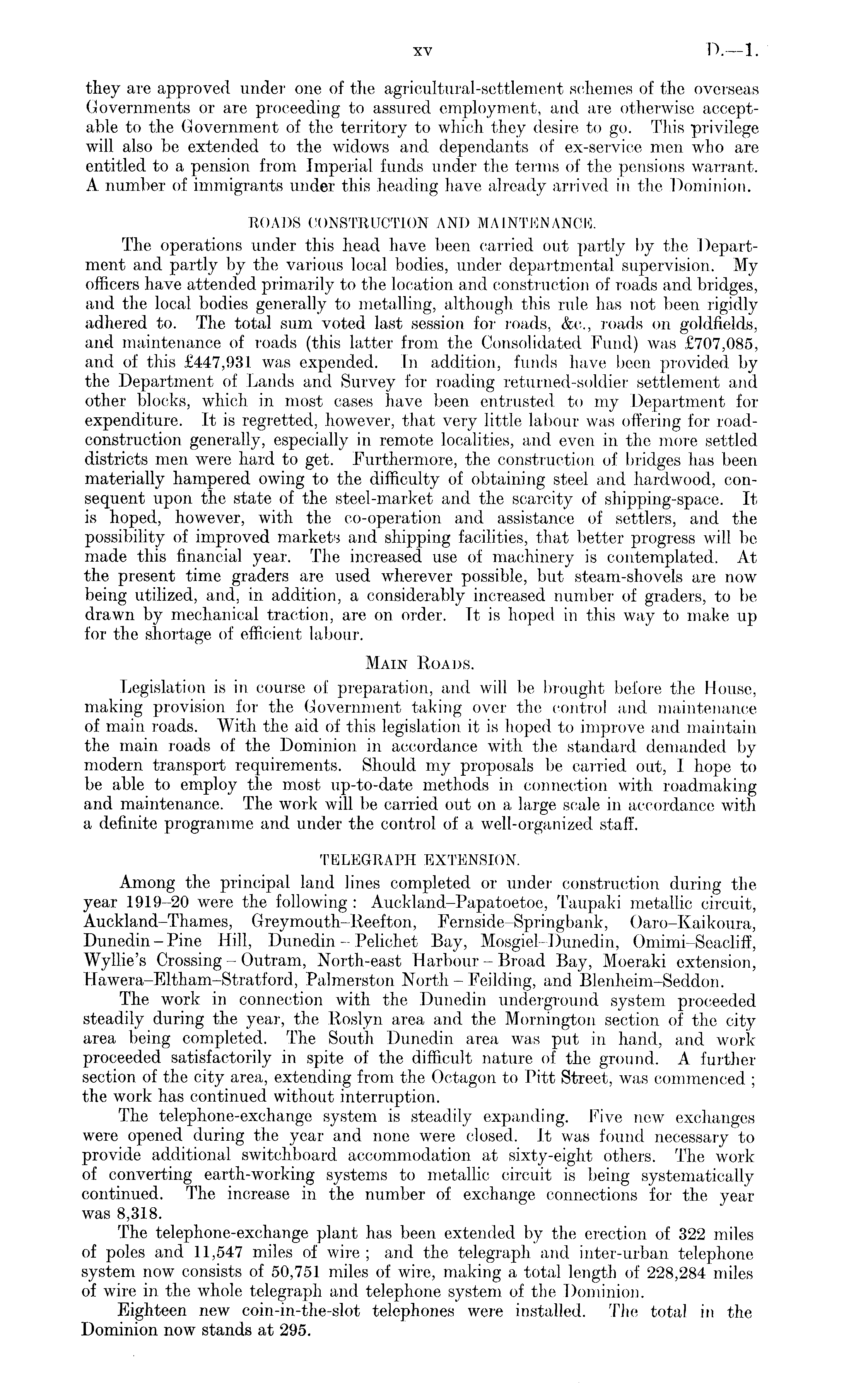they are approved under one of the agricultural-settlement schemes of the overseas Governments or are proceeding to assured employment, and are otherwise acceptable to the Government of the territory to which they desire to go. This privilege will also be extended to the widows and dependants of ex-service men who are entitled to a pension from Imperial funds under the terms of the pensions warrant. A number of immigrants under this heading have already arrived in the Dominion. EOADS CONSTRUCTION AND MAINTENANCE. The operations under this head have been carried out partly by the Department and partly by the various local bodies, under departmental supervision. My officers have attended primarily to the location and construction of roads and bridges, and the local bodies generally to metalling, although this rule has not been rigidly adhered to. The total sum voted last session for roads, &c, roads on goldfields, and maintenance of roads (this latter from the Consolidated Fund) was £707,085, and of this £447,931 was expended. In addition, funds have been provided by the Department of Lands and Survey for roading returned-soldier settlement and other blocks, which in most cases have been entrusted to my Department for expenditure. It is regretted, however, that very little labour was offering for roadconstruction generally, especially in remote localities, and even in the more settled districts men were hard to get. Furthermore, the construction of bridges has been materially hampered owing to the difficulty of obtaining steel and hardwood, consequent upon the state of the steel-market and the scarcity of shipping-space. It is hoped, however, with the co-operation and assistance of settlers, and the possibility of improved markets and shipping facilities, that better progress will be made this financial year. The increased use of machinery is contemplated. At the present time graders are used wherever possible, but steam-shovels are now being utilized, and, in addition, a considerably increased number of graders, to be drawn by mechanical traction, are on order. It is hoped in this way to make up for the shortage of efficient labour. Main Roads. Legislation is in course of preparation, and will be brought before the House, making provision for the Government taking over the control and maintenance of main roads. With the aid of this legislation it is hoped to improve and maintain the main roads of the Dominion in accordance with the standard demanded by modern transport requirements. Should my proposals be carried out, I hope to be able to employ the most up-to-date methods in connection with roadmaking and maintenance. The work will be carried out on a large scale in accordance with a definite programme and under the control of a well-organized staff. TELEGRAPft EXTENSION. Among the principal land lines completed or under construction during the year 1919-20 were the following : Auckland-Papatoetoe, Taupaki metallic circuit, Auckland-Thames, Greymouth-Reefton, Fernside-Springbank, Oaro-Kaikoura, Dunedin - Pine Hill, Dunedin - Pelichet Bay, Mosgiel Dunedin, Omimi-Seacliff, Wyllie's Crossing - Outram, North-east Harbour - Broad Bay, Moeraki extension, Hawera-Eltham-Stratford, Palmerston North - Feilding, and Blenheim-Seddon. The work in connection with the Dunedin underground system proceeded steadily during the year, the Roslyn area and the Mornington section of the city area being completed. The South Dunedin area was put in hand, and work proceeded satisfactorily in spite of the difficult nature of the ground. A further section of the city area, extending from the Octagon to Pitt Street, was commenced ; the work has continued without interruption. The telephone-exchange system is steadily expanding. Five new exchanges were opened during the year and none were closed. It was found necessary to provide additional switchboard accommodation at sixty-eight others. The work of converting earth-working systems to metallic circuit is being systematically continued. The increase in the number of exchange connections for the year was 8,318. The telephone-exchange plant has been extended by the erection of 322 miles of poles and 11,547 miles of wire ; and the telegraph and inter-urban telephone system now consists of 50,751 miles of wire, making a total length of 228,284 miles of wire in the whole telegraph and telephone system of the Dominion. Eighteen new coin-in-the-slot telephones were installed. The total in the Dominion now stands at 295.