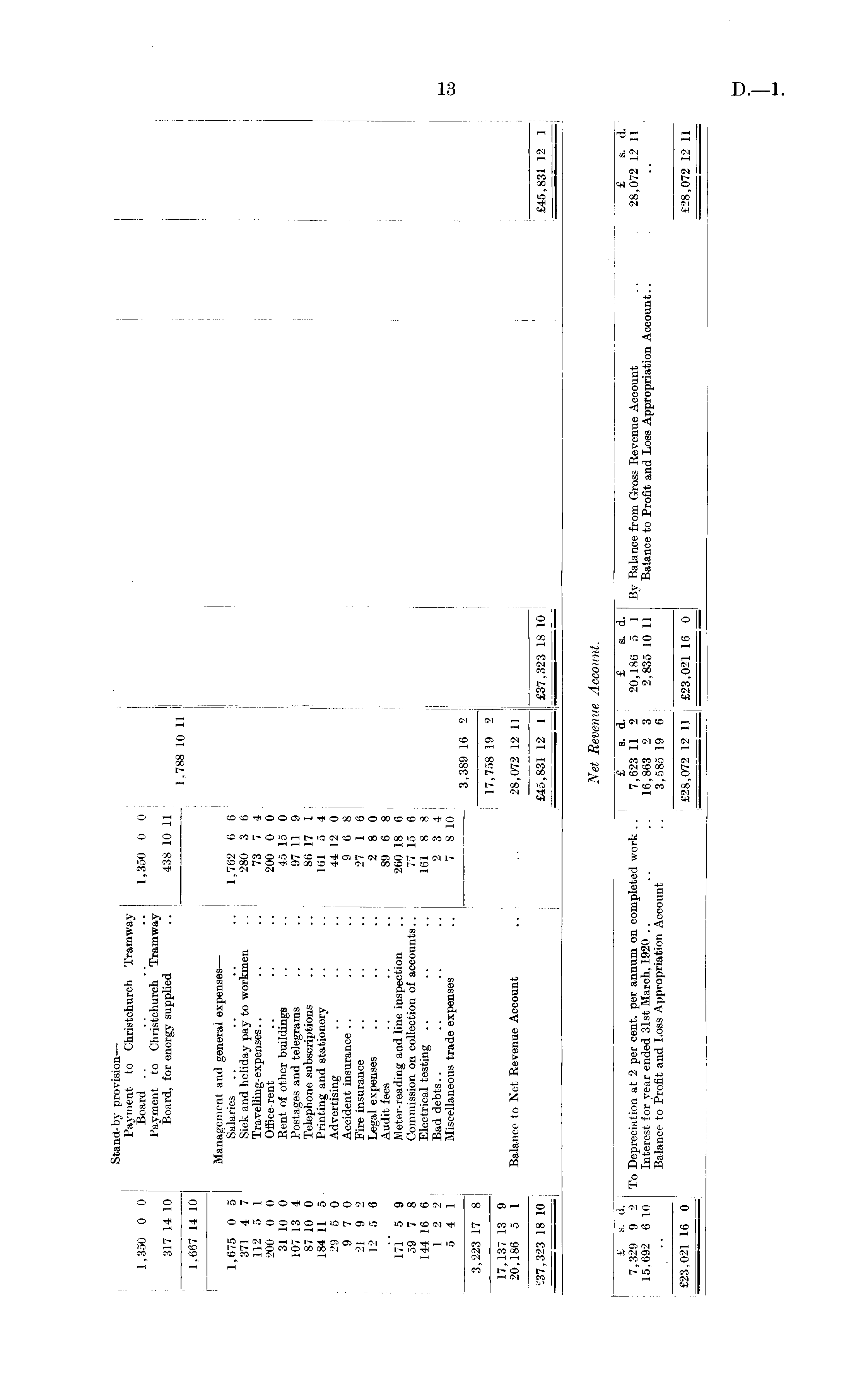 1,350 0 0 317 14 10 1,667 14 10 1,675 0 5 371 4 7 112 5 1 200 0 0 31 10 0 107 13 4 87 10 0 184 11 5 29 5 0 9 7 0 21 9 2 12 5 6 171 5 9 59 7 8 144 16 6 12 2 5 4 1 Stand-by provision — Payment to Christchurch Tramway Board .. .. .. .. 1,350 0 0 Payment to Christchurch Tramway Board, for energy supplied .. 438 10 11 — 1,788 10 11 Management and general expenses — Salaries .. .. .. .. 1,762 6 6 Sick and holiday pay to workmen .. 280 3 6 Travelling-expenses.. .. .. 73 7 4 Office-rent .. .. .. 200 0 0 Rent of other buildings .. .. 45 15 0 Postages and telegrams .. .. 97 11 9 Telephone subscriptions .. .. 86 17 1 Printing and stationery .. .. 161 5 4 Advertising .. .. .. 44 12 0 Accident insurance .. .. .. 9 6 8 Fire insurance .. .. .. 27 1 6 Legal expenses .. .. .. 2 8 0 Audit fees .. .. .. 89 6 8 Meter-reading and line inspection .. 260 18 6 Commission on collection of accounts.. 77 15 6 Electrical testing .. .. .. 161 8 8 Bad debts.. .. .. .. 2 3 4 Miscellaneous trade expenses .. 7 8 10 3,223 17 8 17,137 13 9 20,186 5 1 18 10 3OQQ ] ft i> a O0*7 1U — 17,758 19 2 Balance to Net Revenue Account .. .. 28,072 12 11 £45,831 12 1 i £37,323 : 18 10 I £37,323 18 10 i £45,831 12 1 Net Revenue Account. £ s. d. 7,329 9 2 15.692 6 10 To Depreciation at 2 per cent, per annum on completed work .. Interest for year ended 31st Match, 1920 Balance to Profit and Loss Appropriation Account £ s. d. 7,623 11 2 16,863 2 3 3,585 19 6 £ s. d. 20,186 5 1 2,835 10 11 By Balance from Gross Revenue Account Balance to Profit and Loss Appropriation Account.. £ s. d. 28,072 12 11 £23,021 16 0 £28,072 12 11 J! £23,021 16 0 £28,072 12 11