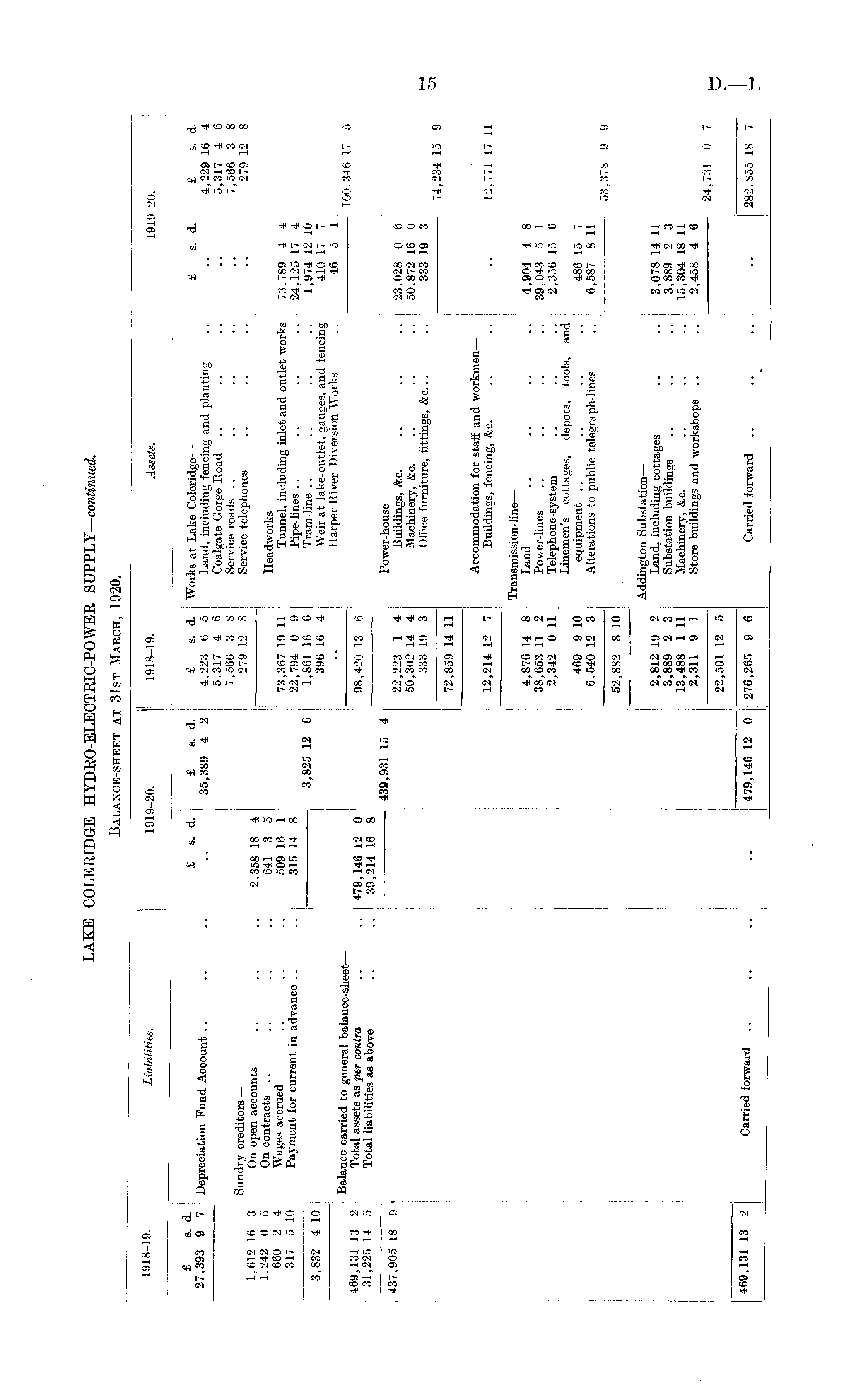 iwi»-i». Liabilities. 1918-19. Liabilities. 1919-20. 1918-19. Assets. 1919-20. 1919-20. 1918-19. Assets. i " ' ~~ ; ~~ ■ — . — ~— £ s. d. 27,393 9 7 Depreciation Fund Account .. Sundry creditors — 1,612 16 3 On open accounts 1.242 0 5 On contracts 660 2 4 Wages accrued 31" 5 10 Payment for current in advance .. 3,832 4 10 Balance carried to general balance-sheet — +69,131 13 2 Total assets as per contra 31,225 14 5 Total liabilities as above 437,905 18 9 £ s. d. j £ s. d. £ s. d. Works at Lake Coleridge— £ s. d. £ s. d. 35,389 4 2 4,223 6 5 Land, including fencing and planting .. .. 4,229 16 4 5,317 4 6 Coalgate Gorge Road .. .. .. .. 5,317 4 6 7,566 3 8 Service roads .. .. .. .. .. 7,566 3 8 279 12 8 Service telephones .. .. .. .. 279 12 8 2,358 18 4 — 641 3 5 Headworks— 509 16 1 73,367 19 11 Tunnel, including inlet and outlet works 73.789 4 4 315 14 8 22,794 0 9 Pipe-lines.. .. .. .. 24,125 17 4 3,825 12 6 1,86116 6 Tram-line .. .. .. .. 1,974 12 10 396 16 4 Weir at lake-outlet, gauges, and fencing 410 17 7 Harper River Diversion Works .. 46 j 4 100.346 17 5 .. 479,146 12 0 98,420 13 6 39,214 16 8 — 439,931 15 4 Power-house— 22,223 1 4 Buildings, &c. .. .. .. 23,028 0 6 50,302 14 4 Machinery, &e. .. .. .. 50,872 16 0 333 19 3 Office furniture, fittings, &c... .. 333 19 3 74,234 15 9 72,859 14 11 11 [ ' Accommodation for staff and workmen — 12,214 12 7 Buildings, fencing, &c. .. .. .. 12,771 17 11 Transmission-line — 4,876 14 8 Land .. .. .. .. 4,904 4 8 38,653 11 2 Power-lines .. .. .. .. 39,043 5 1 2,342 0 11 Telephone-system .. .. .. 2,356 15 6 Linemen's cottages, depots, tools, and 469 9 10 equipment .. .. .. .. 486 15 7 6,540 12 3 Alterations to public telegraph-lines .. 6,587 8 11 — 53,378 9 9 52,882 8 10 , Addington Substation — 2,812 19 2 Land, including cottages .. .. 3,078 14 11 3,889 2 3 Substation buildings .. .. .. 3,889 2 3 13,488 111 Machinery, &c. .. .. .. 15,304 18 11 2,311 9 1 Store buildings and workshops .. .. 2,458 4 6 ■ — 24,731 0 7 22,501 12 5 2,812 19 2 3,889 2 3 13,488 1 11 2,311 9 1 22,501 12 5 469,131 13 2 Carried forward .. 479,146 12 0 276,265 9 6 Carried forward .. .. .. .. 282, S55 18 7 479,146 12 0 276,265 9 6