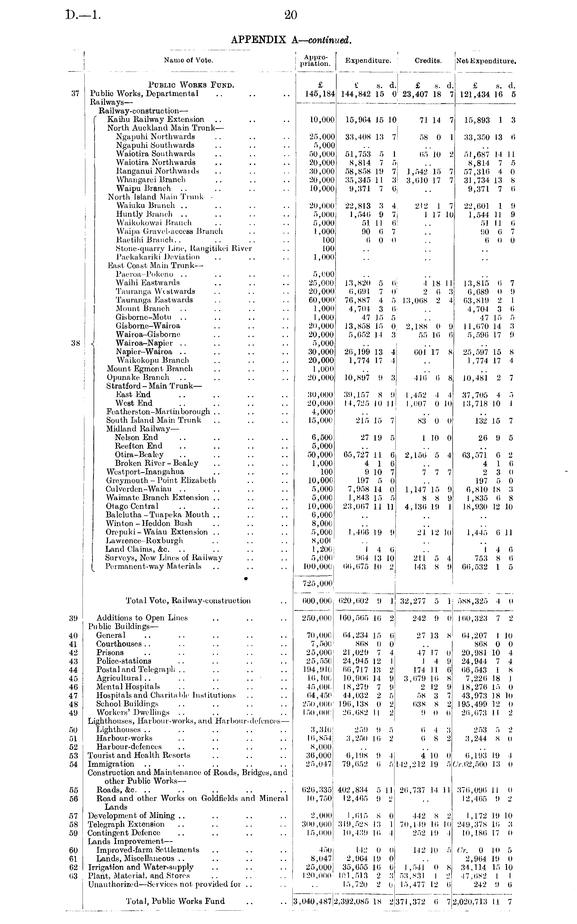 Name of Vote. Appropriation. Expenditure. ■ Credits. Net Expenditure. Public Woeks Fund. Public Works, Departmental Railways— Railway-construction— Kaihu Railway Extension North Auckland Main Trunk— Ngapuhi Northwards Ngapuhi Southwards Waiotira Southwards Waiotira Northwards Ranganui Northwards Whangarei Branch Waipu Branch North Island Main Trunk — Waiuku Branch Huntly Brunch .. VVaikokowai Braiioh Waipa Gravcl-acocss Branch Raetihi Branch .. Stone-quarry Line, Raugitikei River Faekakariki Deviation East Coast Main Trunk— Paeroa-Pokeno Waihi Eastwards Tauranga Westwards Tauranga Eastwards Mount Branch Gisborne-Motu Gisborne-Wairoa Wairoa-Gisborn(! Wairoa-Napier .. Napier-Wairoa Waikokopu Branch Mount Egmonl Branch Opunake Branch Stratford-Main Trunk — East End West End Featherston-Martinborough South Island Main Trunk Midland Railway— Nelson End Reefton End Otira-Bealey Broken River - Boaley Westport-Inangahua Greymouth - Point Elizabeth Culverden-Waiau .• Waimatc Branch Extension Otago Central Balclutha -Tiiapeka Mouth .. Winton - Heddon Bush Orepuki-Waiau Extension .. Lawrence-Roxburgh Land Claims, &c. Surveys, New Lines of Railway Permanent-way Materials £ 145,184 .£ s. d. £ s. d 144,842 15 0 23,407 18 7 £ s. d. 121,434 16 5 37 10,000 15,904 15 10, 71 14 7 33,408 13 7 58 0 1 15,893 1 3 25,000 5,000 50,000 20,000 30,000 20,000 10,000 51,753 5 I 65 10 2 8,814 7 5| 58,858 19 7 1,542 15 7 35,345 11 3 3,010 17 7 9,871 7 6 33,330 13 (i 5J,687 14 II 8,814 7 5 57,310 4 0 31,734 II! 8 9,371 7 0 20,000 5,000 5,000 1,000 100 100 1,000 22,813 3 4 212 1 7 1,540 9 7 1 17 10 51 11 6 90 0 7 0 0 (I 22,601 1 () 1,544 11 9 51 11 0 90 0 7 (i 0 0 5,000 25,000 20,000 60,000 1,000 1,000 20,000 20,000 5,000 30,000 20,000 1,000 20,000 13,820 5 6 4 18 II 0,091 7 0 2 0 3 70,887 4 5 13,008 2 4 4,704 3 0 47 J 5 5 .13,858 15 0, 2,188 0 9 5,052 14 3 55 10 0 13,815 6 7 0,089 0 !) 03,819 2 I 4,704 3 0 47 15 5 11,070 14 3 5,590 17 9 38 20,199 13 4 001 17 8 1,774 17 4 25,597 15 8 1,774 17 4 IO,S97 9 3 410 0 8 10,481 2 7 30,000 20,000 4,000 15,000 39,157 8 9 1,452 4 4 14,725 10 11 1,007 0 10 37,705 4 5 1.3,718 10 1 21 f> J 5 7 83 0 0 132 15 7 6,500 5,000 50,000 1 ,00(1 100 10,000 5,000 J 5,000 10,000 0,000 8,000 5,000 8,00( 1,200 5,000 100,000 27 19 5 1 10 0 20 9 5 65,727 11 6 2,150 5 4 4 16 9 10 7 7 7 7 197 5 0 7,958 14 0 1,147 15 9 1,843 15 5 8 8 9 23,007 J J II 4,130 19 I C)3,571 (> 2 4 I (i 2 3 0 197 5 0 0,810 18 3 1,835 0 8 18,930 12 10 1,406 19 9 2i'l2 10 1,445 0 11 110 i>01 13 10 211 5 4 00,075 10 2 143 8 9 1 4 0 753 8 0 00,532 1 5 • 725,000 Total Vote, Railway-construction 000,000 020,002 9 1 32,277 5 1 588,325 4 0 39 HI 41 11> 43 44 45 46 47 is 49 50 51 52 53 54 Additions to Open Lines Public Buildings— General Courthouses Prisons Police-stations Postal and Telegraph .. Agricultural.. .. .. Mental Hospitals Hospitals and Charitable Institutions School Buildings Workers' Dwellings Lighthouses, Harbour-works, and Harbour-defences — Lighthouses Harbour-works Harbour-defences Tourist and Health Resorts Immigration Construction and Maintenance of Roads, Bridges, and other Public Works — Roads, &c. Road and other Works on Goldfields and Mineral Lands Development of Mining Telegraph Extension Contingent Defence Lands Improvement— Improved-farm Settlements Lands, Miscellaneous Irrigation and Water-supply Plant, Material, and Stores Unauthorized —Services not provided for 250,000 100,505 10 2 70.000 04,234 .15 0 7,500 80S 0 0 25,000 21,029 7 4 25,550 24,945 12 I 194,910 00,717 13 2 10, KM, 10,906 J4 9 15.001 IS, 27!) 7 i) 64,450 44,032 2 5 250,000 196,138 0 2 L50,00< 26,682 II. 2 3,310 259 !) 5 16,854 3,25(1 10 2 8,000; 36,000 6,198 !l -4 25,047 79,052 0 B 242 9 0 27 13 S 47 17 0 I 4 9 174 II 0 3,079 10 S 2 12 9 58 3 7 688 8 2 9 0 0 (i 4 3 0 8 2 4 10 0 142,212 19 5 242 9 0 27 13 S 47 17 0 I 4 9 174 II 0 3,079 10 8 2 12 9 58 3 7 688 8 2 9 0 0 Kit), 323 7 2 04,207 I 1(1 808 0 0 20,981 10 4 24,944 7 4 (10,543 I 8 7,220 18 I IS,270 15 0 43,973 IS 1(1 195,499 12 0 20,073 I I 2 253 5 2 3,244 S (I 0,193 19 I Cr, 62,560 13 0 55 56 020,335 402,834 5 11 10,760 12,405 9 2 20,737 14 11 370,0<)0 I I (I 12,405 9 2 57 58 59 2,000 1.015 8 0 300,0(10 319,528 13 I 15,000 10,439 10 -I 442 8 2 70,149 10 in 252 1!) I 1,172 lit 10 249,378 Hi 3 10,180 17 0 0(1 01 82 03 450 142 0 o 8,047 2,964 19 0 25,000 35,055 10 0 120,00(1 101,513 2 3 15,720 2 0 14 2 10 5 I ,541 0 8 53,831 I :' L6, 177 12 o Gr. 0 10 5 2,904 19 0 34,114 15 10 47,082 1 1 242 !) 0 Total, Public Works Fund 3,040,487 2,392,085 18 2: 371,372 0 7 2,392,085 18 2 371,372 (i 7 2,020,713 11 7