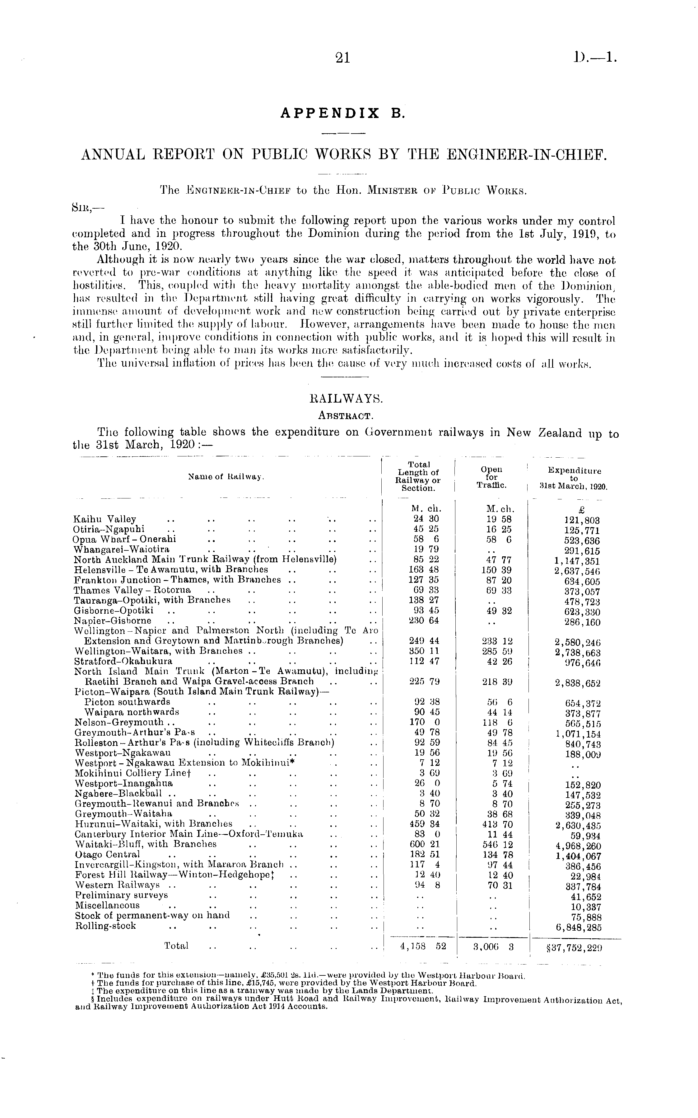 APPENDIX B. ANNUAL REPORT ON PUBLIC WORKS BY THE ENGINEER-IN-CHIEF. The Engtneer-in-Ohief to the Hon. Minister of Public Works. Sir, — I have the honour to submit the following report upon the various works under my control completed and in progress throughout the Dominion during the period from the Ist July, 1919, to the 30th June, 1920. Although it is now nearly two years since the war closed, matters throughout the world have not reverted to pre-war conditions a 1 anything like the speed it was anticipated before the close of hostilities. This, coupled with the heavy mortality amongst the able-bodied men of the Dominion, lots resulted in the Department still having great difficulty in carrying on works vigorously. The immense amount of development work and new construction being carried out by private enterprise still further limited the supply of labour. However, arrangements Lave been made to house the men and, in general, improve conditions in connection with public works, and it is hoped this will result in the Department being able to man its works more satisfactorily. The universal inflation of prices has been the cause of very much increased costs of all works. EAILWAYS. Abstract. The following table shows the expenditure on Government railways in New Zealand up to the 31st March, 1920 :—