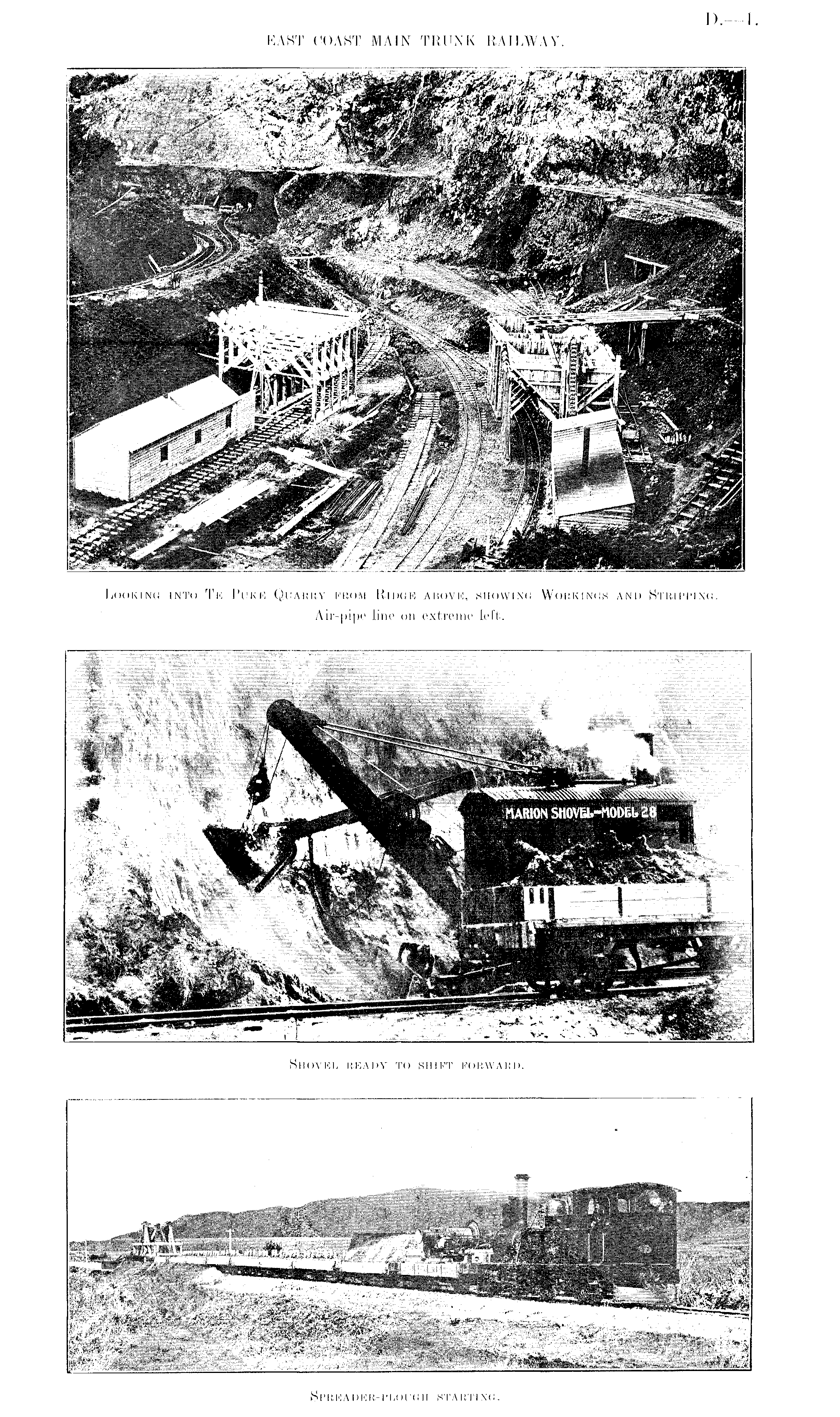 Looking into Te Puke Quarry from Ridge above, showing Workings and Stripping. Air-pipe line on extreme left.