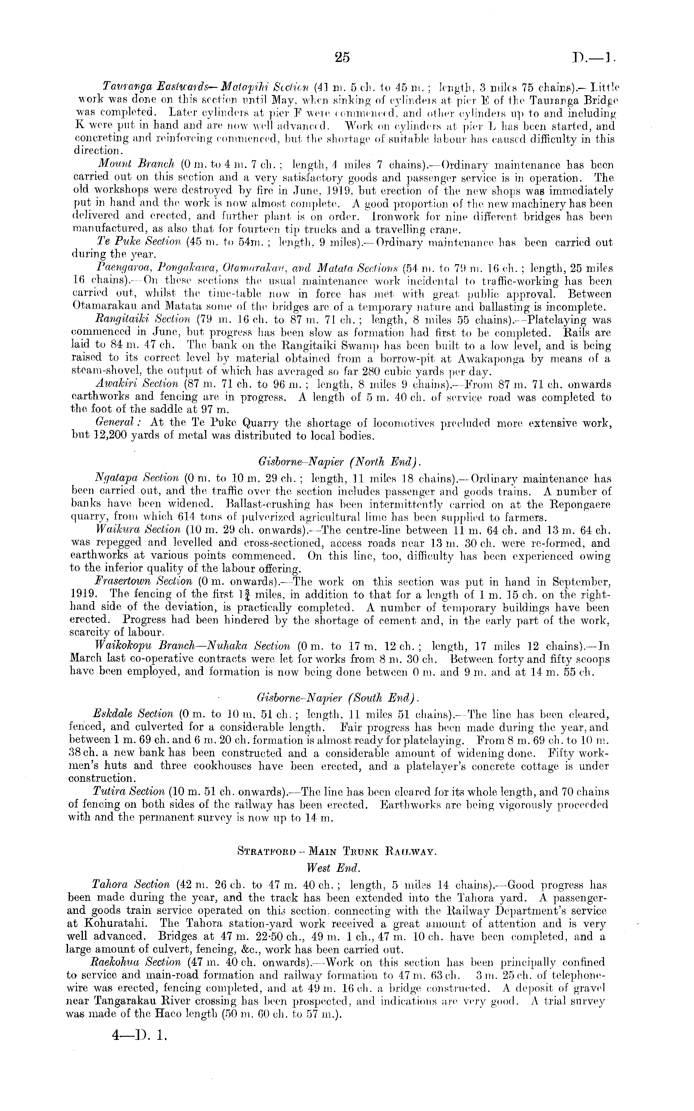Tauranga Eastwards— Matapihi Section (41 in. 5 eh. to 45 m. ; length, 3 miles 75 chains).—Little work was done on this section until May, when sinking of cylinders at pier E of the Tauranga Bridge was completed. Later cylinders at pier F were commenced, and other cylinders up to and including X Were put in hand and are now well advanced. Work on cylinders at pier L has been started, and concreting and reinforcing commenced, but the shortage of suitable labour has caused difficulty in this direction. Mount Branch (0 m. to 4 ni. 7 eh. ; length, 4 miles 7 chains).—Ordinary maintenance has been carried out on this section and a very satisfactory goods and passenger service is in operation. The old workshops were destroyed by fire in June, 1919. but erection of the new shops was immediately put in hand and the work is now almost complete. A good proportion of the new machinery has been delivered and erected, and further plant is on order. Ironwork for nine different bridges has been manufactured, as also that for fourteen tip trucks and a travelling crane. Te Puke Section, (45 m. to 54m. ; length, 9 miles).—Ordinary maintenance has been carried out during the year. Paengaroa, Pongakawa, OtamaraJcau, and Matata Sections (54 m. to 79 m. 16 eh. ; length, 25 miles 16 chains). — On these sections the usual maintenance work incidental to traffic-working has been carried out, whilst the time-table now in force has met with great public approval. Between Otamarakau and Matata some of the bridges are of a temporary nature and ballasting is incomplete. Rangitaiki Section (79 m. 16 eh. to 87 m. 71 eh. ; length, 8 miles 55 chains). —Platelaying was commenced in June, but progress has been slow as formation had first to be completed. Rails are laid to 84 m. 4.7 eh. The bank on the Rangitaiki Swamp has been built to a low level, and is being raised to its correct level by material obtained from a borrow-pit at Awakaponga by means of a steam-shovel, the output of which has averaged so far 280 cubic yards per day. Awakiri Section (87 m. 71 eh. to 96 m. ; length, 8 miles 9 chains).- From 87 m. 71 eh. onwards earthworks and fencing are in progress. A length of sm. 40ch. of service road was completed to the foot of the saddle at 97 m. General: At the Te Puke Quarry the shortage of locomotives precluded more extensive work, but 12,200 yards of metal was distributed to local bodies. Gisborne-Napier (North End). Ngatapa Section (0 m. to 10 m. 29 eh. ; length, 11 miles 18 chains).—Ordinary maintenance has been carried out, and the, traffic over the section includes passenger and goods trains. A number of banks have been widened. Ballast-crushing has been intermittently carried on at the Repongaere quarry, from which 614 tons of pulverized agricultural lime has been supplied to farmers. Waikura Section (10 m. 29 eh. onwards). —The centre-line between II m. 64 eh. and 13 m. 64 eh. was repegged and levelled and cross-sectioned, access roads near 13 m. 30 eh. were re-formed, and earthworks at various points commenced. On this line, too, difficulty has been experienced owing to the inferior quality of the labour offering. Frasertown Section (0 m. onwards).- The work on this section was put in hand in September, 1919. The fencing of the first If miles, in addition to that for a length of Im. 15 eh. on the righthand side of the deviation, is practically completed. A number of temporary buildings have been erected. Progress had been hindered by the shortage of cement and, in the early part of the work, scarcity of labour. Waikokopu Branch — Nuhaka Section (0 m. to 17 m. 12 eh.; length, 17 miles 12 chains).—ln March last co-operative contracts were let for works from Bm. 30 eh. Between forty and fifty scoops have been employed, and formation is now being done between 0 m. and 9 m. and at 14 m. 55 eh. Gisborne-Napier (South End). Eskdale Section (0 m. to 10 m. 51 eh. ; length, 11 miles 51 chains).- The line has been cleared, fenced, and culverted for a considerable length. Fair progress has been made during the year, and between Im. 69 eh. and 6m. 20 eh. formation is almost ready for platelaying. From Bm. 69 eh. to 10 in. 38 eh. a new bank has been constructed and a considerable amount of widening done. Fifty workmen's huts and three cookhouses have been erected, and a platelayer's concrete cottage is under construction. Tulira Section (10 m. 51 eh. onwards). —The line has been cleared for its whole length, and 70 chains of fencing on both sides of the railway has been erected. Earthworks arc being vigorously proceeded with and the permanent survey is now up to 14 m. Stratford - Main Trunk Railway. West End. Tahora Section (42 m. 26 eh. to 47 m. 40 eh.; length, 5 miles 14 chains). —Good progress has been made during the year, and the track has been extended into the Tahora yard. A passengerand goods train service operated on this section, connecting with the Railway Department's service at Kohuratahi. The Tahora station-yard work received a great amount of attention and is very well advanced. Bridges at 47 m. 22-50 eh., 49 m. 1 eh., 47 m. 10 eh. have been completed, and a large amount of culvert, fencing, &c, work has been carried out. Raekohua Section (47 m. 40 eh. onwards). —Work on this section has been principally confined to service and main-road formation and railway formation to 47 m. 63 eh. 3m. 25 eh. of telephonewire was erected, fencing completed, and at 49 m. 16 eh. a bridge constructed. A deposit of gravel near Tangarakau River crossing has been prospected, and indications are very good. A trial survey was made of the Haeo length (50 m. 60 eh. to 57 m.).