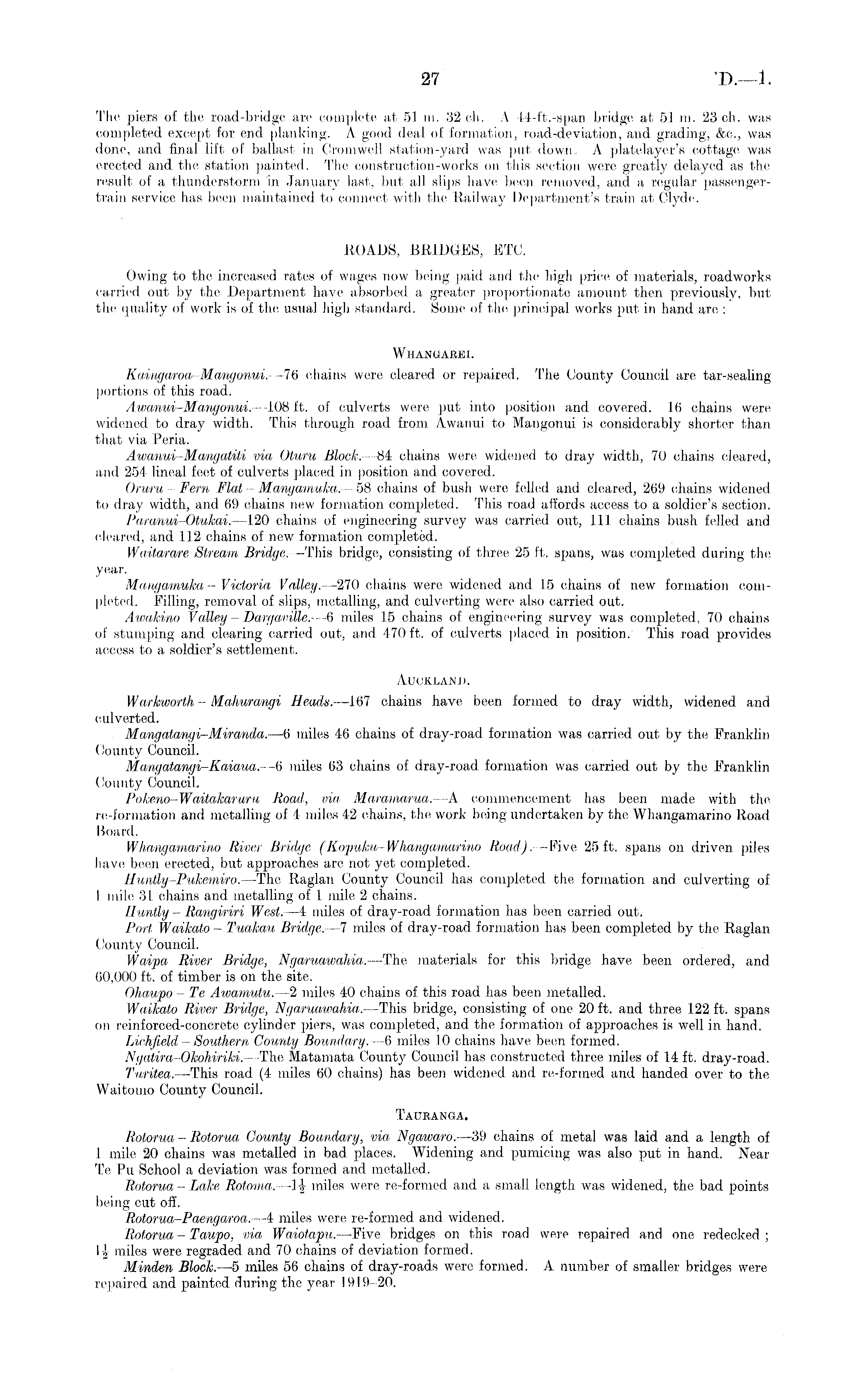 The piers of the road-bridge are complete at 51 in. 32 eh. A 44-ft.-span bridge at 51 m. 23 eh. was completed except for end planking. A good deal of formation, road-deviation, and grading, &c, was done, and final lift of ballast in Cromwell station-yard was put down. A platelayer's cottage was erected and the station painted. The construction-works on this section were greatly delayed as the result of a thunderstorm in January last, but all slips have been removed, and a regular passengertrain service has been maintained to connect with the Railway Department's train at Clyde. ROADS, BRIDGES, ETC. Owing to the increased rates of wages now being paid and the high price of materials, roadworks carried out by the Department have absorbed a greater proportionate amount then previously, but the quality of work is of the usual high standard. Some of the principal works put in hand are :— Whangarei. Kaingaroa-Mangonui. —76 chains were cleared or repaired. The County Council are tar-sealing portions of this road. Awanui-Marujonui.-i.OS ft. of culverts were put into position and covered. 16 chains were widened to dray width. This through road from Awanui to Mangonui is considerably shorter than that via Peria. Awanui-Mangatili via Oturu Block.-—Si chains were widened to dray width, 70 chains cleared, and 254 lineal feet of culverts placed in position and covered. Oruru - Fern Flat - Mangamuka. —58 chains of bush were felled and cleared, 269 chains widened to dray width, and 69 chains new formation completed. This road affords access to a soldier's section. Paranui-Otukai. —120 chains of engineering survey was carried out, 111 chains bush felled and cleared, and 112 chains of new formation completed. Waitarare Stream Bridge. -—This bridge;, consisting of three 25 ft. spans, was completed during the year. Mangamuka - Victoria Valley. —270 chains were widened and J 5 chains of new formation completed. Filling, removal of slips, metalling, and culverting were also carried out. Awakino Valley - Dargaville. —6 miles 15 chains of engineering survey was completed, 70 chains of stumping and clearing carried out, and 470 ft. of culverts placed in position. This road provides access to a soldier's settlement. Auckland. Warkworth - Mahurangi Heads. —l 67 chains have been formed to dray width, widened and culverted. Mangatangi-Miranda. —6 miles 46 chains of dray-road formation was carried out by the Franklin County Council. Mangatangi-Kaiaua. —6 miles 63 chains of dray-road formation was carried out by the Franklin County Council. Pokeno-Waitakaruru Road, via Maramarua. —A commencement has been made with the re-formation and metalling of 4 miles 42 chains, the work being undertaken by the Whangamarino Road Board. Whangamarino River Bridge (Kopitku-Whangamarino Road).—Five 25ft. spans on driven piles have been erected, but approaches are not yet completed. Huntly-Pukemiro. —The Raglan County Council has completed the formation and culverting of I mile 31 chains and metalling of 1 mile 2 chains. fluntly - Rangiriri West. —4 miles of dray-road formation has been carried out. Port Waikato - Tuakau Bridge. - 7 miles of dray-road formation has been completed by the Raglan County Council. Waipa River Bridge, Ngaruawahia. —The materials for this bridge have been ordered, and 60,000 ft. of timber is on the site. Ohaupo -Te Awamutu. —2 miles 4-0 chains of this road has been metalled. Waikato River Bridge, Ngaruawahia. —This bridge, consisting of one 20 ft. and three 122 ft. spans on rein forced-concrete cylinder piers, was completed, and the formation of approaches is well in hand. Lichfield - Southern County Boundary. —6 miles 10 chains have been formed. Ngatira-Okohiriki. —The Matamata County Council has constructed three miles of 14 ft. dray-road. Turitea. —This road (4 miles 60 chains) has been widened and re-formed and handed over to the Waitomo County Council. Tauranga. Rotorua - Rotorua County Boundary, via Ngawaro. —39 chains of metal was laid and a length of I mile 20 chains was metalled in bad places. Widening and pumicing was also put in hand. Near Te I'u School a deviation was formed and metalled. Rotorua-Lake Rotoma. -If miles were re-formed and a small length was widened, the bad points being cut off. Rotorua-Paengaroa. -—4 miles were re-formed and widened. Rotorua - Taupo, via Waiotapu. —Five bridges on this road were repaired and one redecked ; I i miles were regraded and 70 chains of deviation formed. Minden Block— -5 miles 56 chains of dray-roads were formed. A number of smaller bridges were repaired and painted during the year 1919-20.
