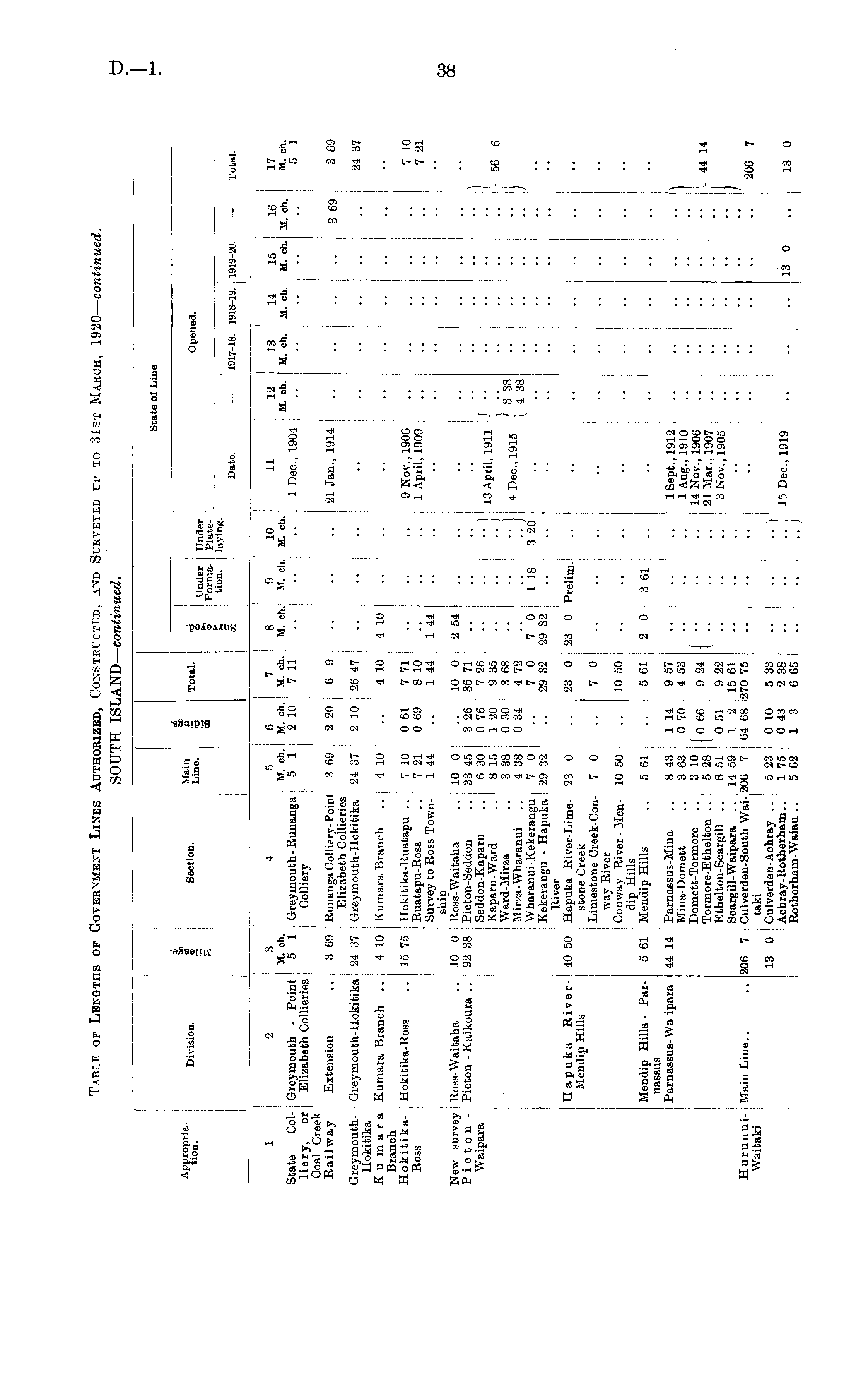 Table of Lengths of Government Lines Authorized, Constructed, and Surveyed up to 31st March, 1920— continued. SOUTH ISLAND— continued.