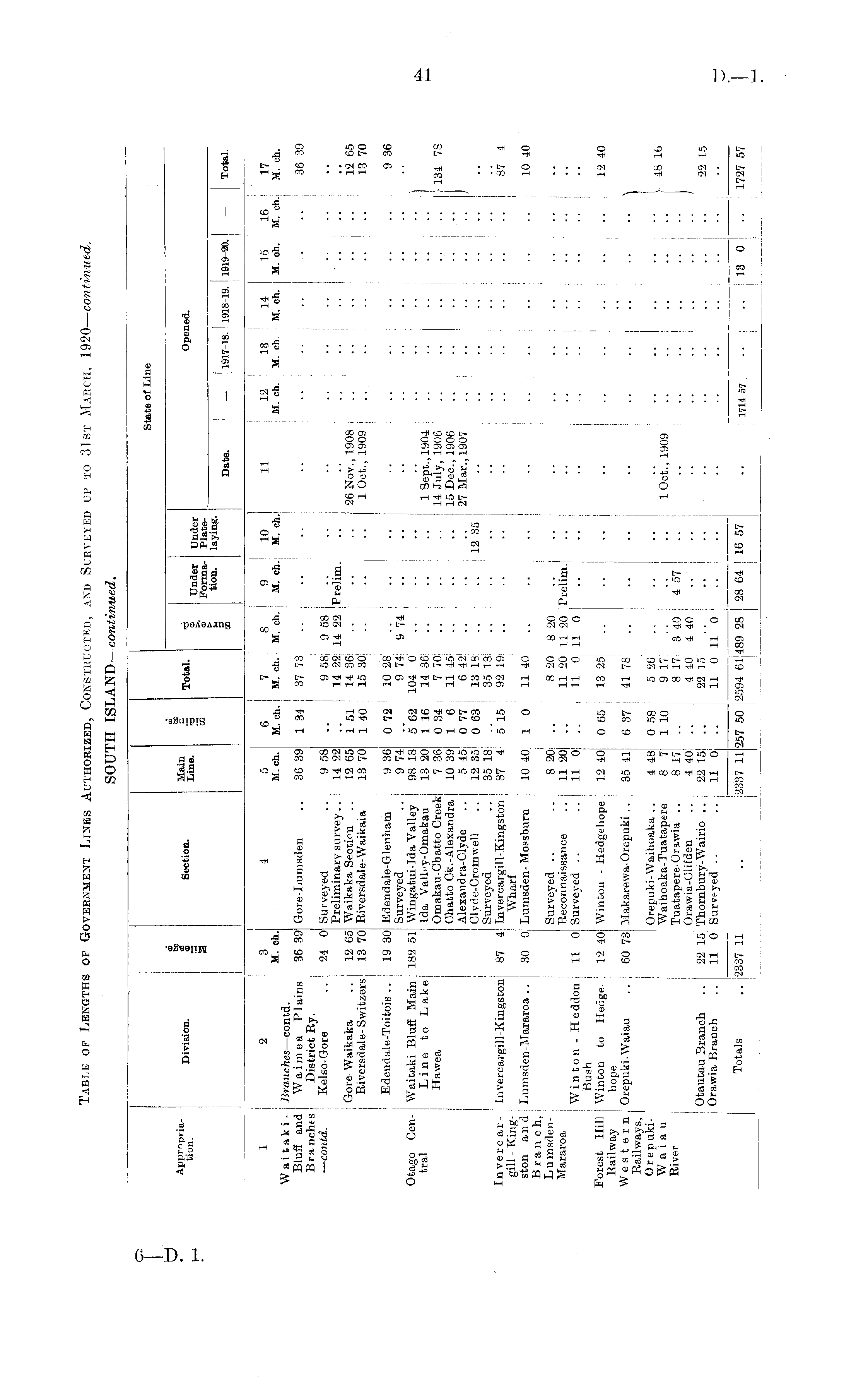 Table of Lengths of Government Lines Authorized, Constructed, and Surveyed up to 31st March, 1920— continued. SOUTH ISLAND— continued.
