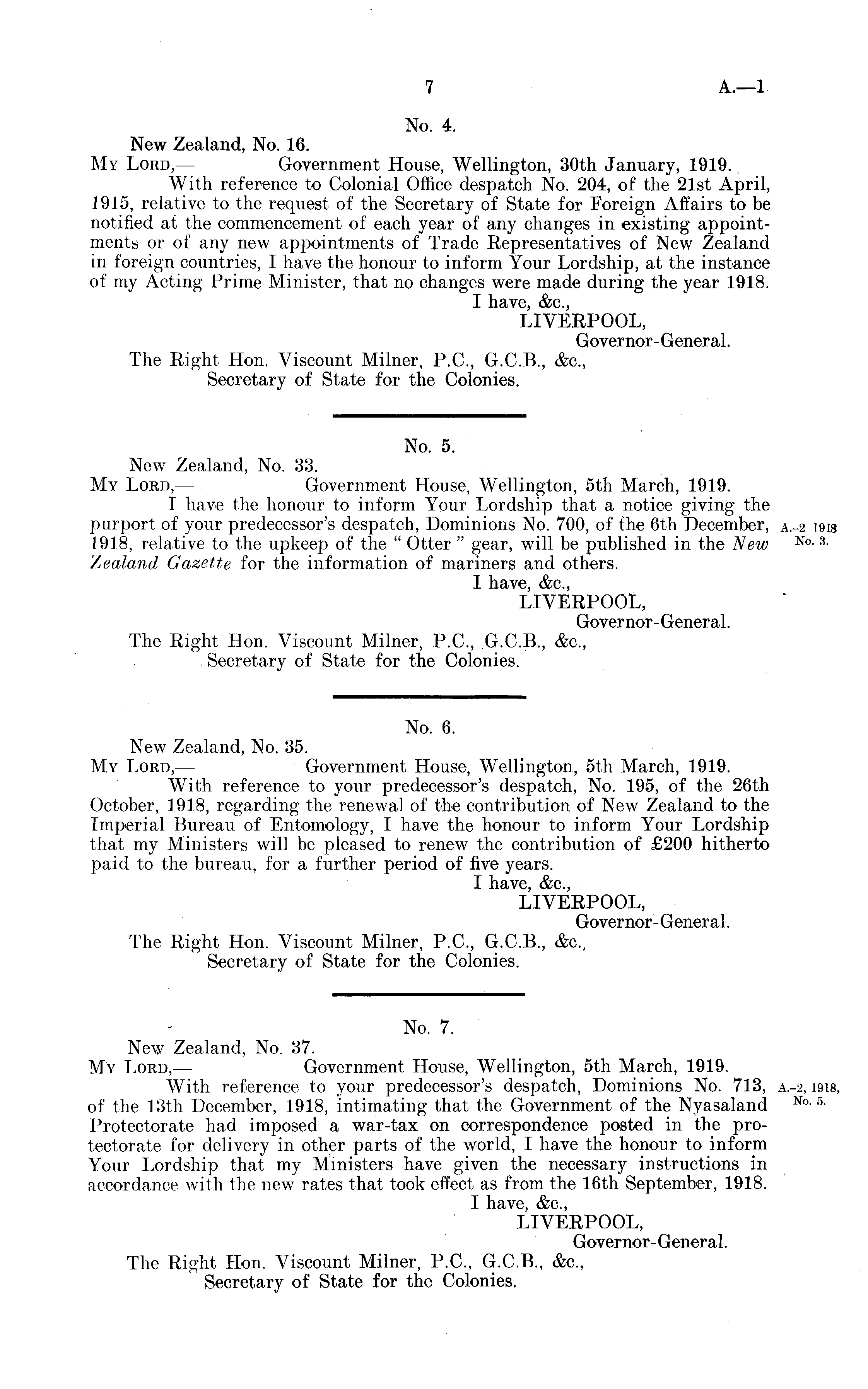 No. 4. New Zealand, No. 16. My Lord, — Government House, Wellington, 30th January, 1919. With reference to Colonial Office despatch No. 204, of the 21st April, 1915, relative to the request of the Secretary of State for Foreign Affairs to be notified at the commencement of each year of any changes in existing appointments or of any new appointments of Trade Representatives of New Zealand in foreign countries, I have the honour to inform Your Lordship, at the instance of my Acting Prime Minister, that no changes were made during the year 1918. I have, &c, LIVERPOOL, Governor-General. The Right Hon. Viscount Milner, P.C., G.C.8., &c, Secretary of State for the Colonies.
