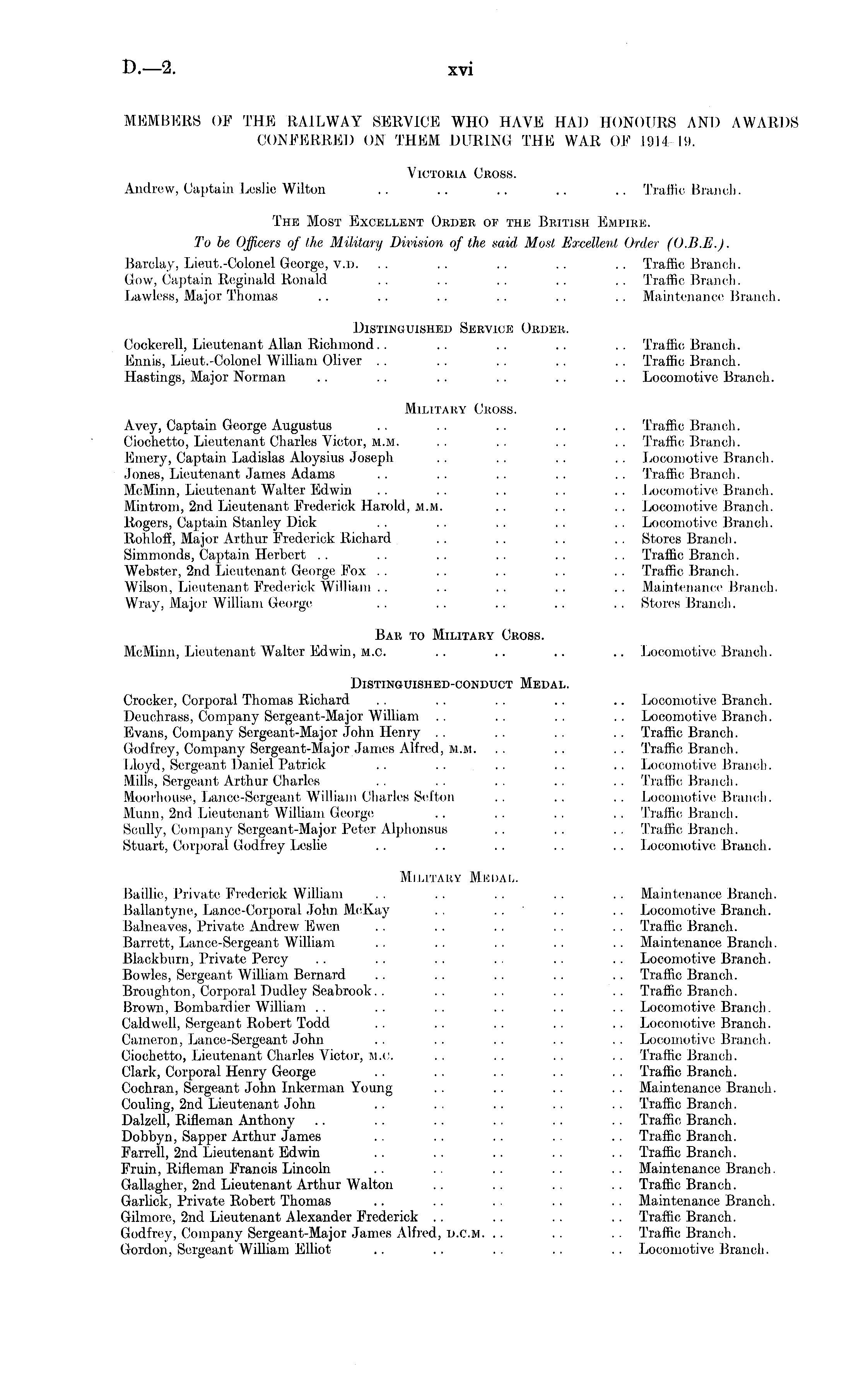 MEMBERS OF THE RAILWAY SERVICE WHO HAVE HAD HONOURS AND AWARDS CONFERRED ON THEM DURING THE WAR OK 1911 19. Victoria Cross. Andrew, Captain Leslie Wilton .. .. .. .. .. Traffic Branch. The Most Excellent Order of the British Emfibe. To be Officers of the Military Division of the said Most Excellent Order (0.8. E.J. Barclay, Lieut.-Colonel George, v.d. .. .. .. .. .. Traffic Branch. Gow, Captain Reginald Ronald .. .. .. .. .. Traffic Branch. Lawless, Major Thomas .. .. .. .. . . . . Maintenance Branch. Distinguished Service Order. Cockerell, Lieutenant Allan Richmond.. .. .. .. . . Traffic Branch. Eiinis, Lieut.-Colonel William Oliver . . . . . . .. .. Traffic Branch. Hastings, Major Norman .. .. .. . . . . .. Locomotive Branch. Military Cross. Avey, Captain George Augustus . . .. .. . . .. Traffic Branch. Ciochetto, Lieutenant Charles Victor, m.m. .. .. .. .. Traffic Branch. Emery, Captain Ladislas Aloysius Joseph . . .. .. . . Locomotive Branch. Jones, Lieutenant James Adams .. .. .. .. .. Traffic Branch. McMinn, Lieutenant Walter Edwin .. .. .. .. .. Locomotive. Branch. Mintrom, 2nd Lieutenant Frederick Harold, m.m. .. .. .. Locomotive Branch. Rogers, Captain Stanley Dick .. .. .. .. .. Locomotive Branch. Rohloff, Major Arthur Frederick Richard .. .. .. .. Stores Branch. Simmonds, Captain Herbert . . .. .. . . .. . . Traffic Branch. Webster, 2nd Lieutenant George Fox . . . . .. .. . . Traffic Branch. Wilson, Lieutenant Frederick William . . .. . . .. .. Maintenance Branch. Wray, Major William George .. .. .. .. .. Stores Branch. Bar to Military Cross. McMinn, Lieutenant Walter Edwin, m.O. .. .. .. .. Locomotive Branch. Distinguished-conduct Medal. Crocker, Corporal Thomas Richard . . . . . . .. .. Locomotive Branch. Deuohrass, Company Sergoant-Major William .. .. . . . . Locomotive Branch. Evans, Company Sergeant-Major John Henry . . . . . . . . Traffic Branch. Godfrey, Company Sergeaht-Major James Alfred, m.m. .. .. .. Traffic Branch. Lloyd, Sergeant Daniel Patrick .. .. .. .. .. Locomotive Branch. Mills, Sergeant Arthur Charles .. .. .. .. .. Traffic Branch. Moorhouse, Lance-Sergeant William Charles Sefton .. .. .. Locomotive Branch. Munn, 2nd Lieutenant William George; .. .. . . .. Traffic Branch. Scully, Company Sergeant-Major Peter Alphonsus .. . . .. Traffic Branch. Stuart, Corporal Godfrey Leslie .. .. . . .. .. Locomotive Branch. Military Medal. Baillie, Private Frederick William .. .. .. .. .. Maintenance Branch. Ballantyne, Lanco-Corporal John McKay .. .. .. .. Locomotive Branch. Balneaves, Private Andrew Ewen .. .. .. .. .. Traffic Branch. Barrett, Lance-Sergeant William .. . . .. . . .. Maintenance Branch. Blackburn, Private Percy .. . . .. . . .. . . Locomotive Branch. Bowles, Sergeant William Bernard .. . . .. .. . . Traffic Branch. Broughton, Corporal Dudley Scabrook. . . . . . . . . . Traffic Branch. Brown, Bombardier William .. .. .. .. .. .. Locomotive Branch. Caldwell, Sergeant Robert Todd . . .. . . . . .. Locomotive Branch. Cameron, Lance-Sergeant John .. . . . . .. . . Locomotive, Branch. Ciochetto, Lieutenant Charles Victor, m.c. .. .. .. .. Traffic Branch. Clark, Corporal Henry George .. .. .. .. .. Traffic Branch. Cochran, Sergeant John Inkerman Young . . .. .. . . Maintenance Branch. Couling, 2nd Lieutenant John . . . . . . . . . . Traffic Branch. Dalzell, Rifleman Anthony .. .. .. . . . . . . Traffic Branch. Dobbyn, Sapper Arthur James .. .. . . . . . . Traffic Branch. Farrell, 2nd Lieutenant Edwin . . . . .. .. . . Traffic Branch. Fruin, Rifleman Francis Lincoln .. .. .. .. .. Maintenance Branch. Gallagher, 2nd Lieutenant Arthur Walton .. .. .. .. Traffic Branch. Garlick, Private Robert Thomas .. .. . . .. .. Maintenance Branch. Gilmoro, 2nd Lieutenant Alexander Frederick .. .. .. .. Traffic Branch. Godfrey, Company Sergeant-Major James Alfred, i».cm. .. .. .. Traffic Branch. Gordon, Sergeant William Elliot .. . . . . .. . . Locomotive Branch.