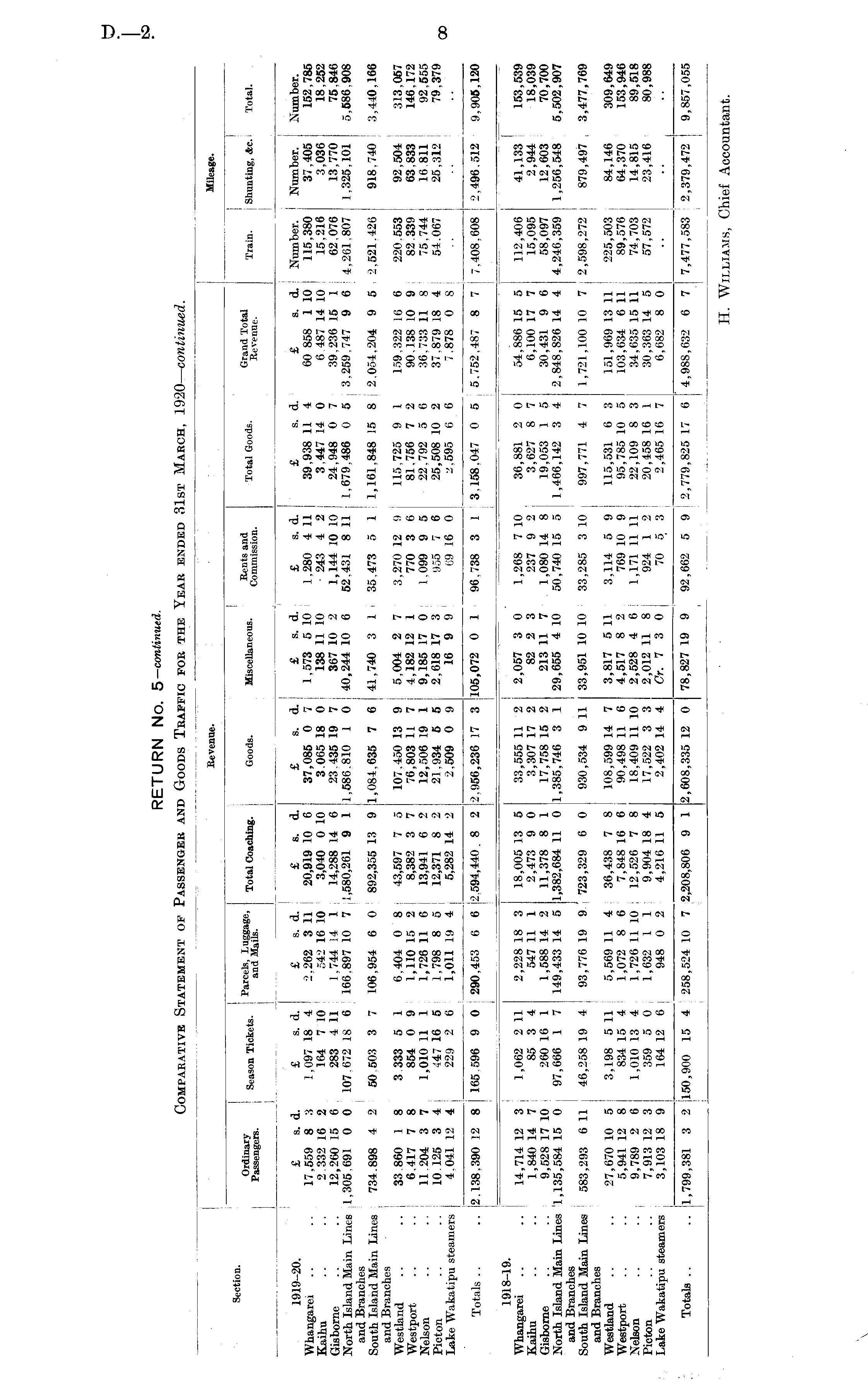RevenueMileage. Section. P™L Season Tickets. Total Coaching. j I __ 1919-20. £ s. d. £ s. d. £ s. d. £ s. d. Whangarei .. .. 17,559 8 3 1.097 18 4 2.262 3 11 20,919 10 6 Kaihu .. .. 2 332 16 2 164 7 10 ; 542 16 10 3,040 0 10 Gisborne .. .. 12,260 15 6 283 4 11 ; 1.744 14 1 ; 14,288 14 6 North Island Main Lines 1,305.691 0 0 107.672 18 6 166,897 10 7 11,580,261 9 1 and Branches South Island Main Lines , 734.898 4 2 50,503 3 7 106,954 6 0 892,355 13 9 and Branches Westland .. .. 33 860 18 3 333 5 1 6.404 0 8 43,597 7 5 Westport .. .. 6.417 7 8 854 0 9 1,110 15 2| 8,382 3 7 Nelson .. .. 11.204 3 7 1,010 11 1 1,726 11 6 j 13,941 6 2 Picton .. .. 10.125 3 4 447 16 5 1,798 8 5! 12,371 8 2 Lake Wakatipu steamers 4.04112 4; 229 2 6 1,01119 4| 5,282 14 2 Section. I ' I I £ s. d. £ s. d. £ s. d. £ s. d. £ s. d. Number. 37,085 0 7 1,573 5 10 1.280 4 11 39.938 11 4 60 858 1 10 j 115,380 3.065 18 0 138 11 10 243 4 2 3,447 14 0 6 487 14 10 15,216 23.435 19 7 367 10 2 1,144 10 10 24,948 0 7 39.236 15 1 62,076 1,586.810 1 0 : 40,244 10 6 52.431 8 11 1.679,486 0 5 : 3,259,747 9 6 i 4,261.807 Goods. Miscellaneous. Rents and Commission. Total Goods. Grand Total Revenue. Train. j Shunting, etc. Number. 37,405 3,036 13,770 1.325.101 Number. 152.781 18,25! 75,841 5,586.901 Total. 1,084,635 7 6 41,740 3 1 35,473 5 1 ] 1,161,848 15 8 j 2,054,204 9 5 2,521,426 918,740 | 3,440,161 107.450 13 9 5.004 2 7 3,270 12 9 115.725 9 1 159.322 16 6 220.553 76,803 11 7 4,182 12 1 770 3 6 81.756 7 2 90,138 10 9 82.339 12,506 19 1 9,185 17 0 : 1.099 9 5 22.792 5 6 36.733 11 8 75,744 21,934 5 5 2,618 17 3 955 7 6 25,508 10 2 37,879 18 4 54.067 2,509 0 9 16 9 9 69 16 0 6 6 7.878 0 8 92,504 63.833 16 811 25,312 313,05' 146,17; 92,55; 79,37! Totals.. .. 2.138.390 12 8 165,596 9 0 290,453 6 6 J2,594,440. 8 2 2,594,440. 8 2 2,956,236 17 3 105,072 0 1 j 96,738 3 1 3,158.047 0 5 , 5.752,487 8 7 7.408,608 2,496.512 9,905,1: I = — I : I 1918-19. Whangarei .. ..I 14,714 12 3 1,062 2 11 2,228 18 3 18,005 13 5 Kaihu .. .. 1,840 14 7 85 3 4 547 11 1 2,473 9 0 Gisborne .. .. 9,528 17 10 260 16 1 1,588 14 2 11,378 8 1 North Island Main Lines 1,135,584 15 0 97,666 1 7 149,433 14 5 1,382,684 11 0 and Branches South Island Main Lines 583,293 6 11 46,258 19 4 93,776 19 9:723,329 6 0 and Branches Westland .. .. 27,670 10 5 3,198 5 11 5,569 11 4 36,438 7 8 Westport .. .. 5,94112 8 834 15 4 I 1,072 8 6 7,848 16 6 Nelson .. .. : 9,789 2 6 1,010 13 4 1,726 1110 12,526 7 8 Picton .. .. : 7,913 12 3 359 5 0 1,632 1 1 9,904 18 4 Lake Wakatipu steamers 3,103 18 9 164 12 6 948 0 2 4,216 11 5 2,228 18 3 547 11 1 1,588 14 2 149,433 14 5 18,005 13 5 2,473 9 0 11,378 8 1 1,382,684 11 0 33,555 11 2 3,307 17 2 17,758 15 2 1,385,746 3 1 2,057 3 0 82 2 3 213 11 7 29,655 4 10 1,268 7 10 36,881 2 0 237 9 2 3,627 8 7 1,080 14 8 19,053 1 5 50,740 15 5 1,466,142 3 4 54,886 15 5 6,100 17 7 30,431 9 6 2,848,826 14 4 112,406 15,095 58,097 4,246,359 41,133 i 153,539 2,944 18,039 12,603 70,700 1,256,548 5,502,907 93,776 19 9 723,329 6 0 930,534 9 11 33,951 10 10 33,285 3 10 i 997,771 4 7 I 1,721,100 10 7 2,598,272 879,497 3,477,769 5,569 11 4 1,072 8 6 1,726 11 10 1,632 1 1 948 0 2 36,438 7 8 7,848 16 6 12,526 7 8 9,904 18 4 4,216 11 5 108,599 14 7 90,498 11 6 18,409 11 10 17,522 3 3 2,402 14 4 3,817 5 11 4,517 8 2 2,528 4 6 2,012 11 8 Cr. 7 3 0 3,114 5 9 115,531 6 3 769 10 9 95,785 10 5 1,171 11 11 22,109 8 3 924 1 2 20,458 16 1 70 5 3 2,465 16 7 151,969 13 11 103,634 6 11 34,635 15 11 30,363 14 5 6,682 8 0 225,503 89,576 74,703 57,572 84,146 309,649 64,370 153,946 14,815 89,518 23,416 80,988 Totals.. .. jl,799, 381 3 2 150,900 15 4 258,524 10 7 2,208,806 9 1 12,608,335 12 0 78,827 19 9 92,662 5 9 ! 2,779,825 17 6 4,988,632 6 7 7,477,583 2,379,472 9,857,051 i H. Williams, Chief Ai :ountam