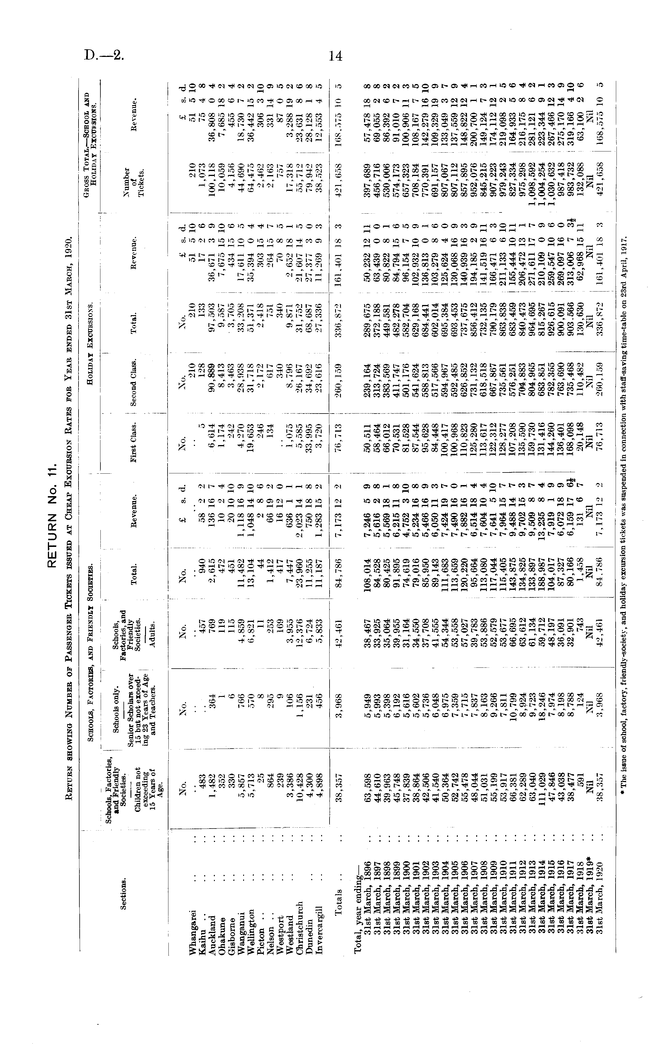 Schools, Factories, and Friendly Societies. Holiday Holiday Excuesioxs. Y E: iXCHESIOXS. Geoss Total. Holiday 1 Gross Totai. —School and Holiday Excite signs. l. —School am: Excite signs. - Sections. Schools, Factories, ; and Friendly Schools only. Schools, Societies. Factories, and - Senior Scholars over Friendly Total Children not 15 but not exceed- Societies. exceeding ing 23 Years of Age i 15 Years of and Teachers. Adults. Age. ] Revenue. First Class. Second Class. I Total. Revenue. Number of Tickets. Revenue. Whangarei Kaihu Auckland Ohakune Gisborne Wanganui Wellington Picton Nelson Westport Westland Christchurch Dunedin Invercargill No. 483 1.482 352 330 5,857 5,713 25 864 239 3,386 10,428 4,300 4,898 No. 364 1 6 766 570 8 295 9 106 1,156 231 456 No. 457 769 119 115 4,859 6,821 11 253 169 3,955 12,376 6,724 5,833 No. £ s. d. 940 58 2 2 2,615 136 16 7 472 10 2 4 451 20 10 10 11,482 1,118 16 9 13,104 1,048 14 10 44 2 8 6 1,412 66 19 2 417 16 12 0 7,447 636 1 1 23,960 2,023 14 1 11,255 750 18 8 11,187 1,283 15 2 No. 5 : 6,614 | 1,174 242 4,270 19.653 246 134 1,075 5,585 33,995 3,720 No. 210 128 90,889 8,413 3,463 28,938 31,718 2,172 617 340 8,796 26,167 34,692 23,616 No. £ s. d. 210 51 5 10 133 17 2 6 97,503 36,671 3 9 9,587 j 7,675 15 10 3,705 434 15 6 33,208 I 17,611 10 5 51,371 35,394 0 4 2,418 303 15 4 751 264 15 7 340 70 8 5 9,871 2,652 18 1 31,752 i 21,607 14 5 68,687 | 27,377 3 0 27,336 i 11,269 9 3 £ s. d. 210 51 5 10 1,073 75 4 8 100,118 36,808 0 4 10,059 7,685 18 2 4,156 455 6 4 44,690 18,730 7 2 64,475 36,442 15 2 2,462 306 3 10 2,163 331 14 9 757 87 0 5 17.318 3,288 19 2 55,712 23,631 8 6 79,942 28,128 1 8 38.523 12,553 4 5 Totals .. 38,357 3,968 42,461 84,786 7,173 12 2 76,713 260,159 336,872 161.401 18 3 421,658 168.575 111 5 Total, year ending — 31st March, 1896 31st March, 1897 31st March, 1898 31st March, 1899 31st March, 1900 31st March, 1901 31st March, 1902 31st March, 1903 31st March, 1904 31st March, 1905 31st March, 1906 31st March, 1907 31st March, 1908 31st March. 1909 31st March, 1910 31st March, 1911 31st March, 1912 31st March, 1913 31st March, 1914 31st March, 1915 31st March, 1916 31st March, 1917 31st March, 1918 31st March, 1919* 31st March, 1920 63,598 44,610 39,963 45,748 37,839 38,864 42,506 41,540 50,364 52,742 55,478 48,044 51,031 55,199 53,917 66,381 62,289 63,040 111,029 47,846 43,038 38,477 591 Nil 38,357 5.949 5.993 5,398 6,192 5,616 5,602 5,736 6,048 6,975 7,359 7,715 7,837 8,163 9,266 7.811 10,799 8,924 9,723 18,246 7,974 8,198 8,788 124 Nil 3.968 38.467 33,925 35,064 39,955 31,164 34,550 37,708 41,555 54,344 53,558 57,027 39,783 53,886 52,579 53,677 66,695 63,612 61,134 59,712 48,197 36,091 32,901 743 Nil 42,461 108.014 7,246 5 9 84,528 5,616 2 8 80,425 5,569 18 1 91,895 6,215 11 8 74,619 4,752 3 10 79,016 5,234 16 8 85,950 5,466 16 9 89,143 6,050 11 3 111,683 7,424 19 7 113,659 7,490 16 0 120,220 7,882 16 1 95,664 6,514 18 4 113,080 7,604 10 4 117,044 7,641 5 10 115,405 7,964 15 7 j 143,875 9,488 14 7 134,825 9,702 15 3 133,897 9,509 8 7 188,987 13,235 8 4 104,017 7,919 1 9 87,327 6,072 18 9 80,166 6,159 17 6J 1,458 131 6 7 Nil Nil 84,786 7,173 12 2 50,511 58,464 66,012 70,531 i 81,528 87,544 95,628 84,448 100,417 100.968 110,823 125,280 113,617 122,312 128,277 107,208 135,590 159,730 131,416 144,260 136,401 168,098 20,148 Nil 76,713 239,164 313,724 383,569 411,747 501, 176 541,624 588,813 517,566 594,967 592,485 626,852 731,132 618,518 667,867 735,561 576,251 704,883 804,965 683,851 782,355 763,690 735,468 110,482 Nil 260,159 289,675 50,232 12 11 372,188 63,439 0 0 449,581 80,822 8 1 482,278 84,794 15 6 582.704 96,154 7 5 629,168 102,932 10 9 684,441 136,813 0 1 602,014 103,279 8 6 695.384 125,624 4 0 693,453 130,068 16 9 737,675 140,939 16 3 856,412 194,185 2 9 732,135 141,519 16 11 j 790,179 166.471 6 3 863.838 211,133 6 10 ; 683,459 l 155,444 10 11 840,473 206,472 13 1 964,695 271,611 17 7 815,267 210,109 0 9 926,615 259,547 10 6 900.091 269,097 16 0 903.566 313,006 7 3"? 130,630 62,968 15 11 Nil Nil 336,872 ! 161,401 18 3 397,689 57.478 18 8 456,716 69.055 2 8 530,006 86.392 6 2 574,173 91,010 7 2 657,323 100,906 11 3 708.184 108,167 7 5 770,391 142,279 16 10 691,157 109,329 19 9 807,067 ! 133,049 3 7 807,112 137,559 12 9 857,895 148.822 12 4 952,076 200,700 1 1 845,215 149,124 7 3 907,223 174,112 12 1 979.243 219,098 2 5 827,334 164,933 5 6 975,298 ! 216,175 8 4 1,098,592 281,121 6 2 1,004,2-54 223,344 9 1 1,030.632 267.466 12 3 987,418 275,170 14 9 983,732 319.166 4 10 132,088 63,100 2 6 Nil Nil 421,658 168,575 10 5 * The issue of school, factory, friendly-society, and holiday excursion tickets was suspended in connection with staff-savin; time-tabie on 23rd April, 1917.
