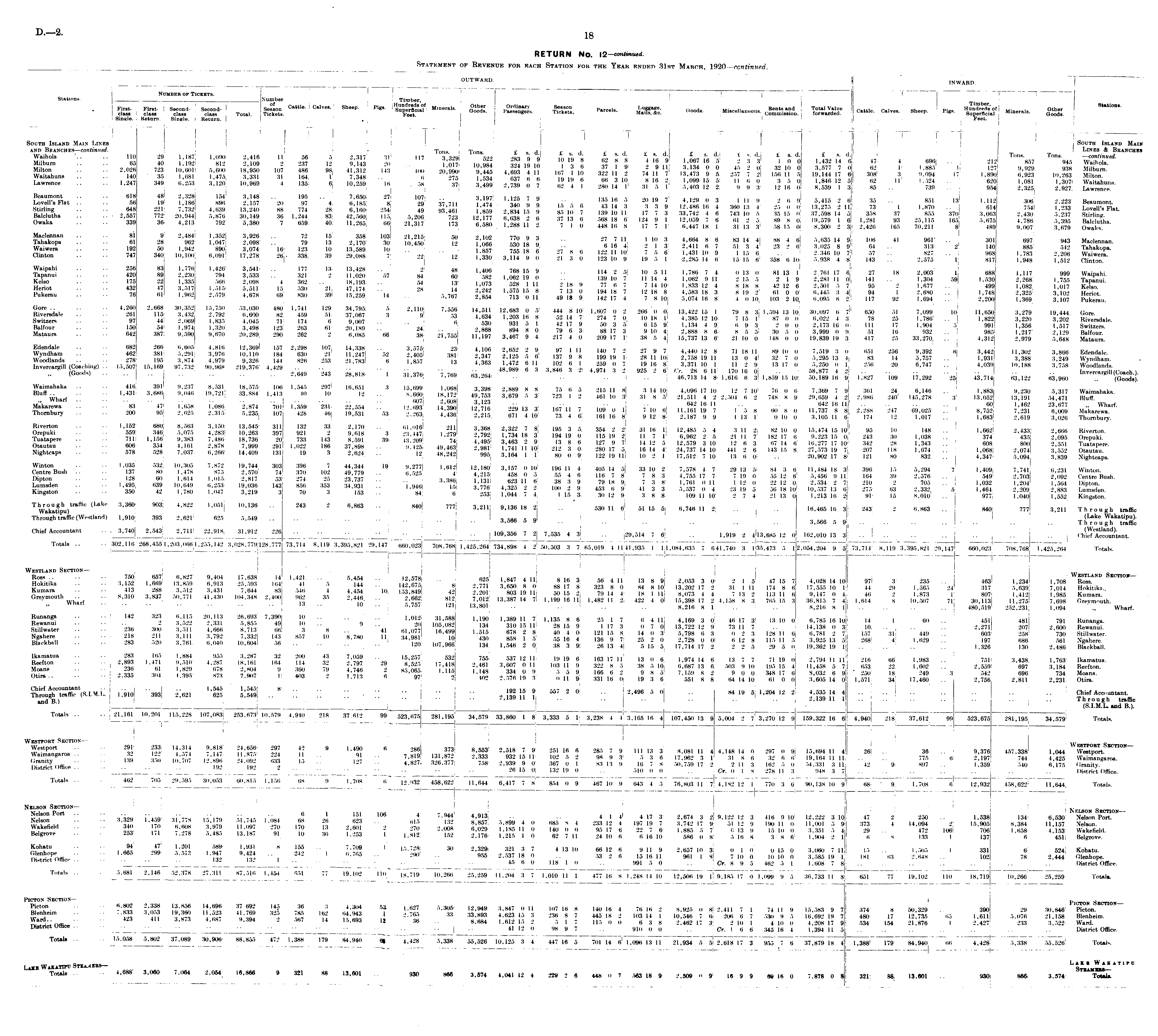 j OUTWARD. | INWARD. . Number of Tickets. Stations. | Number Timber, • ; ssr sssr s =, d -1 ssa. cattle ' Calves " Sheep ' pies ' v Mmerals - Parcels - » ooods - —j si ««- M **. rSs f sk station8 ' | Single. Return. Single. Return. I | j j Feet. South Island Main Lines South Island Main and Branches —continued. ■ T nn „ T „ , ,. , , , 1 Lines & Branches Milburn " " "5 40 l'l92 1 'si"! 2'109 " "'37 12 9'l43 -><i " 7 Hf, lft S 9 9 10 10 8 62 8 8 4 16 9 1,067 16 5 2 3 3 1 0 0 1.432 14 6 47 4 696) .. 212 '""%57 Virihola^' Waitahuna " " 'uo ? 35 t'Z Wl Z 1 Vm. "" " »l ™ 1 " 322 l! 2 74 11 " 1S95I 257 7 2 156 U 5 19,'lH H 6 3o1 3 i'.S 17 l,89o| lojel Lawrence .. .. 1,247 349 3J20 10!969 4 135 6 16 .58 *37 2,739 0 71 62 '4 ? 280 14 " 3?" f «£• }| 2| "$ 3 12 16 0 S '1 3 85 ''739 " 954 IS. \'S\ Sof' LoveirsFIat " 19 l'l86 8% : >'l57l "20 " 4 «'l«? 8 *90! Q7 711 1,125 7 9 135 16 0 20 19 7 4,129 0 3 1 11 9 2 6 9 5,415 2 6 35 .. 851 13 1,112 306 2,223 Beaumont ts£L : s i : i £ S U i i : i a J -11 jl 2,834159 139 H 1773 sss* a j « ..a 2,is s sr 0waka •• •• 339 36 4,213 792 5,380 7 659 40 11:265 06 21:317 173 | eissoi. l!288 U 2 3 ? V l 0 448 II t\ Tl 7 1 18 I 3! 13 3 58 15 0 'S 1 3 K 165 TO.'snI "S "fss K Si oltf*' St" - " II 28 2 '962 I;047 2,0981 " ni Is 2,|TO 'So wlw S l'o66 530 18 9 " 27 7 11 1 L ® 3 *>664 8 6 83 14 4 88 4 6 5,635 14 9 106 41 961 .. 301 697 943 Maclennan. Waiwera .. .. 192 50 1,942 ' 89 0 3 074 16 123 10 13 589 0 ' 'gST 755 8 6 M 8 6 1, , 2 1 3 ,00 5 3 4 23 2 6 » » 64 .. 313 2 140 885 542 Tahakopa. «— - " 747 340 10 ' 100 6 ' 091 17,278 I" 338 39 29,088 7 22 12 K 3,Iff U 9 ? 21 3 0 \ll\Vl\ 122 f igllS 6 15 15 6 358 0 10 !£ "J 2 l2 !! "l % L'LI ST' Tap'anul !! !! 420 89 2*230 ''794 3'533 " 32] ll'o2o! "o7 84 60I 1 n«9 !q o " 114 2 5 10 5 11 1,786 7 4 0 13 0 81 13 1; 2,761 17 6 27 18 2,003 1 688 1,117 999 Waipahi. KeC 175 "2 1 335 566 2 098 "4 362 '?a 1.062 19 0 s. 139 10 7 11 14 4 1,062 9 11 2 15 5 2 1 9 2,281 11 0 141 .. 1,304 59 1.530 2,268 1,755 Tapanui. Heriot :: : m « li™ 1515 Ifn it 530 "21 «m " ;>8 I \-%l 1 2 ; 8 9 77 « 7 71410 '- 833 12 4 sis 8 4212 6 2,.501 6 7 95 2 1,677 .. 4 99 io 82 i 0 n Ke L. Pukerau 76 61 1962 2 579 4'67« 6Q 8 n 1 39 Tk ' "l4 -nit' !'! 42 1,575 15 8 7 13 0 194 18 7 12 18 8 4,583 18 3 8 19 2 61 0 0 6,445 3 4 94 1 2,680 1,748 2,325 3,102 Heriot Pukerau ■' " 76 1,962 2,579 4,678 69 830 39 15,259 14 i • °' 7b/ 2,8Mj 713 Oil 49 18 9 142 17 4 7 8 10 5,074 16 8 4 0 10 103 2 10, 6,095 6 2 117 92 1,694! .. 2,200 1,369 Pukerau. Riversda'e " + '-'61 "'ll5 192 'e'wOi ''459 37'o67 3 2 ' U 2 7,5 5S ir « 444 8 10 ' 1,607 0 2 | 266 0 0 13,422 15 1 79 8 3 1,594 13 10 30,097 6 7 650! 51 7,099 10 11,650 3,279 19,444; Gore. Spritzers :: .. 97 44 T!835 4'(W5 11 H4 6 9 M .. t 4 " » 5 ? 4 7 274 7 0 10 18 1 4,385 12 10 7 15 1 87 0 0- 6,022 4 3 78 25 1,786 .. 1,822 3,220 Riversdale. Balfour 150 54 J 974 1 '320 V 4Q8 ioo fil ->n'mQ 9J. -» !!! ° 42 17 9 50 3 51 6 15 9 1,134 4 9; 6 9 3 2 0 0 2,173 16 0 111 17 1,904 5 991 1,356 1,517 Switzers. Mataura " " 642 387 9'590 i'7 2 o'289 >90 2 lull "66 It , 2,8 ? 894 8 0 79 6 3 88 17 3 9 10 4 2,888 8 6! 8 5 5 30 5 0 3,999 0 9 51 16 932; .. 985 1,217 2,129 Balfour. Mataura .. 642 387 9,o90 9,670 20,289, 290 .62 2 6,085 66 38 21,755 11,197 3,467 9 4; 217 4 0 209 17 1 38 5 4 15,737 13 6| 21 10 0 148 0 0 19,839 19 3 417 25 33,270 .. 4,312 2,979 5,648 Mataura. WTOdham :: :: 46 2 til I'liS lo'iw HI 2 ' 6-SO '21 nIS "52 2'405 38? 1 9 97 1 11 140 7 2 27 9 7 4,440 12 8 71 18 11 89 10 0 7,519 3 oi 651 256 9,392 6 3,442 11,302 3,866 Edendale. Woodlands .. 9?g 195 3 874 4 979 9 32 44 89« IVitl I f'o-5 381 2 , 347 2 ,125 5 6 137 9 8 199 19 1 28 11 10 2,758 19 11 13 0 4 32 7 0 5,295 13 4 83 14 5,757 .. 1,931 3,388 3,249 ! Wyndham. Invercargill (Coaching) .. 15,507 15,169 97! 7.32 219*371, 4,429 .1 ' 7.' .. .. ' ® " 6 4 g 59 0 7 ,..' 9 8 r 3 ' 37 '. 10 .[ 11 2 9 13 17 0 5, ?5° 0 1 256 20 6,747 •• 4,039 10,188 3,7 58 Woodlands (Goods) I .. .. .. .. 2,649 243 28,818 1 31,37«| 7,769 63,264| .. .. .. 46,713 14 8 1,616 6 3 1,859 15 10 50,'189 16 9 io9 i'7,292! "25 43,714 63,122 63,960 '(Go^s).' Waimahaka .. •• 416 391 9,237 8,531 18,575; 106 1,545 297 16,651 3 15,699 1,068 3,398 2,889 8 8 75 6 5 215 11 8 3 14 10 4,096 17 10 12 7 10 76 0 6 7,369 7 9 361 24 6,146 .. 1,883 9,230 5,317 Waimahaka. " wharf :: :: : 33,884 1,413 12 •• 8 -®$ 18,172 49,753 3,679 5 3 723 1 2 46i 10 3 31 s 5 21,511 4 2 2,504 « 2 ?48 8 9 29,659 4 2 2,986 240! 145:278 3 13:052 i 3 : 19 i 54:471 BM. :: :: tl I'm i'm S 't li S m i'm '53 y *%l ii?* l l , 3 l «i n 7 109 0 1 7 10 6 " > " 5 8 «'»'« 0, uS 1 !" "247 69,025 :: s^ LnornDury ~uu, »D| t,xux> .,6 IS 5,235, 107 4.8 4b| 19,531 53 2,263 4,436 2,215 671 4 10 73 4 6 161 16 8 9 12 8 2,187 9 9 1 13 1 0 10 Oi 3,105 11 6 174 12 1,017 ... 1,683 2,619 Thornbury. :: '*559 3 6 S 8 075 IS 397 921 1 I'Z " 3 "V4I7 , III ?' 32 ? , 7 8 195 3 5 354 2 2 31 16 1 12,485 5 4 3 11 2 82 10 0 15,474 15 10 95 10 148 .. 1,662 2,433 2,666 Riverton. Tuatanere .. 711 1 56 9 383 7 486 18 736 on ill 143 «'t ( n J, fl't" 1,279 2,792 *>734 18 3 194 19 0 115 19 2 11 7 1 6,962 2 5 21 11 7 182 17 6 9,223 15 0 243 30 1,038 .. 374 435 2 095 Orepuki. Otautau " •• 606 '.354 4 161 '>'878 7'999 291 1 099 186 37's98 ,1, 4,49 f 3,463 ,? 9 13 8 6 127 9 7 14 12 5 12,579 3 10 12 6 3 67 14 6 16,277 17 10 342 28 1,343 .. 608 800 2,551 Tuatapere. Niehtcaps .. 578 528 7 037 6 966 14 409 H '?a 37 ' 9,4 ff f 9,463 2 ,981 ,74 1 10 212 3 0 280 17 5 16 14 4 24,737 14 10 441 2 6 143 15 8 27,573 19 7! 207 118 1,674 .. 1,068 2,074 3 552 Otautau. Nightcaps •• 578, j 7,037 b, - W> 14,40J 131 ! 3 2,624 ■ 12 i 4 8,242 995 3,164 1 1 80 0 9 122 19 11 10 2 1 17,512 7 10 13 6 0 .. 20,902 17 8| 121 80 832 .. 4,347 5,094 3:839 Nightcaps. •' :: l '?37 'l 478 'I?' '2'570 3TO 102 t'w " I'TJ 3,157 0 10 196 11 4 405 14 5 33 10 2 7,578 4 7 29 13 5 84 3 6j 11,484 18 3 396 15 5,294 7 1,409 7,741 6,231 Winton. Centre