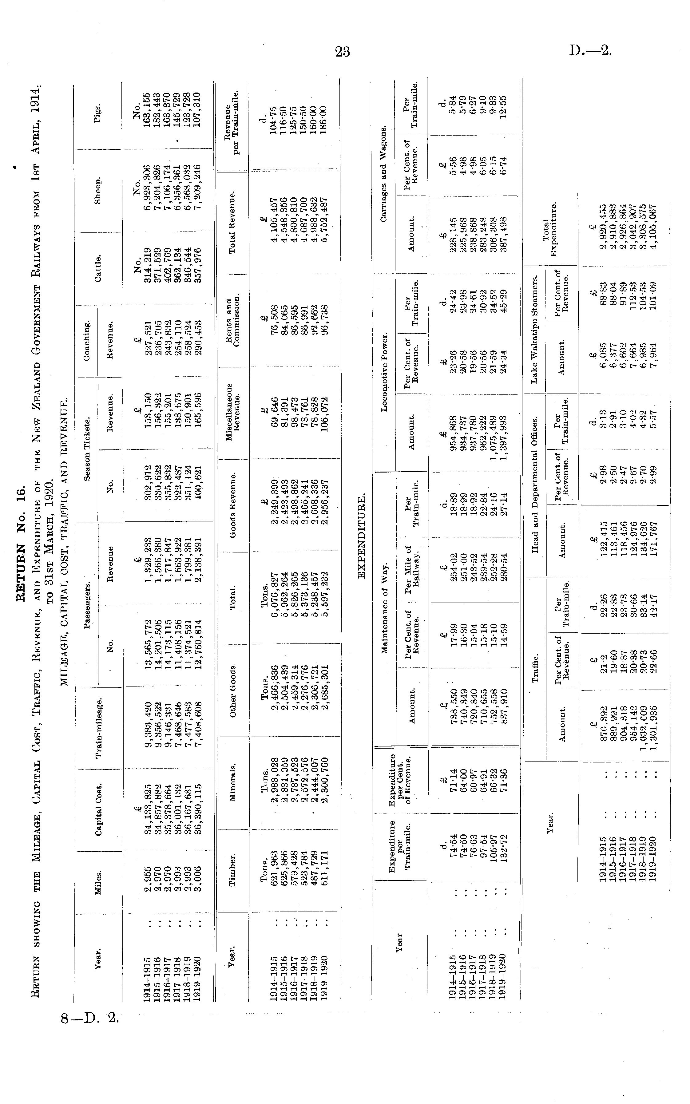 RETURN No. 16. Return showing the Mileage, Capital Cost, Traffic, Revenue, and Expenditure of the New Zealand Government Railways from 1st April, 1914, to 31st March, 1920. MILEAGE, CAPITAL COST, TRAFFIC, AND REVENUE.