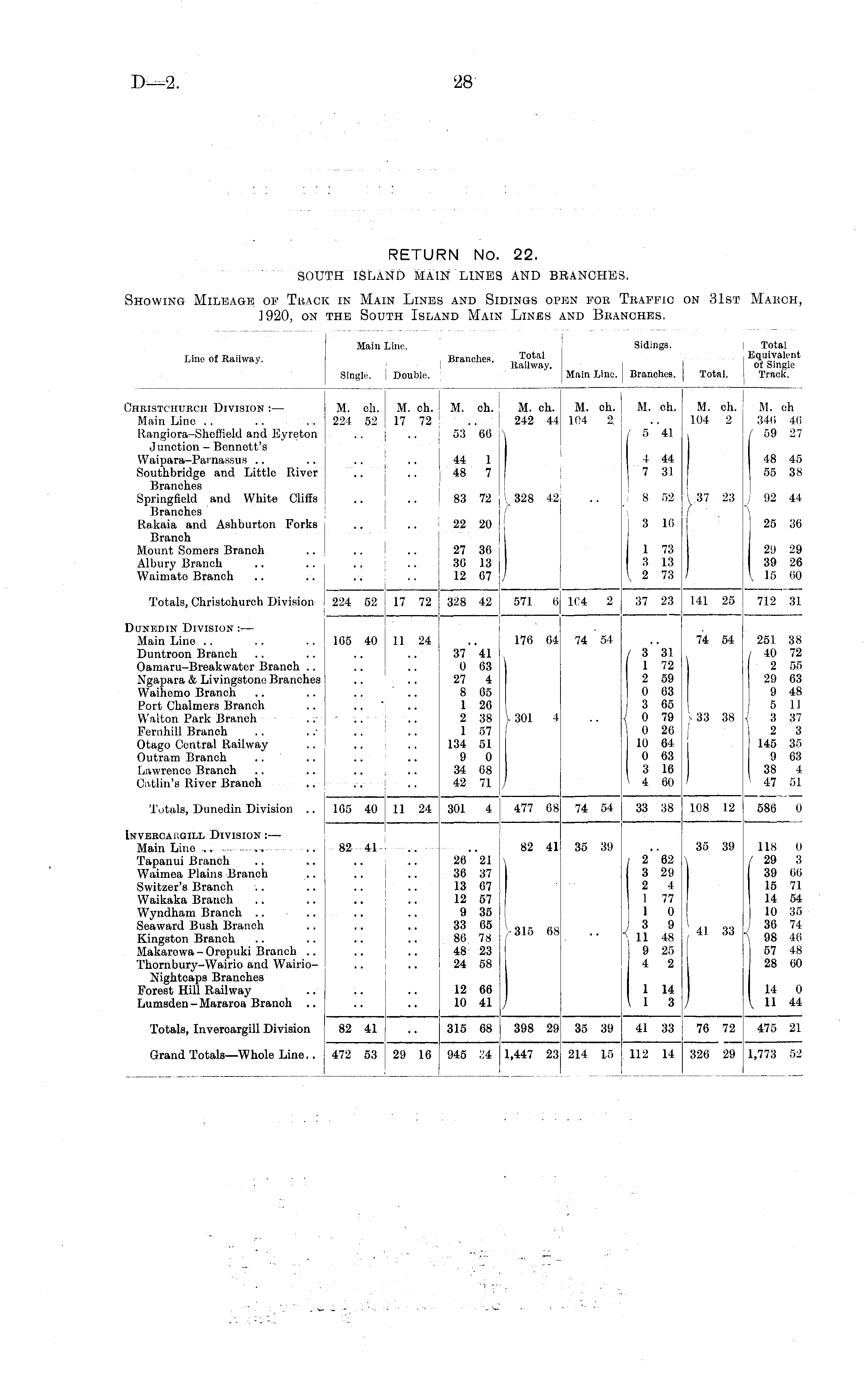 RETURN No. 22. SOUTH ISLAND MAIN LINES AND BRANCHES. Showing Mileage of Track in Main Lines and Sidings open for Traffic on 31st March, 1920, on the South Island Main Lines and Branches.