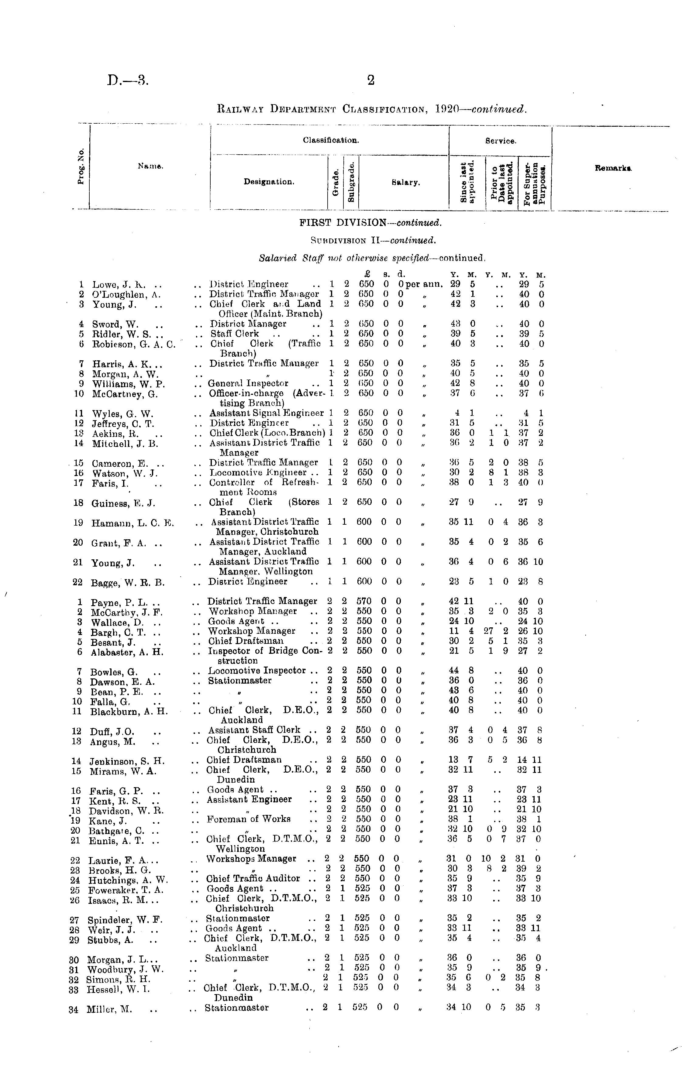 d z ti Name. o o. a 0 z rib O A. a Classification. Service. 9 SI' .WTi i H fl si !: -°SJ «i! „ 13 * •"• ri ,flfl « ftn co Designation. g ft. Salary. gg g „.g »<o t« ao ce w at £c" alp-i B« OS'S o „ — a So 09~s fl 9. }? cd a 55=S" Service. a.i» co a fl o to s a k n a 3 fl fl ft, atP-i ] Rem. Renuirkt. mrlj FIRST DIVISION— continued. Subdivision II— continued. Salaried Staff not otherwise specified —continued, 1 Lowe, -1. K. . ■ 2 O'Loughlen, A. 3 Young, J. 4 Sword, W. 5 Ridler, W. S. .. 6 Robicson, G. A. 0. 7 Harris, A. K. .. 8 Morgan, A. W. 9 Williams, W. P. 10 McCartney, G. 11 Wyles, G. W. 12 Jeffreys, C T. 13 Aekins, R. 14 Mitchell, J. B. 15 Cameron, E. .. 16 Watson, W. J. 17 Faris, I. 18 Guincss, E. J. 19 Hamaim, L. 0, E, 20 Grant, F. A. .. 21 Young, J. 22 Bagge, W. R. B. £ s. d. Y. m. v. M. Y. M. .. District Engineer ..12 650 0 Oporann. 29 5 .. 29 5 .. District Traffic Manager 1 2 650 0 0 „ 42 1 40 0 .. Chief Clerk ai.d Land 1 2 650 0 0 „ 42 3 ..40 0 Officer (Maint. Branch) .. District Manager ..12 650 00 , 43 0 40 0 .. Staff Clerk .. ..12 650 00 „ 39 5 39 5 .. Chief Clerk (Traffic 1 2 650 0 0 , 40 3 .. 40 0 Branch) .. District Traffic Manager 1 2 650 0 0 „ 35 5 35 5 12 650 0 0 „ 40 5 .. 40 0 .. Genera! Inspector ..12 650 00 „ 42 8 40 0 .. Officer-in-charge (Adver- 1. 2 650 0 0 „ 37 6 .. 37 6 tising .Branch) .. Assistant Signal Engineer 1 2 650 0 0 , 4 1 .. 4 1 .. District Engineer ..12 050 0 0 , 31 5 .. 81 5 .. Chief Clerk (Loco.Branch) 1 2 650 0 0 36 0 1 1 37 2 .. Assistant District Traffic 1 2 650 0 0 „ 36 2 1 0 37 2 Manager .. District Traffic Manager I 2 050 0 0 „ 86 5 2 0 38 5 .. Locomotive Engineer ..12 050 00 „ 30 2 8 1 38 3 .. Controller of Refresh- 1 2 650 0 0 „ 38 0 1 3 40 0 ment Rooms .. Chief Clerk (Stores 1 2 650 0 0 „ 27 9 .. 27 9 Branch) .. Assistant District Traffic 1 1 600 0 0 „ 85 11 0 4 36 3 Manager, Christohureh .. Assistant District Traffic 1 1 600 0 0 „ 35 4 0 2 35 6 Manager, Auckland .. Assistant District Traffic 1 1 600 0 0 „ 86 4 0 6 36 10 Manager. Wellington .. District Engineer ..11 600 0 0 „ 23 5 1 0 23 8 1 Payne, P. L. .. 2 McCarthv, J. F. 3 Wallace,"D. .. 4 Bargb.C T. .. 5 Besant, J. 6 Alabaster, A. H. 7 Bowlos, G. 8 Dawson, E. A. 9 Bean, P. E. 10 Falla, G. 11 Blackburn, A. H. 12 Duff, J.O. 13 Angus, M. 14 Jenkinson, S. H. 15 Mirams, W. A. 16 Faris, G. P. 17 Kent, R. S. .. 18 Davidson, W. R. 1.9 Kane, J. 20 Bathgate, 0. .. 21 Eunis, A. T. .. 22 Laurie, F. A... 23 Brooks, H. G. 24 Hutchings, A. W. 25 Foweraker. T. A. 26 Isaacs, R. M. .. 27 Spindeler, W. F. 28 Weir, J. J. .. 29 Stubbs, A. 30 Morgan, J. L... 31 Woodbury, J. W. 32 Simons, R. H. 33 Hessell, W. I. 34 Miller, M. .. District Traffic Manager 2 2 570 0 0 „ 42 11 40 0 .. Workshop Manager ..22 550 00 „ 35 3 2 0 35 8 .. Goods Agent .. ..2 2 550 0 0 „ 24 10 ..24 10 .. Workshop Manager ..22 550 00 „ 11 4 27 2 26 10 .. Chief Draftsman .. 2 2 550 0 0 „ 30 2 5 1 35 3 .. Inspector of Bridge Con- 2 2 550 0 0 21 5 1 9 27 2 struction .. Locomotive Inspector .. 2 2 550 0 0 „ 44 8 .. 40 0 .. Stationmaster .. 2 2 550 0 0 „ 36 0 .. 36 0 .. 2 2 550 0 0 „ 43 6 ..40 0 .. 2 2 550 0 0 „ 40 8 40 0 .. Chief Clerk, D.E.O., 2 2 550 0 0 „ 40 8 ..40 0 Auckland .. Assistant Staff Clerk ..22 550 0 0 , 37 404 37 8 .. Chief Clerk, D.E.O., 2 2 550 0 0 . 36 3 0 5 30 8 Christohureh .. Chief Draftsman ..22 550 0 0 13 7 5 2 14 11 .. Chief Clerk, D.E.O., 2 2 550 0 0 „ 32 11 ..32 11 Dunedin .. Goods Agent .. ..2 2 550 0 0 „ 37 3 ..37 3 .. Assistant Engineer ..22 550 0 0 „ 23 11 .. 23 11 ..2 2 550 0 0 , 21 10 .. 21 10 .. Foreman of Works .. 2 2 550 0 0 „ 38 1 .. 38 1 .. 2 2 550 0 0 „ 32 10 0 9 32 10 .. Chief Clerk, D.T.M.O., 2 2 550 0 0 „ 36 5 0 7 37 0 Wellington . Workshops Manager .. 2 2 550 0 0 „ 31 0 10 2 31 0 .. 2 2 550 0 0 30 3 8 2 89 2 .. Chief Traffic Auditor ..22 550 0 0 „ 35 9 .. 35 9 .. Goods Agent .. .. 2 1 525 0 0 „ 37 3 .. 37 8 .. Chief Clerk, D.T.M.O., 2 1 525 0 0 „ 38 10 ..33 10 Christohureh .. Stationmaster ..2 1 525 0 0 „ 35 2 35 2 .. Goods Agent .. ..21 525 0 0 „ 33 11 .. 38 11 .. Chief Clerk, D.T.M.O., 2 1 525 0 0 , 35 4 .. 35 4 Auckland .. Stationmaster ..2 1 525 0 0 „ 36 0 36 0 .. 2 1 525 0 0 „ 35 9 .. 35 9 . .. 2 1 525 0 0 , 85 6 0 2 35 8 .. Chief Clerk, D.T.M.O., 2 1 525 0 0 „ 34 3 .. 34 8 Dunedin .. Stationmaster ..21 525 0 0 „ 34 10 0 5 35 3