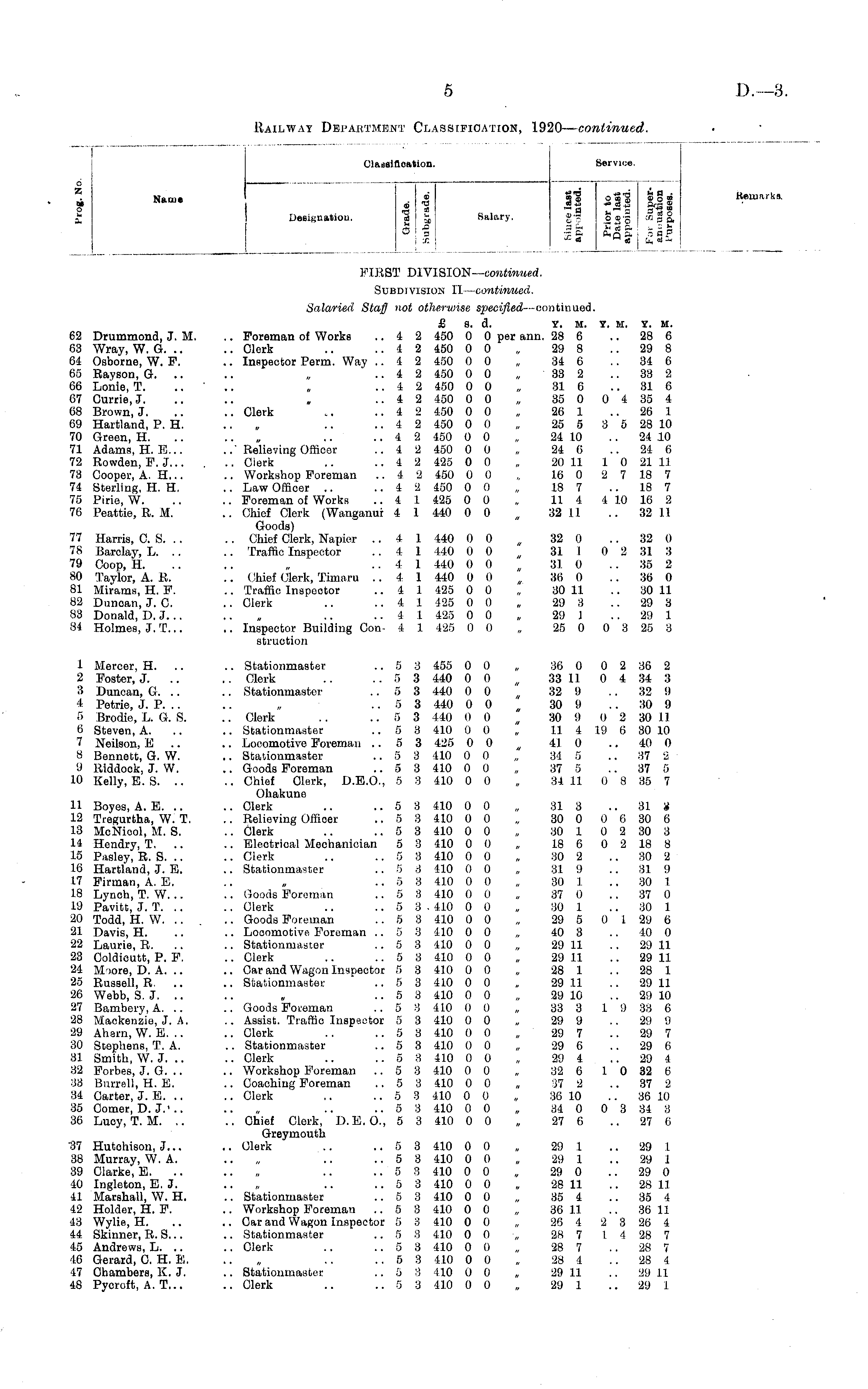 Classification. Service. CO S3 Name o fa oz no 0 fa a. ■ rS ft &$% lis 1 is ? ,,, r»»MflflaS I Designation, a ~ c Salary. g-a o®'S "' g o, Or .2 3h fcmC O J; W 3 7f HlOt, 3d? j ;C * M CO i. Cl r Reumrku, FIRST DIVISION— continued. Subdivision II— continued. 62 Drummond, J. M. 63 Wray, W. G. 64 Osborne, W. F. 65 Rayson, G. 66 Lonie, T. 67 Ourrie, J. 68 Brown, J. 69 Hartland, P. H. 70 Green, H. 71 Adams, H. E... 72 Rowden, F. J... 73 Cooper, A. H... 74 Sterling, H. H 75 Pirie, W. 76 Peattie, R. M. 77 Harris, C. S. 78 Barclay, L. .. 79 Coop, H. 80 Taylor, A. R. 81 Mirams, H. F. 82 Dunoan, J. 0. 83 Donald, D. J... 84 Holmes, J. T... Salaried Staff not otherwise specified —continued. £ S. d. Y. M. Y. M. Y. M. .. Foreman of Works .. 4 2 450 0 0 per ann. 28 6 .. 28 6 .. Olerk .. .. 4 2 450 0 0 „ 29 8 29 8 .. Inspector Perm. Way .. 4 2 450 0 0 „ 34 6 .. 34 6 .. 4 2 450 0 0 33 2 33 2 ■ .. „ .. 4 2 450 0 0 „ 31 6 31 6 .. 4 2 450 0 0 35 0 0 4 35 4 .. Olerk „. .. 4 2 450 0 0 „ 26 1 .. 26 1 .. 4 2 450 0 0 „ 25 5 3 5 28 10 .. 4 2 450 0 0 „ 24 10 .. 24 .10 .. Relieving Officer .. 4 2 450 0 0 „ 24 6 .. 24 6 .. Olerk .. .. 4 2 425 0 0 „ 20 11 1 0 21 11 .. Workshop Foreman .. 4 2 450 0 0 „ 16 0 2 7 18 7 .. Law Officer .. .. 4 2 450 0 0 „ 18 7 .. 18 7 .. Foreman of Works .. 4 1 425 0 0 „ 11 4 4 10 16 2 .. Chief Clerk (Wanganui 4 I 440 0 0 „ 32 11 .. 32 II Goods) .. Chief Clerk, Napior .. 4 1 440 0 0 „ 32 0 .. 32 0 .. Traffic Inspector ..41 440 0 0 „ 31 I 0 2 31 3 .. 4 1 440 0 0 / 31 0 .. 35 2 .. Chief Clerk, Timo.ru ..41 440 0 0 36 0 .. 36 0 .. Traffic Inspector ..41 425 0 0 „ 30 11. .. 30 11 .. Olerk .. .. 4 1 425 0 0 „ 29 8 .. 29 3 ..41 425 0 0 „ 29 1 .. 29 1 .. Inspector Building Con- 4 1 425 0 0 „ 25 0 0 3 25 3 struction ■ 1 Mercer, H. 2 Foster, J. 3 Duncan, G. .. 4 Petrie, J. P. .. 5 Brodio, L. G. S. 6 Steven, A. 7 Neilson, E .. 8 Bennett, G. W. 9 Riddock, J. W. 10 Kelly, E. S. 11 Boyes, A. E. 12 Tregurtha, W. T. 13 MoNiool, M. S. 14 Hendry, T, .. 15 Pasley, R. S. 16 Hartland, J. E. 17 Firman, A. E. 18 Lynch, T. W. .. 19 Pavitt, J. T. .. 20 Todd, H. W. 21 Davis, H. 22 Laurie, R. .. 23 Ooldicutt, P. F. 24 Moore, D. A. 25 Russell, R, 26 Webb, S.J. 27 Bambery, A. .. 28 Mackenzie, J. A. 29 Abern, W. E, .. 30 Stephens, T. A. 31 Smith, W. J. .. 32 Forbes, J. G. .. 33 Bnrrell, H. E. 34 Carter, J. E. .. 35 Comer, D. J.' .. 36 Lucy, T. M. 37 Hutchison, J... 38 Murray, W. A. 39 Clarke, E. 40 Ingleton, E.J. 41 Marshall, W. H. 42 Holder, H. F. 43 Wylie, H. 44 Skinner, R. S... 45 Andrews, L. .. 46 Gerard, O, H. E. 47 Chambers, K. J. 48 Pycroft, A. T... .. Stationmaster .. 5 3 455 0 0 „ 36 0 0 2 36 2 .. Clerk .. ..5 3 440 0 0 „ 33 11 0 4 34 3 .. Stationmaster .. 5 3 440 0 0 32 9 .. 32 9 .. 5 3 440 0 0 „ 30 9 .. 30 9 .. Clerk .. ..5 3 440 0 0 „ 30 9 0 2 30 II .. Stationmaster ..5 3 410 0 0 „ 11 4 19 6 30 10 .. Locomotive Foreman .. 5 3 425 0 0 „ 41 0 .. 40 0 .. Stationmaster .. 5 3 410 0 0 „ 34 5 .. 37 2 .. Goods Foreman .. 5 3 410 0 0 „ 37 5 37 5 .. Chief Clerk, D.E.O., 5 3 410 0 0 „ 31 11 0 8 35 7 Ohakune .. Clerk .. .. 5 3 410 0 0 „ 31 3 81 8 .. Relieving Offioer .. 5 3 410 0 0 „ 30 0 0 6 30 6 .. Clerk .. .. 5 3 410 0 0 „ 30 1 0 2 30 3 .. Electrical Mechanician 5 3 410 0 0 „ 18 6 0 2 18 8 .. Clerk .. ..5 3 410 0 0 „ 30 2 .. 30 2 .. Stationmaster .. 5 3 410 0 0 „ 31 9 .. 31 9 ..5 3 41.0 0 0 „ 30 1 .. 30 1 .. Goods Foreman .. 5 3 410 0 0 „ 37 0 .. 37 0 .. Olerk .. .. 5 3 . 410 0 0 „ 30 1 .. 30 1 .. Goods Foreman .. 5 3 410 0 0 29 5 0 1 29 6 .. Looomotive Foreman .. 5 3 410 0 0 „ 40 3 .. 40 0 .. Stationmaster .. 5 3 410 0 0 „ 29 11 29 11 .. Olerk .. ..5 3 410 0 0 „ 29 11 ..29 11 .. Oar and Wagon Inspector 5 3 410 0 0 „ 28 1 28 1 .. Stationmaster .. 5 3 410 0 0, 29 11 .. 29 11 ..5 3 410 0 0 „ 29 10 .. 29 10 .. Goods Foreman .. 5 3 410 0 0 „ 33 3 1 9 33 6 .. Assist. Traffic, Inspector 5 3 410 0 0 „ 29 9 .. 29 9 .. Olerk .. ..53 410 0 0 „ 29 7 29 7 .. Stationmaster ..5 3 410 0 0 „ 29 6 29 6 .. Olerk .. .. 5 3 410 0 0 „ 29 4 .. 29 4 .. Workshop Foreman .. 5 3 410 0 0 „ 32 6 1 0 32 6 .. Coaching Foreman .. 5 3 410 0 0 „ 37 2 37 2 .. Clerk .. ..53 410 0 0 „ 36 10 36 10 .. .. ..5 3 410 0 0 „ 34 0 0 3 34 3 .. Chief Olerk, D.E.O., 5 3 410 0 0 „ 27 6 ..27 6 Greymouth .. Clerk .. .. 5 3 410 0 0 „ 29 1 .. 29 1 .. 5 3 410 0 0 „ 29 1 .. 29 1 .. .. .. 5 3 410 0 0 „ 29 0 .. 29 0 .. 5 3 410 0 0 „ 28 11 .. 28 11 .. Stationmaster .. 5 3 410 0 0 „ 35 4 ..35 4 .. Workshop Foreman .. 5 3 410 0 0 „ 36 11 36 11 .. Car and Wagon Inspector 5 3 410 0 0 „ 26 4 2 3 26 4 .. Stationmaster .. 5 3 410 0 0 „ 28 7 1. 4 28 7 .. Olerk .. .. 5 3 410 0 0 „ 28 7 .. 28 7 ..5 3 410 0 0 „ 28 4 .. 28 4 .. Stationmaster .. 5 3 410 0 0 „ 29 11 .. 29 II .. Olerk .. ..5 3 410 0 0 „ 29 1 .. 29 1