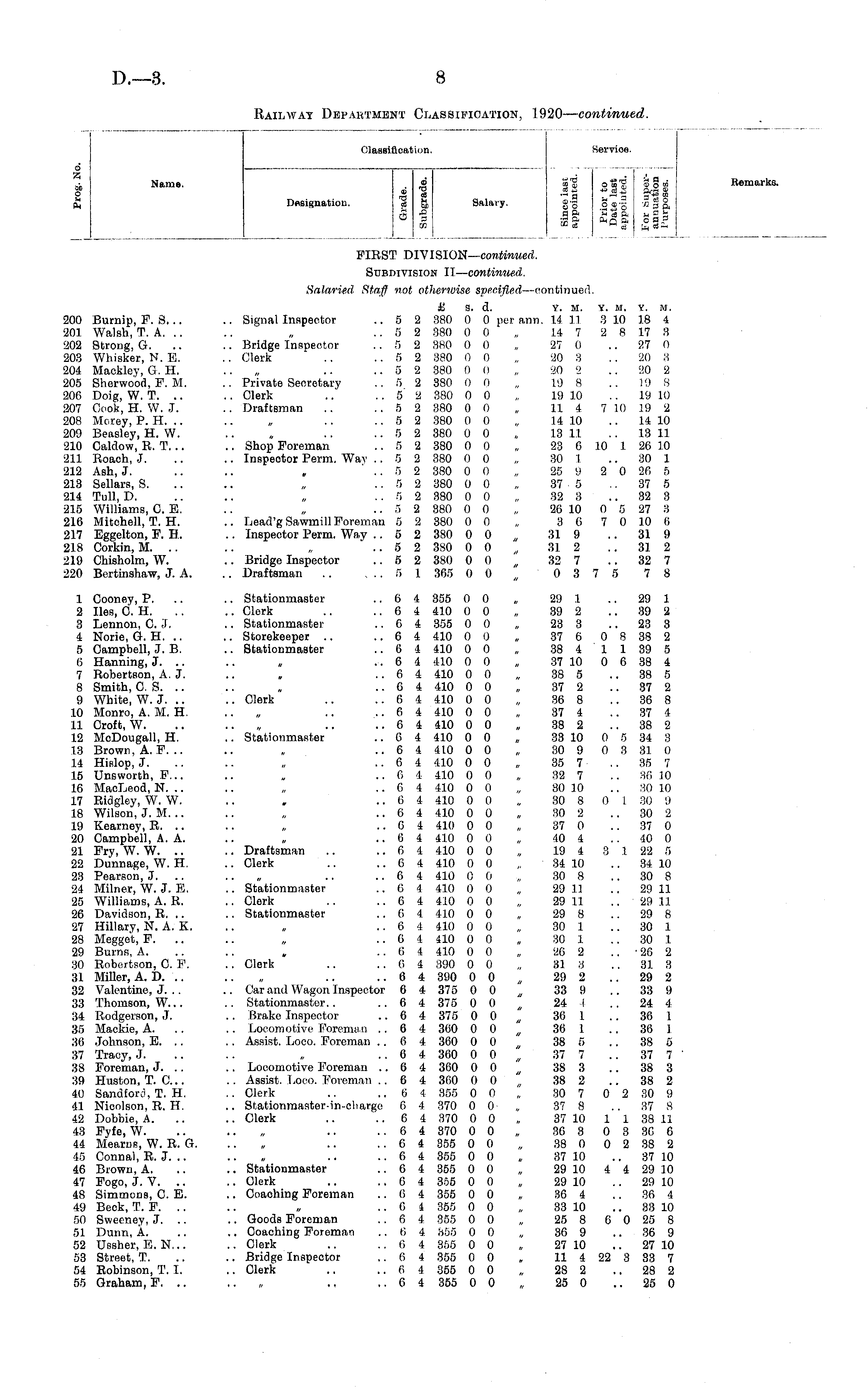 I Classification. Service d K oil Name. o 6 12! Oft o u ■HI . o si °»i is>! • .§ .2 2 *■£* KB1 Designation, cs ft Salary. g-g Sco-g oo § a, ° 3 too» Oh n p, o fl P cc t £ ce w cd is, 3 £- Remarks. FIRST DIVISION— continued. Subdivision II— continued. 200 Burnip, F. S... 201 Walsh, T. A. .. 202 Strong, G. 203 Whisker, N. E. 204 Mackley, G. H. 205 Sherwood, F. M. 206 Doig, W. T. .. 207 Cook, H. W. J. 208 Morey, P. H. .. 209 Beasley, H. W. 210 Caldow, R. T. .. 211 Roach, J. 212 Ash, J. 213 Sellars, S. 214 Tull, D. 215 Williams, 0. E. 216 Mitchell, T. H. 217 Eggelton, F. H. 218 Corkin, M. .. 219 Chisholm, W. 220 Bertinshaw, J. A. Salaried. Staff not otherwise specified —continued. £ s. d. y. m. y. m. y. m. .. Signal Inspector ..5 2 380 0 0 per ann. 14 11 3 10 18 4 ..5 2 380 0 0 „ 14 7 2 8 17 3 .. Bridge Inspector .. 5 2 380 0 0 „ 27 0 .. 27 0 .. Clerk .. ..52 380 0 0 „ 20 3 .. 20 3 .. „ .. .. 5 2 880 0 0 „ 20 2 .. 20 2 .. Private Secretary .. 5 2 380 0 0 „ 19 8 .. 19 S .. Clerk .. ..52 380 0 0 „ 19 10 .. 19 10 .. Draftsman .. ..5 2 880 0 0 „ 11 4 7 10 19 2 .. 5 2 380 0 0 „ 14 10 14 10 .. 5 2 380 0 0 „ 13 11 .. 13 11 .. Shop Foreman .. 5 2 380 0 0 „ 23 6 10 1 26 10 .. Inspector Perm. Wav .. 5 2 380 0 0 „ 30 1 .. 30 1 .. 5 2 380 0 0 „ 25 9 2 0 26 5 ..52 380 00 „ 37 5 .. 37 5 .. 5 2 380 0 0 „ 32 3 .. 32 3 ..52 380 00 „ 26 10 0 5 27 3 .. Lead'g Sawmill Foreman 5 2 380 0 0 „ 3 6 7 0 10 6 .. Inspector Perm. Way ..52 380 0 0 „ 31 9 31 9 .. 5 2 380 0 0 31 2 .. 31 2 .. Bridge Inspector .. 5 2 380 0 0 „ 32 7 .. 32 7 .. Draftsman 5 1 365 0 0 „ 0 3 7 5 7 8 1 Gooney, P. 2 lies, 0. H. 3 Lennon, 0. cT. 4 Norie, G. H. 5 Campbell, ,7. B. 6 Hanning, 3. .. 7 Robertson, A. J. 8 Smith, OS. 9 White, W.J. .. 10 Monro, A. M. H. 11 Croft, W. 12 McDougall, H. 13 Brown, A. F. .. 14 Hislop, J. 15 Unswortb, F... 16 MacLeod, N. .. 17 Ridgley, W. W. 1.8 Wilson, J. M. .. 19 Kearney, R. .. 20 Campbell, A. A. 21 Fry, W. W. 22 Dunnage, W. H. 23 Pearson, J. 24 Milner, W. J. B, 25 Williams, A. R. 26 Davidson, R. .. 27 Hillary, N. A. K. 28 Megge't, F. 29 Burns, A. 30 Robertson, 0. F. 31 Miller, A. D. 32 Valentine, J. .. 33 Thomson, W... 34 Rodgorson, J. 35 Mackie, A. 36 Johnson, E. .. 37 Tracy, J. 38 Foreman, J. .. 39 Huston, T. 0... 40 Sandiord, T. H. 41 Nicolson, R. H. 42 Dobbie, A. 43 Fyfe, W. 44 Mearns, W. R. G. 45 Connal, R. J. .. 46 Brown, A. 47 Fogo, J. V. 48 Simmons, 0. E. 49 Beck, T. F. .. 50 Sweeney, J. .. 51 Dunn, A. 52 Usshor, E. N... 53 Street, T. 54 Robinson, T. I. 55 Graham, F. .. .. Stationmaster .. 6 4 355 0 0 „ 29 1 .. 29 1 .. Clerk .. .. 6 4 410 0 0 „ 39 2 .. 39 2 .. Stationmaster .. 6 4 355 0 0 „ 23 3 .. 23 3 .. Storekeeper .. .. 6 4 410 0 0 „ 37 6 0 8 38 2 .. Stationmaster ..6 4 410 0 0 „ 38 4 1 1 39 5 .. 6 4 410 0 0 „ 37 10 0 6 38 4 .. 6 4 410 0 0 „ 38 5 ..38 5 .. 6 4 410 0 0 „ 37 2 37 2 .. Clerk .. .. 6 4 410 0 0 „ 36 8 .. 36 8 .. .. .. 6 4 410 0 0 „ 37 4 37 4 .. .. .. 6 4 410 0 0 „ 38 2 38 2 .. Stationmaster .. 6 4 410 0 0 „ 33 10 0 5 34 3 .. 6 4 410 0 0 30 9 0 3 31 0 ,. 6 4 410 0 0 35 7 .. 35 7 .. 6 4 410 0 0 32 7 .. 36 10 .. 6 4 410 0 0 „ 30 10 .. 30 10 ..6 4 410 0 0 „ 30 8 0 1 30 9 .. 6 4 410 0 0 30 2 .. 30 2 ..04 410 0 0 „ 37 0 .. 37 0 ..6 4 410 0 0 „ 40 4 40 0 .. Draftsman .. .. 6 4 410 0 0 „ 19 4 3 1 22 5 .. Clerk .. .. 6 4 410 0 0 , 34 10 .. 84 10 .. 6 4 410 0 0 „ 30 8 .. 30 8 .. Stationmaster .. 6 4 410 0 0 „ 29 11 .. 29 11 .. Clerk .. ..6 4 410 0 0 „ 29 11 .. 29 11 .. Stationmaster .. 6 4 410 0 0 „ 29 8 .. 29 8 ..6 4 410 0 0 „ 30 1 .. 30 .1 .. 6 4 410 0 0 30 1 .. 30 1 ..64 410 00 „ 26 2 .. • 26 2 .. Clerk .. ..64 390 0 0 „ 31 3 .. 31 3 .. 6 4 390 0 0 29 2 .. 29 2 .. Car and Wagon Inspector 6 4 375 0 0 „, 33 9 .. 33 9 .. Stationmastor.. .. 6 4 375 0 0 „ 24 1 , . 24 4 .. Brake Inspector .. 6 4 375 0 0 „ 36 1 .. 36 1 .. Locomotive Foreman .. 6 4 360 0 0 „ 36 1 .. 36 1 .. Assist. Loco. Foreman .. 6 4 360 0 0 38 5 .. 38 5 .. 6 4 360 0 0 „ 37 7 .. 37 7 .. Locomotive Foreman ..64 360 0 0 , 38 3 .. 38 3 . . Assist. Loco. Foreman ..64 360 0 0 " 38 2 .. 38 2 .. Clerk .. ..64 355 0 0 „ 30 7 02 30 9 .. Stationmaster-in-charge 6 4 370 0 0 „ 37 8 .. 37 8 .. Clork .. ..6 4 370 0 0 „ 37 10 1 1 38 11 .. 6 4 370 0 0 36 3 0 3 36 6 .. C 4 355 0 0 „ 38 0 0 2 38 2 .. 6 4 355 0 0 , 37 10 .. 37 10 .. Stationmaster ..64 355 0 0 „ 29 10 44 29 10 .. Clerk .. .. 6 4 355 0 0 „ 29 10 .. 29 10 .. Coaching Foreman ..64 355 00 „ 86 4 36 4 ..6 4 355 0 0 „ 33 10 .. 33 10 .. Goods Foreman ..64 355 00 „ 25 8 6 0 25 8 .. Coaching Foreman ,. 6 4 355 0 0 „ 36 9 36 9 .. Olerk .. ..6 4 855 0 0 , 27 10 ..27 10 .. Bridge Inspector .. 6 4 355 0 0 „ 11 4 22 3 33 7 .. Clerk .. ..6 4 355 0 0 „ 28 2 .. 28 2 .. 6 4 355 0 0 „ 25 0 .. 25 0