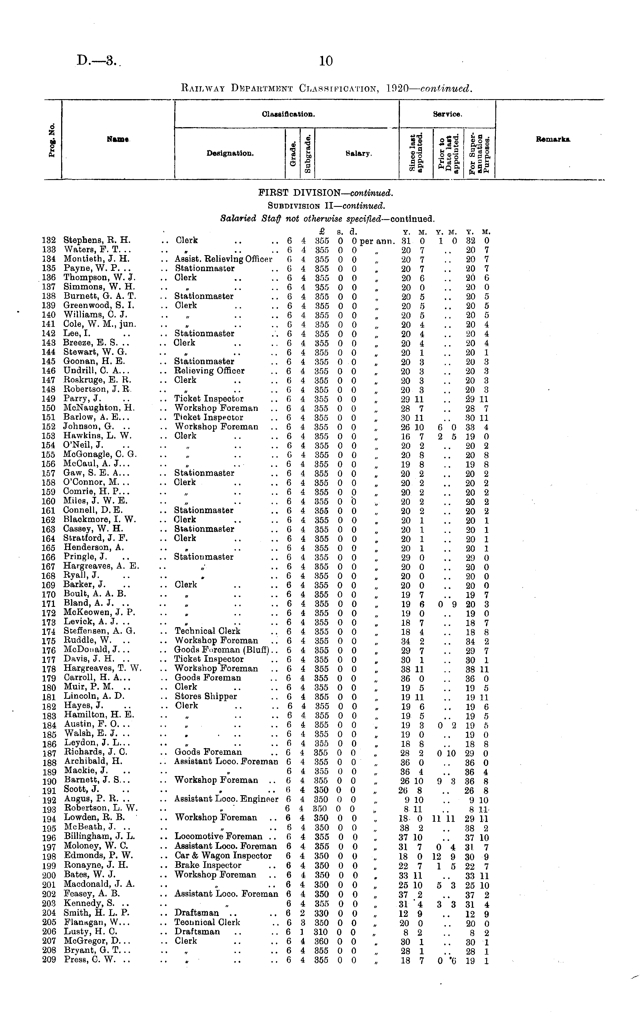 Olatieincation. Service. m ah O Nam* s J* fl CO il 9 2 a a Egh= s 2 B,2a, b „.S B, <e o .2 3 3 m fl a 'i cd & h 2 a Ph o a o a = — cfl £ *Ps Remarks. Designation. <D m 5 S alary. FIRST DIVISION— continued. Subdivision II— continued. 132 Stephens, R. H. 133 Waters, F. T. .. 134 Montieth, J. H. 135 Payne, W. P. .. 136 Thompson, W. J. 137 Simmons, W. H. 138 Burnett, G. A. T. 139 Greenwood, S. I. 140 Williams, 0. J. 141 Cole, W. M., jun. 142 Lee, I. 143 Breeze, E. S. .. 144 Stewart, W. G. 145 Goonan, H. E. 146 Undrill, 0. A... 147 Roskruge, E. R. 148 Robertson, J. R 149 Parry, J. 150 McNaughton, H. 151 Barlow, A. E... 152 Johnson, G. .. 153 Hawkins, L. W. 154 O'Neil, J. 155 McGonagle, 0. G. 156 McCaul, A, J... 157 Gaw, S. E. A... 158 O'Connor, M. .. 159 Comrie, H. P... 160 Miles, J. W. E. 161 Connell, D.E. 162 Blackmore, I. W. 163 Cassey, W. H. 164 Stratford, J. F. 165 Henderson, A. 166 Pringle, J. 167 Hargreaves, A. E. 168 Ryall.J. 169 Barker, J. 170 Boult, A. A. B. 171 Bland, A. J. .. 172 McKeowen, J. P. 173 Levick, A. J. 174 Steffensen, A. G. 175 Ruddle, W. .. 176 McDonald, J. .. 177 Davis, J. H. 178 Hargreaves, T. W. 179 Carroll, H. A... 180 Muir, P. M. 181 Lincoln, A. D. 182 Hayes, J. 183 Hamilton, H. E. 184 Austin, F. 0. .. 185 Walsh, E. J. 186 Leydon, J. L... 187 Richards, J. C 188 Archibald, H. 189 Mackie, J. 190 Barnett, J. S... 191 Scott, J. 192 Angus, P. R. .. ig;oj Robertson, L. W. ig4 Lowden, R. B. 195 McBeath, J. .. 196 Billingham, J. L. 197 Moloney, W. C 198 Edmonds, P. W. ig9 Ronayne, J. H. 200 Bates', W. J. 201 Macdonald, J. A. 202 Feasey, A. B. 203 Kennedy, S. .. 204 Smith, H. L. P. 205 Flanagan, W... 206 Lusty, H. C. 207 McGregor, D... 208 Brvant, G. T. .. 209 Press, O. W. Salaried Staff not otherwise specified —continued. £ S. d. Y. M. Y. M. Y. M. .. Clerk .. .. 6 4 355 0 0 per ann. 31 0 1 0 32 0 .. 6 4 355 0 0 „ 20 7 .. 20 7 .. Assist. Relieving Officer 6 4 355 0 0 „ 20 7 20 7 .. Stationmaster .. 6 4 355 0 0 „ 20 7 .. 20 7 .. Clerk .. .. 6 4 355 0 0 „ 20 6 20 6 .. 6 4 355 0 0 „ 20 0 20 0 .. Stationmaster .. 6 4 355 0 0 „ 20 5 .. 20 5 .. Clerk .. .. 6 4 355 0 0 „ 20 5 20 5 .. 6 4 355 0 0 „ 20 5 .. 20 5 .. 6 4 355 0 0 „ 20 4 20 4 .. Stationmaster .'. 6 4 355 0 0 „ 20 4 20 4 • • Clerk .. .. 6 4 355 0 0 „ 20 4 .. 20 4 .. 6 4 355 0 0 „ 20 1 20 1 .. Stationmaster .. 6 4 355 0 0 „ 20 3 .. 20 3 .. Relieving Officer .. 6 4 355 0 0 „ 20 3 .. 20 3 .. Clerk .. .. 6 4 355 0 0 „ 20 3 .. 20 3 .. 6 4 355 0 0 „ 20 3 .. 20 3 .. Ticket Inspector ..64 355 0 0 „ 29 11 29 11 .. Workshop Foreman .. 6 4 355 0 0 „ 28 7 .. 28 7 .. Tioket Inspector .. 6 4 355 0 0 „ 30 11 .. 30 11 .. Workshop Foreman .. 6 4 355 0 0 „ 26 10 6 0 33 4 .. Clerk .. .. 6 4 355 0 0 „ 16 7 2 5 19 0 .. 6 4 355 0 0 „ 20 2 20 2 .. 0 4 355 0 0 „ 20 8 20 8 .. 6 4 355 0 0 „ 19 8 19 8 .. Stationmaster .. 6 4 355 0 0 „ 20 2 .. 20 2 .. Clerk .. .. 6 4 355 0 0 „ 20 2 .. 20 2 .. 6 4 355 0 0 „ 20 2 .. 20 2 .. 6 4 355 0 0 „ 20 2 20 2 .. Stationmaster .. 6 4 35-5 0 0 „ 20 2 .. 20 2 • • Clerk .. .. 6 4 355 0 0 „ 20 1 .. 20 1 .. Stationmaster .. 6 4 355 0 0 „ 20 1 .. 20 1 .. Clerk .. .. 6 4 355 0 0 „ 20 1 .. 20 1 .. 6 4 355 0 0 „ 20 1 20 1 .. Stationmaster ..64 355 00 „ 29 0 29 0 .. 6 4 355 0 0 „ 20 0 20 0 .. 6 4 355 0 0 „ 20 0 20 0 .. Clerk .. .. 6 4 355 0 0 „ 20 0 .. 20 0 .. 6 4 355 0 0 „ 19 7 .. 19 7 .. 6 4 355 0 0 „ 19 6 0 9 20 3 .. 6 4 355 0 0 „ 19 0 19 0 .. 6 4 355 0 0 „ 18 7 18 7 .. Technical Clerk .. 6 4 355 0 0 „ 18 4 .. 18 8 .. Workshop Foreman .. 6 4 355 0 0 „ 34 2 .. 34 2 .. Goods Foreman (Bluff).. 6 4 355 0 0 „ 29 7 29 7 .. Ticket Inspector .. 6 4 355 0 0 „ 30 1 .. 30 1 .. Workshop Foreman .. 6 4 355 0 0 „ 38 11 .. 38 11 .. Goods Foreman .. 6 4 355 0 0 „ 36 0 .. 36 0 • • Clerk .. .. 6 4 355 0 0 „ 19 5 .. 19 5 .. Stores Shipper .. 6 4 355 0 0 „ 19 11 .. 19 11 • • Clerk .. .. 6 4 355 0 0 „ 19 6 .. 19 6 .. 6 4 355 0 0 „ 19 5 .. 19 5 .. 6 4 355 0 0 » 19 3 0 2 19 5 • .. .. 6 4 355 0 0 „ 19 0 .. 19 0 .. 6 4 355 0 0 „ 18 8 18 8 .. Goods Foreman .. 6 4 355 0 0 „ 28 2 0 10 29 0 .. Assistant Loco. Foreman 6 4 355 0 0 „ 36 0 36 0 6 4 355 0 0 „ 36 4 .. 36 4 .. Workshop Foreman .. 6 4 355 0 0 „ 26 10 9 3 36 8 ..6 4 350 0 0 „ 26 8 26 8 .. Assistant Loco. Engineer 6 4 350 0 0 „ 9 10 .. 9 10 6 4 350 0 0 „ 8 11 .. 8 11 .. Workshop Foreman ..64 350 00 „ 18 0 11 11 29 11 •. 6 4 350 0 0 38 2 38 2 .. Locomotive Foreman .. 6 4 355 0 0 „ 37 10 .. 37 10 .. Assistant Loco. Foreman 6 4 355 0 0 „ 31 7 0 4 31 7 .. Car & Wagon Inspector 6 4 350 0 0 18 0 12 9 30 9 .. Brake Inspector .. 6 4 350 0 0 „ 22 7 1 5 22 7 .. Workshop Foreman .. 6 4 350 0 0 „ 33 11 .. 33 11 •. 6 4 350 0 0 25 10 5 3 25 10 .. Assistant Loco. Foreman 6 4 350 0 0 „ 37 2 .. 37 2 6 4 355 0 0 31 4 3 3 31 4 .. Draftsman .. .. 6 2 330 0 0 „ 12 9 .. 12 9 .. Teotinical Clerk .. 6 3 350 0 0 „ 20 0 .. 20 0 .. Draftsman .. .. 6 1 310 0 0 „ 8 2 .. 8 2 -. Clerk .. .. 6 4 360 0 0 „ 30 1 .. 30 1 ■ • •• .. 6 4 355 0 0 „ 28 1 28 1 .. 6 4 355 0 0 „ 18 7 0 "6 19 1