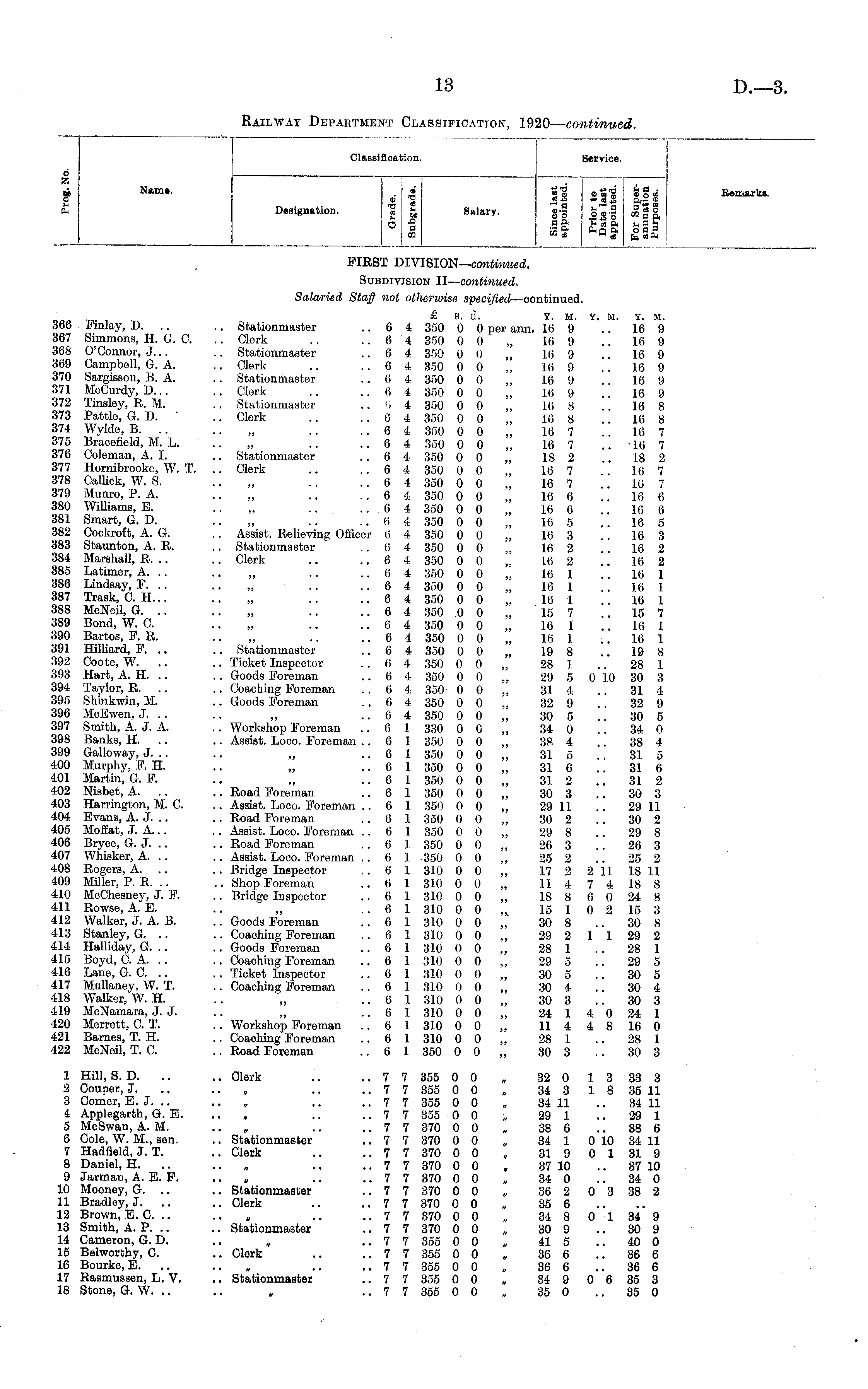 Classification. Service. 6 -A v. p 5-1 Nam*. Designation. % 2 2 v CD Salary. iS Sr* • O 2 CO -,.2 fl fl cd o 8 8 oj-g cogg, Sg- .KSa h 3 5 3 2" ft a a o a fl m « w a li, aft Remarks. FIRST DIVISION— eontimwd. Subdivision II— continued. 366 Finlay, D. .. 367 Simmons, H. G. C 368 O'Connor, J... 369 Campbell, G. A. 370 Sargisson, B. A. 371 McCurdy, D... 372 Tinsloy, R. M. 373 Pattle, G. D. ' 374 Wylde, B. .. 375 Bracefield, M. L. 376 Coleman, A. I. 377 Hornibrooke, W. T. 378 Callick, W. S. 379 Munro, P. A. 380 Williams, E. 381 Smart, G. D. 382 Cockroft, A. G. 383 Staunton, A. R. 384 Marshall, R. .. 385 Latimer, A. .. 386 Lindsay, F. .. 387 Irask, 0. H... 388 McNeil, G. .. 389 Bond, W. 0. 390 Bartos, F. R. 391 Hilliard, F. .. 392 Coote, W. .. 393 Hart, A. H. 394 Taylor, R. .. 395 Shinkwin, M. 396 MoEwen, J. .. 397 Smith, A. J. A. 398 Banks, H. .. 399 Galloway, J. .. 400 Murphy, F. H. 401 Martin, G. F. 402 Nisbet, A. .. 403 Harrington, M. C 404 Evans, A. J. .. 405 Moffat, J. A... 406 Bryce, G. J. .. 407 Whisker, A. .. 408 Rogers, A. 409 Miller, P. R. 410 McChesney, J. F. 411 Rowse, A. E. 412 Walker, ,J. A. B. 413 Stanley, G. .. 414 Halliday, G. .. 415 Boyd, C A. 416 Lane, G. C 417 Mullaney, W. T. 418 Walker, W. H. 419 McNamara, J. J. 420 Merrett, C. T. 421 Barnes, T. H. 422 McNeil, T. C. Salaried Staff not otherwise specified —oontinued. £ S. U. Y. M. Y. M. .. Stationmaster .. 6 4 350 0 0 per ann. 16 9 • • Clerk .. ..6 4 350 0 0 „ 16 9 .. Stationmaster .. 6 4 350 0 0 „ 16 9 • • Clork .. .. 6 4 350 0 0 „ 16 9 .. Stationmaster .. 6 4 350 0 0 ,, 16 9 • • Clerk .. .. 6 4 350 0 0 „ 16 9 .. Stationmaster .. 6 4 350 0 0 „ 16 8 • • Clerk .. .. 6 4 350 0 0 „ 16 8 .. 6 4 350 0 0 „ 16 7 .. 6 4 350 0 0 „ 16 7 .. Stationmaster .. 6 4 850 0 0 „ 18 2 .. Clerk .. .. 6 4 350 0 0 „ 16 7 .. 6 4 350 0 0 „ 16 7 •. 6 4 350 0 0 „ 16 6 ... .. 6 4 350 0 0 „ 16 6 •. 0 4 350 0 0 16 5 .. Assist. Relieving Officer 6 4 350 0 0 „ 16 3 .. Stationmaster .. 0 4 350 0 0 „ 16 2 .. Clerk .. .. 6 4 350 0 0 ,. 16 2 ,, .. .. 6 4 350 0 0 „ 16 1 .. 6 4 350 0 0 16 1 .. 6 4 350 0 0 16 1 .. 6 4 350 0 0 „ 15 7 .. 6 4 350 0 0 16 1 .. 6 4 350 0 0 „ 16 1 .. Stationmaster .. 6 4 350 0 0 „ 19 8 .. Ticket Inspector .. 6 4 350 0 0 28 I .. Goods Foreman .. 6 4 350 0 0 ,, 29 5 0 10 .. Coaching Foreman .. 6 4 350 0 0,, 31 4 .. Goods Foreman ..64 350 0 0 „ 32 9 „ .. 6 4 350 0 0 „ 30 5 .. Workshop Foreman .. 6 1 330 0 0 ,, 34 0 .. Assist. Loco. Foreman ..61 350 0 0 „ 38 4 ..6 1 350 0 0 „ 31 5 .. 6 1 350 0 0 „ 31 6 .. 6 1 350 0 0 „ 31 2 .. Road Foreman .. 6 1 350 0 0 „ 30 3 .. Assist. Loco. Foreman .. 6 1 350 0 0 „ 29 11 .. Road Foreman .. 6 1 350 0 0 „ 30 2 .. Assist. Loco. Foreman .. 6 1 350 0 0,, 29 8 .. Road Foreman .. 6 1 350 0 0 „ 26 3 .. Assist. Loco. Foreman ..61 350 00 ,, 25 2 .. Bridge Inspector .. 6 1 310 0 0,, 17 2 2 11 .. Shop Foreman .. 6 1 310 0 0 „ 11 4 7 4 .. Bridge Inspector ..61 31.0 0 0 „ 18 8 6 0 .. 6 1 310 0 0 „ 15 10 2 .. Goods Foreman .. 6 1 310 0 0 „ 30 8 .. Coaching Foreman .. 6 1 310 0 0,, 29 2 1 1 .. Goods Foreman .. 6 1 310 0 0 „ 28 1 .. Coaching Foreman .. 6 I 310 0 0 „ 29 5 .. Ticket Inspector ..61 310 0 0 „ 30 5 .. Coaching Foreman ..61 310 0 0 „ 30 4 .. 6 1 310 0 0 „ 30 3 .. 6 1 310 0 0 „ 24 1 4 0 . . Workshop Foreman .. 6 1 310 0 0 „ 114 4 8 .. Coaching Foreman .. 6 1 310 0 0,, 28 1 .. Road Foreman .. 6 1 350 0 0 „ 30 3 Y. M. 16 9 16 9 16 9 16 9 16 9 16 9 16 8 16 8 16 7 10 7 18 2 16 7 16 7 16 6 16 6 16 5 16 3 16 2 16 2 16 1 16 1 16 1 15 7 16 1 16 1 19 8 28 1 30 3 31 4 32 9 30 5 34 0 38 4 31 5 31 6 31 2 30 3 29 11 30 2 29 8 26 3 25 2 18 11 18 8 24 8 15 3 30 8 29 2 28 1 29 5 30 5 30 4 30 3 24 I 16 0 28 1 30 3 1 Hill, S. D. 2 Couper, J. 3 Comer, E.J. .. 4 Applegarth, G. E. 5 McSwan, A. M. 6 Cole, W. M., sen. 7 Hadfield, J. T. 8 Daniel, H. 9 Jarman, A. E. F. 10 Mooney, G. .. 11 Bradley, J. .. 12 Brown, E. 0. .. 13 Smith, A. P. 14 Cameron, G. D. 15 Belworthy, 0. 16 Bourke, B. 17 Rasmussen, L. V. 18 Stone, G. W. .. Clerk .. .. 7 7 355 0 0 „ 32 0 1 3 .. 7 7 355 0 0 . 34 3 1 8 .. , .. .. 7 7 355 0 0 , 34 11 .. 7 7 355 0 0 „ 29 1 .. 7 7 370 0 0 „ 38 6 .. Stationmaster .. 7 7 370 0 0 „ 34 1 0 10 .. Clerk .. .. 7 7 370 0 0 „ 31 9 0 1 .. 7 7 370 0 0 . 37 10 .. 7 7 370 0 0 „ 34 0 .. Stationmaster .. 7 7 870 0 0 „ 36 2 0 3 .- Clerk .. .. 7 7 370 0 0 , 35 6 .. 7 7 370 0 0 „ 34 8 0 1 .. Stationmaster .. 7 7 370 0 0 „ 80 9 .. 7 7 355 0 0 41 5 .. Clerk .. .. 7 7 355 0 0 , 36 6 .. 7 7 355 0 0 „ 36 6 .. Stationmaster .. 7 7 355 0 0 „ 34 9 0 6 .. 7 7 855 0 0 35 0 33 3 35 11 34 11 29 1 38 6 34 11 31 9 37 10 34 0 38 2 34' 9 30 9 40 0 36 6 36 6 35 3 35 0