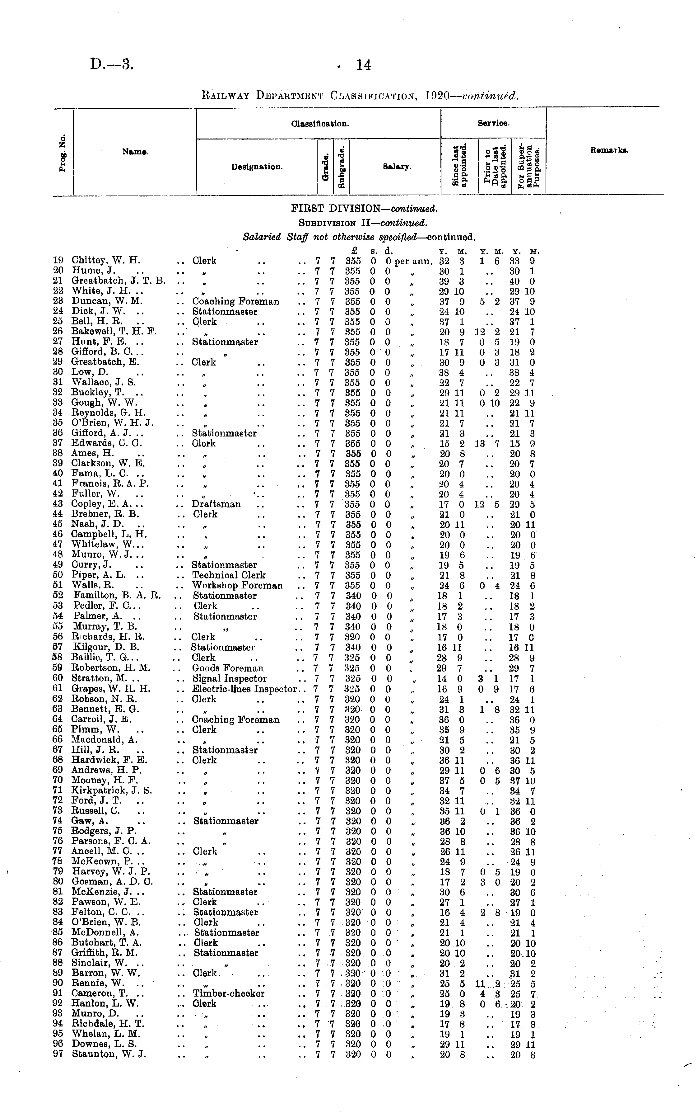 Classification. Service. 6 X ex o £ Nam*. Designation. 4 f o i U p OS Salary. fl 2S» g,2 8 «.S hi? fsi So .2 23 *" a a S5 ftQa ogfl t" td M cd ft, td&l R« marks. FIRST DIVISION— continued. Subdivision II— continued. 19 Chittey, W. H. 20 Hume, J. 21 Greatbatch, J. T. B. 22 White, J. H. 23 Duncan, W. M. 24 Diok, J. W. .. 25 Bell, H. R. .. 26 Bakewell, T. H. F. 27 Hunt, F. E. 28 Gifford, B. 0. .. 29 Greatbatch, E. 30 Low, D. 31 Wallace, J. S. 32 Buckley, T. .. 33 Gough, W. W. 34 Reynolds, G. H, 35 O'Brien, W. H. J. 36 Gifford, A. J. 37 Edwards, 0. G. 38 Ames, H. 39 Clarkson, VV. E. 40 Fama, L. 0. 41 Franois, R. A. P. 42 Fuller, W. .. 43 Copley, E. A. .. 44 Brebner, R. B. 45 Nash, J. D. 46 Campbell, L. H. 47 Whitelaw, W... 48 Munro, W.J... 49 Curry, J. 50 Piper, A. L. 51 Walls, R. 52 Familton, B. A. R. 53 Pedler, F. C... 54 Palmer, A. .. 55 Murray, T. B. 56 Richards, H. R. 57 Kilgour, D. B. 58 Baillie, T. G... 59 Robertson, H. M. 60 Stratton, M. .. 61 Grapes, W. H. H. 62 Robson, N. R. 63 Bennett, E. G. 64 Carroll, J. K. 65 Pimm, W. 66 Macdonald, A. 67 Hill, J. R. 68 Hardwick, F. E. 69 Andrews, H. P. 70 Mooney, H. F. 71 Kirkpatrick, J. S. 72 Ford, J. T. 73 Russell, 0. 74 Gaw, A. 75 Rodgers, J. P. 76 Parsons, F. 0. A. 77 Ancell, M. 0. .. 78 McKeown, P. .. 79 Harvey, W. J. P. 80 Gosman, A. D. 0. 81 MeKenzie, J. .. 82 Pawson, W. E. 83 Felton, GO. .. 84 O'Brien, W. B. 85 McDonnell, A. 86 Butchart, T. A. 87 Griffith, R. M. 88 Sinclair, W. .. 89 Barron, W. W. 90 Rennie, W. .. 91 Cameron, T. .. 92 Hanlon, L. W. 93 Munro, D. 94 Richdale, H. T. 95 Whelan, L. M. 96 Downes, L. S. 97 Staunton, W. J. Salaried Staff not otherwise specified —oontinued. £ s. d. Y. M. Y. M. Y. M. .. Clerk .. .. 7 7 355 0 0 per ann. 32 3 1 6 33 9 .. 7 7 355 0 0 „ 30 1 .. 30 1 .. .. .. 7 7 355 0 0 „ 39 3 .. 40 0 .. 7 7 355 0 0 „ 29 10 .. 29 10 .. Coaching Foreman .. 7 7 355 0 0 „ 37 9 5 2 37 9 .. Stationmaster .. 7 7 355 0 0 „ 24 10 ..24 10 .. Clerk .. .. 7 7 355 0 0 „ 37 1 .. 37 1 ... .. .. 7 7 355 0 0 „ 20 9 12 2 21 7 .. Stationmaster .. 7 7 355 0 0 , 18 7 0 5 19 0 .. 7 7 355 0 ■ 0 „ 17 11 0 3 18 2 .. Clerk .. .. 7 7 355 0 0 „ 30 9 0 3 31 0 ... * .. .. 7 7 355 0 0 „ 38 4 38 4 .. 7 7 355 0 0 „ 22 7 .. 22 7 .. 7 7 355 0 0 „ 29 11 0 2 29 11 .. 7 7 355 0 0 „ 21 11 0 10 22 9 .. 7 7 355 0 0 „ 21 11 .. 21 11 .. 7 7 355 0 0 „ 21 7 21 7 .. Stationmaster .. 7 7 355 0 0 „ 213 .. 21 3 .. Clerk .. .. 7 7 355 0 0 „ 15 2 13 7 15 9 .. 7 7 355 0 0 „ 20 8 .. 20 8 .. .. .. 7 7 355 0 0 „ 20 7 20 7 .. 7 7 355 0 0 „ 20 0 .. 20 0 .. 7 7 355 0 0 „ 20 4 .. 20 4 .. 7 7 355 0 0 , 20 4 .. 20 4 .. Draftsman .. .. 7 7 355 0 0 „ 17 0 12 5 29 5 .. Clerk .. .. 7 7 355 0 0 „ 21 0 .. 21 0 .. 7 7 355 0 0 „ 20 11 .. 20 11 .. 7 7 355 0 0 . 20 0 20 0 .. 7 7 355 0 0 „ 20 0 20 0 .. 7 7 355 0 0 „ 19 6 19 6 .. Stationmaster .. 7 7 355 0 0 „ 19 5 .. 19 5 .. Technical Clerk .. 7 7 355 0 0 „ 218 .. 21 8 .. Workshop Foreman .. 7 7 355 0 0 „ 24 6 0 4 24 6 .. Stationmaster .. 7 7 340 0 0 „ 18 1 .. 18 1 .. Clerk .. ..7 7 340 0 0 18 2 18 2 .. Stationmaster .. 7 7 340 0 0 „ 17 3 .. 17 3 ,; .. 7 7 340 0 0 „ 18 0 .. 18 0 .. Clerk .. .. 7 7 320 0 0 „ 17 0 .. 17 0 .. Stationmaster .. 7 7 340 0 0 „ 16 11 .. 16 11 .. Clerk .. .. 7 7 325 0 0 „ 28 9 .. 28 9 . . Goods Foreman ..77 325 0 0 „ 29 7 .. 29 7 .. Signal Inspector ..7 7 325 0 0 „ 14 0 3 1 17 1 .. Electric-lines Inspector.. 7 7 325 0 0 „ 16 9 0 9 17 6 .. Clerk .. .. 7 7 320 0 0 „ 24 1 24 1 .. 7 7 320 0 0 „ 31 3 1 8 32 11 .. Coaching Foreman .. 7 7 320 0 0 „ 36 0 .. 36 0 .. Clerk ... .. 7 7 320 0 0 „ 35 9 .. 35 9 ... .. .. 7 7 320 0 0 „ 21 5 .. 21 5 .. Stationmaster .. 7 7 320 0 0 „ 30 2 .. 30 2 .. Clerk .. .. 7 7 320 0 0 „ 36 11 .. 36 11 .. 7 7 320 0 0 „ 29 11 0 6 30 5 .. 7 7 320 0 0 „ 37 5 0 5 37 10 .. .. .. 7 7 320 0 0 „ 34 7 .. 34 7 ... .. .. 7 7 320 0 0 , 32 11 .. 32 11 .. 7 7 320 0 0 „ 35 11 0 I 36 0 .. Stationmaster .. 7 7 320 0 0 , 86 2 .. 36 2 .. 7 7 320 0 0 , 36 10 .. 36 10 .. 7 7 320 0 0 „ 28 8 .. 28 8 .. Clerk .. .. 7 7 320 0 0 „ 26 11 .. 26 11 .. ..„ .. .. 7 7 320 0 0 „ 24 9 .. 24 9 .. ■ , .. .. 7 7 320 0 0 „ 18 7 0 5 19 0 .. 7 7 320 0 0 „ 17 2 3 0 20 2 .. Stationmaster ..7 7 320 0 0 „ 30 6 30 6 .. Clerk .. .. 7 7 320 0 0 „ 27 1 .. 27 1 .. Stationmaster .. 7 7 320 0 0 „ 16 4 2 8 19 0 .. Clerk .. .. 7 7 320 0 0 „ 21 4 .. 21 4 .. Stationmaster .. 7 .7 320 0 0 „ 211 .. 21 1 .. Clerk .. .. 7 7 320 0 0 , 20 10 .. 20 10 .. Stationmaster .. 7 7 320 0 0 „ 20 10 .. 20,10 .. 7 7 320 0 0 „ 20 2 20 2 .. Clerk. 7 7 320 0 0 „ 31 2 .. 31 2 .. 7 7 320 0 0 • „ 25 5 11 2 25 5 .. Timber-checker .. 7 7 320 0 0 „ 25 0 4 3 25 7 .. Clork ■ ... .. 7 7 320 0 0 „ 19 8 0 6 20 2 .. . ., .. .. 7 7 320 0 0 „ 19 3 .. 19 3 „ .. .. 7 7 320 0 0 „ 17 8 .. 17 8 „ . .. .. 7 7 320 0 0 „ 19 1 19 1 .. 7 7 320 0 0 „ 29 11 .. 29 11 .. 7 7 320 0 0 „ 20 8 .. 20 8