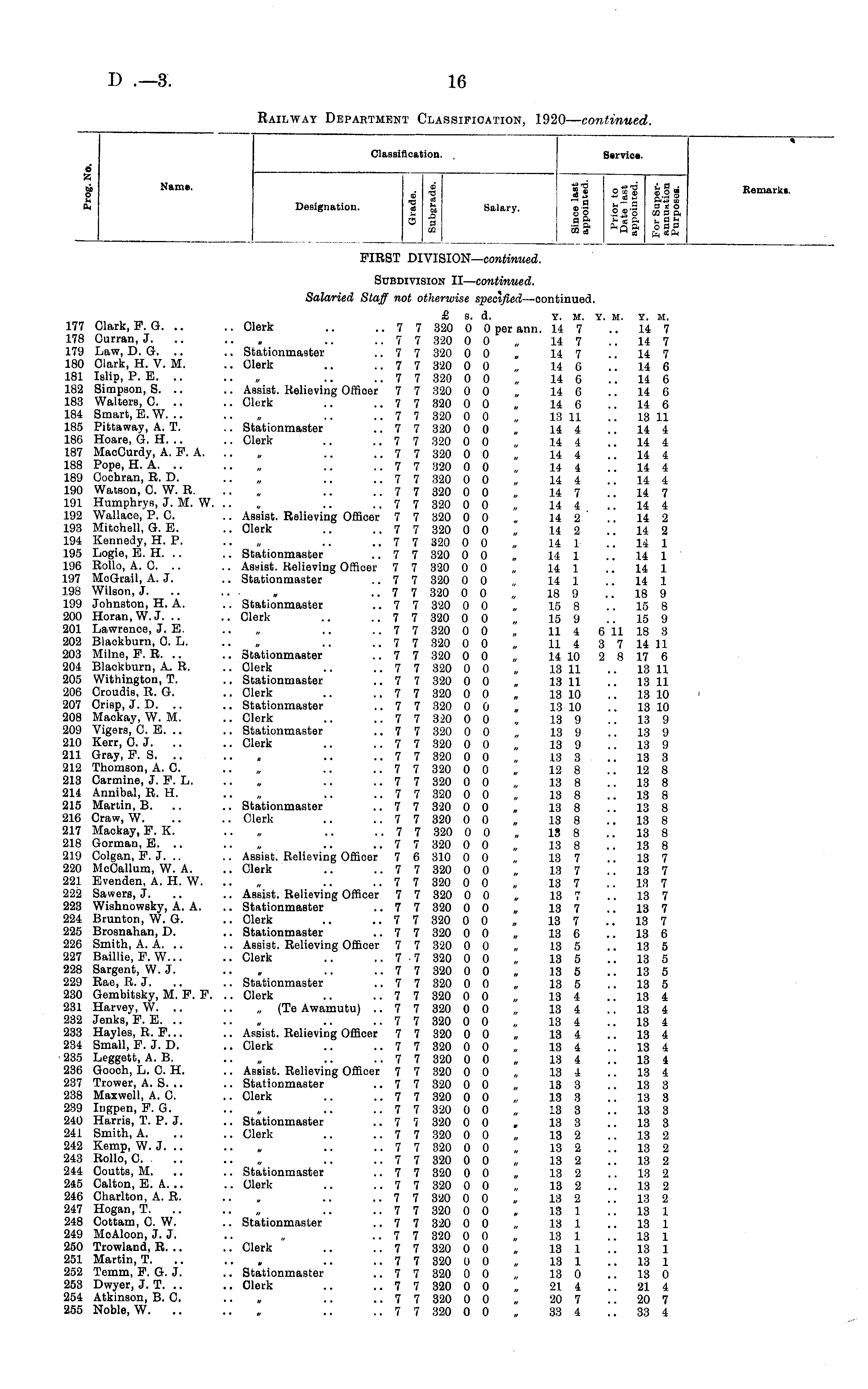 Classification. Service. "«." o K ti 5 Oh Designation, CD g 5 9 •e cd S OC A 3 CQ Salary. it si*' a u -- a So ,2®o § a G £ & at & Pm n a KeiimrJi*. Name. III D r O CO P P, j- a 5 O HO FIRST DIVISION— continued. Subdivision II— continued. Salaried Staff not otherwise specified —oontinued. £ s. d. Y. M. Y. M. Y. M. 177 Clark, F. G. .. .. Clerk .. .. 7 7 320 0 0 per ann. 14 7 .. 14 7 178 Curran, J. .. „ .. .. 7 7 320 0 0 „ 14 7 14 7 179 Law, D. G. .. .. Stationmaster .. 7 7 320 0 0 „ 14 7 14 7 180 Clark, H. V. M. .. Clerk .. .. 7 7 320 0 0 14 6 14 6 181 Islip, P. E. .. ... , .. ..77 320 00 „ 14 6 .. 14 6 182 Simpson, S. .. .. Assist. Relieving Officer 7 7 320 0 0 „ 14 6 14 6 183 Walters, 0. .. .. Olerk .. .. 7 7 320 0 0 „ 14 6 .. 14 6 184 Smart, E. W. .. .. . .. .. 7 7 320 0 0 „ 13 11 .. 13 11 185 Pittaway, A. T. .. Stationmaster ..77 320 00 „ 14 4 14 4 186 Hoare, G. H. .. .. Clerk .. ..77 320 00 „ 14 4 .. 14 4 187 MacCurdy, A. F. A. .. „ .. .. 7 7 320 0 0 „ 14 4 14 4 188 Pope, H. A. .. .. „ .. .. 7 7 320 0 0 , 14 4 .. 14 4 189 Cochran, R. D. .. „ .. .. 7 7 320 0 0 „ 14 4 14 4 190 Watson, C. W. R. .. „ .. .. 7 7 320 0 0 „ 14 7 14 7 191 Humphrys, J. M. W. .. „ .. .. 7 7 320 0 0 , 14 4 14 4 192 Wallace, P. 0. .. Assist. Relieving Officer 7 7 320 0 0 , 14 2 ' 14 2 193 Mitohell, G. E. .. Clerk .. .. 7 7 320 0 0 „ 14 2 14 2 194 Kennedy, H. P. .. „ .. ..77 320 00 „ 14 1 14 1 195 Logie, E. H. .. .. Stationmaster ..77 320 00 „ 14 1 14 1 196 Rollo, A. 0. .. .. Assist. Relieving Officer 7 7 320 0 0 „ 14 1 14 1 197 McGrail, A. J. .. Stationmaster .. 7 7 320 0 0 „ 14 1 .. 14 1 198 Wilson, J. ... , .. 7 7 320 0 0 „ 18 9 18 9 199 Johnston, H. A. .. Stationmaster .. 7 7 320 0 0 „ 15 8 .. 15 8 200 Horan, W.J. .. .. Clerk .. .. 7 7 320 0 0 „ 15 9 .. 15 9 201 Lawrence, J. E. .. „ .. .. 7 7 320 0 0 „ 11 4 6 II 18 8 202 Blackburn, 0. L. .. „ .. ..7 7 320 0 0 „ 11 4 3 7 14 11 203 Milne, F. R. .. .. Stationmaster .. 7 7 320 0 0 „ 14 10 2 8 17 6 204 Blackburn, A. R. .. Olerk .. ..77 320 00 „ 13 11 .. 13 11 205 Withington, T. .. Stationmaster .. 7 7 320 0 0 „ 13 11 13 11 206 Croudis, R. G. .. Clerk .. .. 7 7 320 0 0 „ 13 10 .. 13 10 207 Crisp, J. D. .. .. Stationmaster .. 7 7 320 0 0 , 13 10 13 10 208 Mackay, W. M. .. Clerk .. .. 7 7 320 0 0 „ 13 9 .. 13 9 209 Vigors, C E. .. .. Stationmaster ..7 7 320 0 0 „ 13 9 13 9 210 Kerr, C.J, .. .. Clerk .. .. 7 7 320 0 0 „ 13 9 13 9 211 Gray, F. S. .. .. , .. .. 7 7 320 0 0 „ 18' 8 ... 18 8 212 Thomson, A. C. .. „ .. .. 7 7 320 0 0 „ 12 8 12 8 213 Carmine, J. F. L. .. „ .. .. 7 7 320 0 0 „ 13 8 13 8 214 Annibal, R. H. .. „ .. .. 7 7 320 0 0 „ 13 8 .. 18 8 215 Martin, B. .. .. Stationmaster .. 7 7 320 0 0 „ 13 8 .. 13 8 216 Craw, W. .. .. Clerk .. .. 7 7 320 0 0 , 13 8 .. 13 8 217 Mackay, F. K. .. „ .. .. 7 7 320 0 0 , 13 8 13 8 218 Gorman, E. .. .. „ .. .. 7 7 320 0 0 „ 13 8 13 8 219 Colgan, F. J. .. .. Assist. Relieving Officer 7 6 310 0 0 „ 13 7 13 7 220 McCallum, W. A. .. Clerk .. .. 7 7 320 0 0 „ 13 7 .. 13 7 221 Evenden, A. H. W. .. „ .. .. 7 7 320 0 0 „ 13 7 13 7 222 Sawers, J. .. .. Assist. Relieving Officer 7 7 820 0 0 „ 13 7 13 7 223 Wishnowsky, A. A. .. Stationmaster ..77 320 00 „ 13 7 13 7 224 Brunton, W. G. .. Clerk .. ..7 7 320 0 0 „ 13 7 13 7 225 Brosnahan, D. .. Stationmaster ..77 320 00 „ 13 6 13 6 226 Smith, A. A. .. .. Assist. Relieving Officer 7 7 320 0 0 „ 13 5 .. 13 5 227 Baillie, F. W... .. Clerk .. .. 7 7 320 0 0 „ 13 5 .. 13 5 228 Sargent, W.J. .. , .. .. 7 7 320 0 0 . 13 5 .. 13 5 229 Rae, R. J. .. .. Stationmaster ..77 320 00 „ 13 5 13 5 230 Gembitsky, M. F. F. .. Clerk .. .. 7 7 320 0 0 „ 13 4 .. 13 4 231 Harvey, W. .. .. „ (Te Awamutu) .. 7 7 320 0 0 , 13 4 .. 13 4 232 Jenks, F. E. .. .. , .. .. 7 7 320 0 0 „ 13 4 .. 13 4 233 Hayles, R. F... .. Assist. Relieving Officer 7 7 320 0 0 „ 13 4 13 4 234 Small, F. J. D. .. Olerk .. .. 7 7 320 0 0 „ 13 4 13 4 235 Leggett, A. B. .. „ .. .. 7 7 320 0 0 „ 13 4 13 4 236 Gooch, L. O. H. .. Assist. Relieving Officer 7 7 320 0 0 „ 13 4 .. 13 4 237 Trower, A. S. .. .. Stationmaster .. 7 7 320 0 0 „ 13 3 .. 13 3 238 Maxwell, A. C. .. Clerk .. .. 7 7 320 0 0 ,. 13 3 .. 13 3 239 Ingpen, F. G. .. „ .. .. 7 7 320 0 0 „ 13 3 13 3 240 Harris, T. P. J. .. Stationmaster .. 7 7 320 0 0 . 13 3 .. 13 3 241 Smith, A. .. .. Clerk .. .. 7 7 820 0 0 „ 13 2 .. 13 2 242 Kemp, W. J. .. .. , .. .. 7 7 320 0 0 „ 13 2 13 2 243 Rollo, O. .. .. „ .. .. 7 7 320 0 0 „ 13 2 13 2 244 Coutts, M. .. .. Stationmaster .. 7 7 320 0 0 „ 13 2 .. 13 2 245 Calton, E. A. .. .. Clerk .. .. 7 7 320 0 0 „ 13 2 13 2 246 Charlton, A. R. .. „ .. .. 7 7 320 0 0 „ 13 2 13 2 247 Hogan, T. .. .. „ .. .. 7 7 320 0 0 „ 13 1 .. 13 1 248 Cottam, O. W. .. Stationmaster .. 7 7 320 0 0 „ 13 1 .. 13 1 249 McAloon, J. J. .. „ .. 7 7 320 0 0 „ 13 1 .. 13 1 250 Trowland, R. .. .. Clerk .. .. 7 7 320 0 0 „ 13 1 .. 13 1 251 Martin, T. .. , .. .. 7 7 320 0 0 „ 13 1 .. 13 1 252 Temm, F. G. J. .. Stationmaster .. 7 7 320 0 0 „ 13 0 .. 13 0 253 Dwyer, J. T. .. .. Clerk .. .. 7 7 320 0 0 „ 21 4 21 4 254 Atkinson, B. O. .. „ .. .. 7 7 320 0 0 „ 20 7 20 7 255 Noble, W. .. .. „ .. .. 7 7 320 0 0 „ 33 4 .. 33 4
