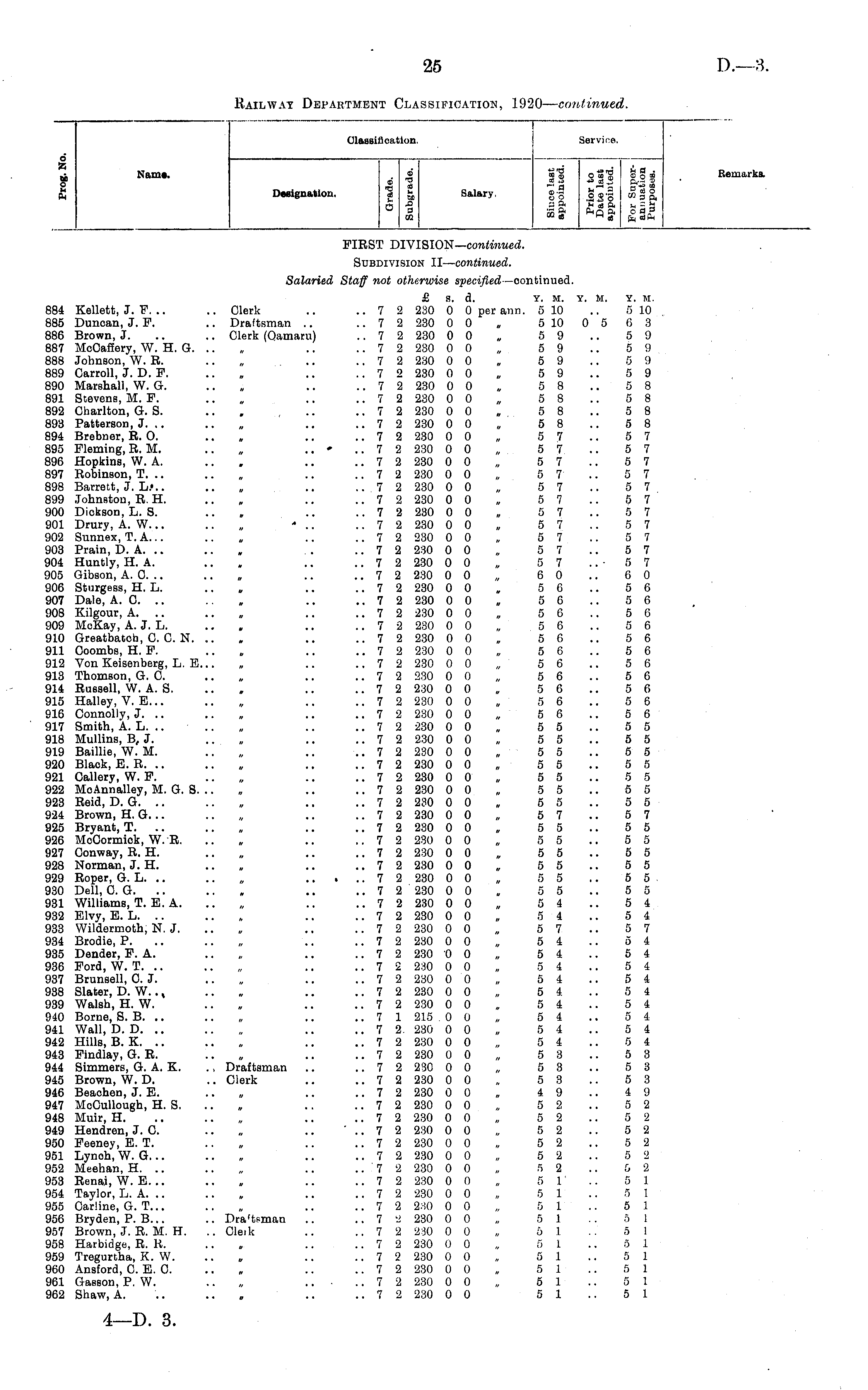 Classification. Servico. 6 Z A o u to Nam*. Designation, 9 13 r& U 8 CD -a re CD A a CQ fi ■23 55 a ail !Js MB'B \ 5 crj a | h = a Ph (5 A o ft P M 48 & ai^H Heinarka. Salary. FIRST DIVISION— continued. Subdivision II — continued. Salaried Staff not otherwise specified —oontinued. £ s. d. Y. m. y. tl, ?84 Kellett, J. F. .. .. Clerk .. .. 7 2 230 0 0 per arm. 5 10 185 Duncan, J. F. .. Draftsman .. .. 7 2 230 0 0 , 5 1.0 0 5 186 Brown, J. .. .. Clerk (Oamaru) .. 7 2 230 0 0 „ 5 9 187 McCaffery, W. H. G. .. „ .. ..72 280 00 „ 59 188 Johnson, W. R. .. „ .. .. 7 2 230 0 0 „ 5 9 )89 Carroll, J. D. F. .. „ .. .. 7 2 230 0 0 „ 5 9 !90 Marshall, W. G. .. „ .. .. 7 2 230 0 0 „ 5 8 191 Stevens, M. F. .. „ .. .. 7 2 230 0 0 „ 5 8 )92 Charlton, G. S. .. „ .. .. 7 2 230 0 0 „ 5 8 )93 Patterson, J. .. .. „ .. .. 7 2 230 0 0 „ 5 8 194 Brebner, R. O. .. „ .. .. 7 2 230 0 0 „ 5 7 195 Fleming, R. M. .. „ .. ' .. 7 2 230 0 0 „ 5 7 196 Hopkins, W. A. .. , .. .. 7 2 230 0 0 „ 5 7 197 Robinson, T. .. .. „ .. .. 7 2 230 0 0 „ 5 7 198 Barrett, J. L.'.. .. „ .. .. 7 2 230 0 0 „ 5 7 199 Johnston, R. H. .. „ .. .. 7 2 230 0 0 „ 5 7 )00 Dickson, L. S. .. „ .. .. 7 2 230 0 0 „ 5 7 101 Drury, A. W... .. „ - .. .. 7 2 230 0 0 „ 5 7 102 Sunnex, T. A... .. „ .. .. 7 2 230 0 0 „ 5 7 103 Prain, D. A. .. .. „ ... .. 7 2 230 0 0 „ 5 7 104 Huntly, H. A. .. „ .. .. 7 2 230 0 0 „ 5 7 105 Gibson, A. 0. .. .. „ .. .. 7 2 230 0 0 „ 6 0 106 Sturgess, H. L. .. „ .. .. 7 2 230 0 0 , 5 6 )07 Dale, A. C .. .. „ .. .. 7 2 2,30 0 0 „ 5 6 108 Kilgour, A. .. .. „ .. .. 7 2 230 0 0 „ 5 6 109 MoKay, A. J. L. .. , .. ..7 2 230 0 0 „ 5 6 )10 Greatbatch, 0. 0. N. .. , .. .. 7 2 230 0 0 „ 5 6 111 Coombs, H. F. .. „ .. .. 7 2 230 0 0 , 5 6 )12 Von Keisenberg, L. E... „ .. ..7 2 230 0 0 „ 5 6 113 Thomson, G. 0. .. „ .. .. 7 2 230 0 0 „ 5 6 )14 Russell, W. A. S. .. „ .. ..7 2 230 0 0 , 5 6 )15 Halley, V. E... .. „ .. .. 7 2 230 0 0 „ 5 6 116 Connolly, J. .. .. „ .. .. 7 2 230 0 0 „ 5 6 )17 Smith, A. L. .. .. , .. .. 7 2 280 0 0 „ 5 5 )18 Mullins, B, J. .. „ .. .. 7 2 230 0 0 „ 5 5 119 Baillie, W. M. .. „ .. .. 7 2 230 0 0 „ 5 5 )20 Black, E. R. .. .. „ .. .. 7 2 230 0 0 „ 5 5 )21 Callery, W. F. .. „ .. .. 7 2 230 0 0 „ 5 5 122 McAnnalley, M. G. S. .. „ .. .. 7 2 230 0 0 „ 5 5 123 Reid, D. G. .. .. „ .. .. 7 2 230 0 0 „ 5 5 124 Brown, H. G. .. .. , .. .. 7 2 230 0 0 „ 5 7 )25 Bryant, T. .. .. „ .. .. 7 2 230 0 0 , 5 5 126 MoCormick, W. R. .. , .. ..72 230 00 „ 55 127 Conway, R. H. .. „ .. .. 7 2 230 0 0 „ 5 5 128 Norman, J. H. .. . .. .. 7 2 230 0 0 , 5 5 129 Roper, G. L. .. .. „ 7 2 230 0 0 „ 5 5 130 Dell, 0. G. .. .. , .. .. 7 2 230 0 0 „ 5 5 131 Williams, T. E. A. .. „ .. .. 7 2 230 0 0 , 5 4 182 Elvy, E. L. .. .. „ .. .. 7 2 230 0 0 „ 5 4 )33 Wildermoth, N. J. .. „ .. .. 7 2 230 0 0 „ 5 7 134 Brodie, P. .. „ .. .. 7 2 230 0 0 „ 5 4 135 Dender, F. A. .. „ .. .. 7 2 230 0 0 „ 5 4 )36 Ford, W. T. .. .. „ .. .. 7 2 2:10 0 0 „ 5 4 )37 Brunsell, C.J. .. „ .. .. 7 2 230 0 0 „ 5 4 138 Slater, D. W. ., .. „ .. ..72 230 00 „ 54. 139 Walsh, H. W. .. „ .. ..72 230 00 „ 54 140 Borne, S. B. .. .. „ .. .. 7 1 215 . 0 0 „ 5 4 )41 Wall, D. D. .. .. „ .. .. 7 2. 230 0 0 „ 5 4 )42 Hills, B. K. .. .. „ .. .. 7 2 230 0 0 „ 5 4 )43 Findlay, G. R. .. „ .. .. 7 2 230 0 0 „ 5 8 144 Simmers, G. A. K. ., Draftsman .. .. 7 2 230 0 0 , 5 3 145 Brown, W. D. .. Clerk .. .. 7 2 230 0 0 „ 5 3 (46 Beachen, J. E. .. „ .. .. 7 2 230 0 0 , 4 9 )47 McCullough, H. S. .. „ .. .. 7 2 230 0 0 „ 5 2 148 Muir, H. .. .. „ .. .. 7 2 230 0 0 „ 5 2 )49 Hendren, J. O. .. „ .. ' .. 7 2 230 0 0 „ 5 2 )50 Feeney, E. T. .. „ .. .. 7 2 230 0 0 „ 5 2 151 Lynch, W. G... .. , .. .. 7 2 230 0 0 „ 5 2 152 Meehan, H. .. .. „ .. .. 7 2 230 0 0 „ 5 2 153 Renai, W. E. .. .. „ .. .. 7 2 230 0 0 „ 5 1 154 Taylor, L. A. .. .. „ .. .. 7 2 230 0 0 „ 5 1 )55 Carline, G. T... .. „ .. .. 7 2 230 0 0 „ 5 1 156 Bryden, P. B... .. Dra'tt-man .. .. 7 2 230 0 0 „ 5 1 )57 Brown, J. R. M. H. .. Cleik .. .. 7 2 230 0 0 „ 5 1 158 Harbidge, R. R. .. „ .. .. 7 2 230 0 0 „ 5 1 159 Tregurtha, K. W. .. , .. .. 7 2 230 0 0 „ 5 1 160 Ansford, O. E, 0. .. „ .. .. 7 2 230 0 0 „ 5 1 16.1 Gasson, P. W. .. „ ... .. 7 2 230 0 0 , 51 )62 Shaw, A. .. .. , .. .. 7 2 230 0 0 5 1 Y. M. 5 10 6 3 5 9 5 9 5 9 5 9 5 8 5 8 5 8 5 8 5 7 5 7 5 7 5 7 5 7 5 7 5 7 5 7 5 7 5 7 5 7 6 0 5 6 5 6 5 6 5 6 5 6 5 6 5 6 5 6 5 6 5 6 5 6 5 5 5 5 5 5 5 5 5 5 5 5 5 5 5 7 5 5 5 5 5 5 5 5 5 5 5 5 5 4 5 4 5 7 5 4 5 4 5 4 5 4 5 4 5 4 5 4 5 4 5 4 5 3 5 3 5 3 4 9 5 2 5 2 5 2 5 2 5 2 5 2 5 1 5 1 5 1 5 1 5 1 5 1 5 1 5 1 5 1 5 1