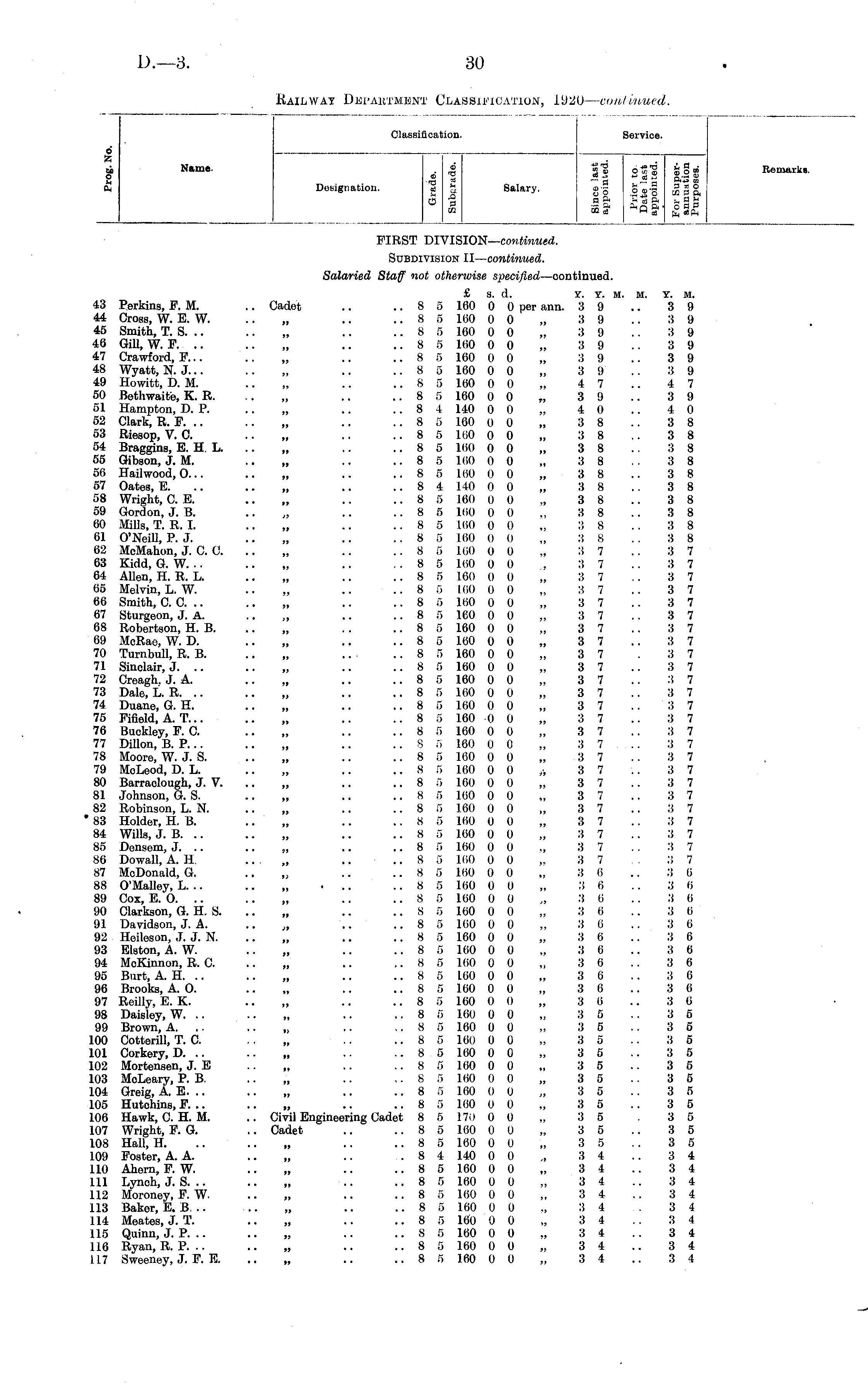 Classification. Service. 6 Z ci o ft to Name Designation. to te 3 9 13 ri A a QQ Salary. grd -H=ii i a . 3 2 2£2 8.2 S ™ d -- OO ftn to 9" ~ „.= =05 W O to O .2 .SO CC P ft aft /-can ;- 3 j-; Bio? °2rP vn cd rH cd to A to Remarks. FIRST DIVISION— continued. Subdivision II— continued. 43 Perkins, F. M. 44 Cross, W. E. W. 45 Smith, T. S. .. 46 Gill, W. F. 47 Crawford, F... 48 Wyatt, N. J... 49 Howitt, D. M. 50 Bothwaite, K. R. 51 Hampton, D. P. 52 Clark, R. F. 53 Riesop, V. C 54 Braggins, E. H, L. 55 Gibson, J. M. 56 Hailwood, 0... 57 Oates, E. 58 Wright, 0. E. 59 Gordon, J. B. 60 Mills, T. R. I. 61 O'Neill, P. J. 62 McMahon, J. C 0. 63 Kidd, G. W. .. 64 Allen, H. R. L. 65 Molvin, L. W. 66 Smith, C C 67 Sturgeon, J. A. 68 Robertson, H. B. 69 McRae, W. D. 70 Turnbull, R. B. 71 Sinclair, J. .. 72 Creagh. J. A. 73 Dale, L. R. 74 Duane, G. H. 75 Fifield, A. T... 76 Buckley, F. C. 77 Dillon, B. P... 78 Moore, W. J. S. 79 McLeod, D. L. 80 Barraclough, J. V. 81 Johnson, G. S. 82 Robinson, L. N. 83 Holder, H. B. 84 Wills, J. B. 85 Donsem, J. .. 86 Dowall, A. H. 87 McDonald, G. 88 O'Malley, L. .. 89 Cox, E. O. 90 Clarkson, G. H. S. 91 Davidson, J. A. 92 Hoileson, J. J. N. 93 Elston, A. W. 94 McKinnon, R. C 95 Burt, A. H. 96 Broooks, A. 0. 97 Rcilly, E. K. 98 Daisley, W. .. 99 Brown, A. .. 100 Cotterill, T. 0. 101 Corkery, D. .. 102 Mortensen, J. E 103 McLeary, P. B. 104 Greig, A. E. 105 Hutohins, F. .. 106 Hawk, C H. M. 107 Wright, F. G. 108 Hall, H. 109 Foster, A. A. 110 Ahern, F. W. 111 Lynch, J. S. .. 112 Moroney, F. W. 113 Baker, E. B .. 114 Meates, J. T. 115 Quinn, J. P. .. 116 Ryan, R. P. .. 1.17 Sweeney, J. F. E. Salaried Staff not otherwise specified —continued. £ s. d. Y. Y. M. M. Cadet .. .. 8 5 160 0 0 per ann. 3 9 .. 8 5 160 0 0 „ 3 9 ..8 5 160 0 0 „ 3 9 ..8 5 160 0 0 „ 3 9 .. 8 5 160 0 0 „ 3 9 .. 8 5 160 0 0 „ 3 9 ..8 5 160 0 0 „ 4 7 .. 8 5 160 0 0 „ 3 9 .. 8 4 140 0 0 „ 4 0 .. 8 5 160 0 0 „ 3 8 ..8 5 160 0 0 „ 3 8 „ ,. .. 8 5 160 0 0 „ 3 8 ..8 5 160 0 0 „ 3 8 ..8 5 160 0 0 „ 3 8 „ .. .. 8 4 140 0 0 „ 3 8 ..8 5 160 0 0 „ 3 8 ..8 5 160 0 0 „ 3 8 ..8 5 160 0 0 „ 3 8 ..8 5 1.60 0 0 „ 3 8 ..8 5 160 0 0 „ 3 7 ,.85 160 00 , 37 ..8 5 160 0 0 „ 3 7 ..85 1.60 00 „ 37 ..8 5 160 0 0 „ 3 7 ..8 5 160 0 0 „ 3 7 .. 8 5 160 0 0 „ 3 7 .. 8 5 160 0 0 „ 3 7 .. 8 5 160 0 0 „ 3 7 .. 8 5 160 0 0 „ 3 7 .. 8 5 160 0 0 „ 3 7 .. 8 5 160 0 0 „ 3 7 .. 8 5 160 0 0 „ 3 7 .. 8 5 160 0 0 „ 3 7 .. 8 5 160 0 0 „ 3 7 ..8 5 160 0 0 „ 3 7 .... ..8 5 160 0 0 „ 3 7 ..85 160 0 0 ,., 3 7 ..85 160 00 „ 37 .. 8 5 100 0 0 „ 3 7 ..8 5 160 0 0 „ 3 7 .. 8 5 160 0 0 „ 3 7 .. 8 5 160 0 0 „ 3 7 .. 8 5 160 0 0 „ 3 7 .. 8 5 160 0 0 „ 3 7 „ .. ..8 5 160 0 0 „ 3 6 ... ..8 5 160 0 0 „ 3 6 „ .. ..85 160 0 0 „ 36 .. 8 5 160 0 0 „ 3 6 .. 8 5 160 0 0 „ 3 6 .. 8 5 160 0 0 ,. 3 6 ..8 5 160 0 0 „ 3 6 „ .. ..85 160 00 „ 36 .. 8 5 160 0 0 „ 3 6 .. 8 5 160 0 0 „ 3 6 .. 8 5 160 0 0 „ 3 0 ..85 160 00 „ 35 ,. 8 5 160 0 0 „ 3 5 .. 8 5 160 0 0 „ 3 5 .. 8 5 160 0 0 „ 3 5 .. 8 5 160 0 0 „ 3 5 ,. 8 5 160 0 0 „ 3 5 .. 8 5 160 0 0 „ 3 5 ..85 160 00 „ 35 Civil Engineering Cadet 8 5 170 0 0 „ 3 5 Cadet .. ..8 5 160 0 0 „ 3 5 .. 8 5 160 0 0 „ 3 5 „ .. . 8 4 140 0 0 „ 3 4 .. 8 5 160 0 0 „ 3 4 ..85 160 00 „ 34 ..85 160 00 „ 34 ..85 160 00 ., 34 ..85 160 00 „ 34 .. 8 5 160 0 0 ., 3 4 ..8 5 160 0 0 „ 3 4 ..8 5 160 0 0 „ 3 4 Y. M. 3 9 3 9 3 9 3 9 3 9 3 9 4 7 3 9 4 0 3 8 3 8 3 8 3 8 3 8 3 8 3 8 3 8 3 8 3 8 3 7 3 7 3 7 3 7 3 7 3 7 3 7 3 7 3 7 3 7 3 7 3 7 3 7 3 7 3 7 3 7 3 7 3 7 3 7 3 7 3 7 8 7 3 7 3 7 3 7 3 6 3 6 3 6 3 6 3 6 3 6 3 6 3 6 3 6 3 6 3 6 3 5 8 5 3 5 3 5 3 5 3 5 3 5 3 5 3 5 3 5 3 5 3 4 3 4 3 4 3 4 3 4 8 4 3 4 3 4 3 4