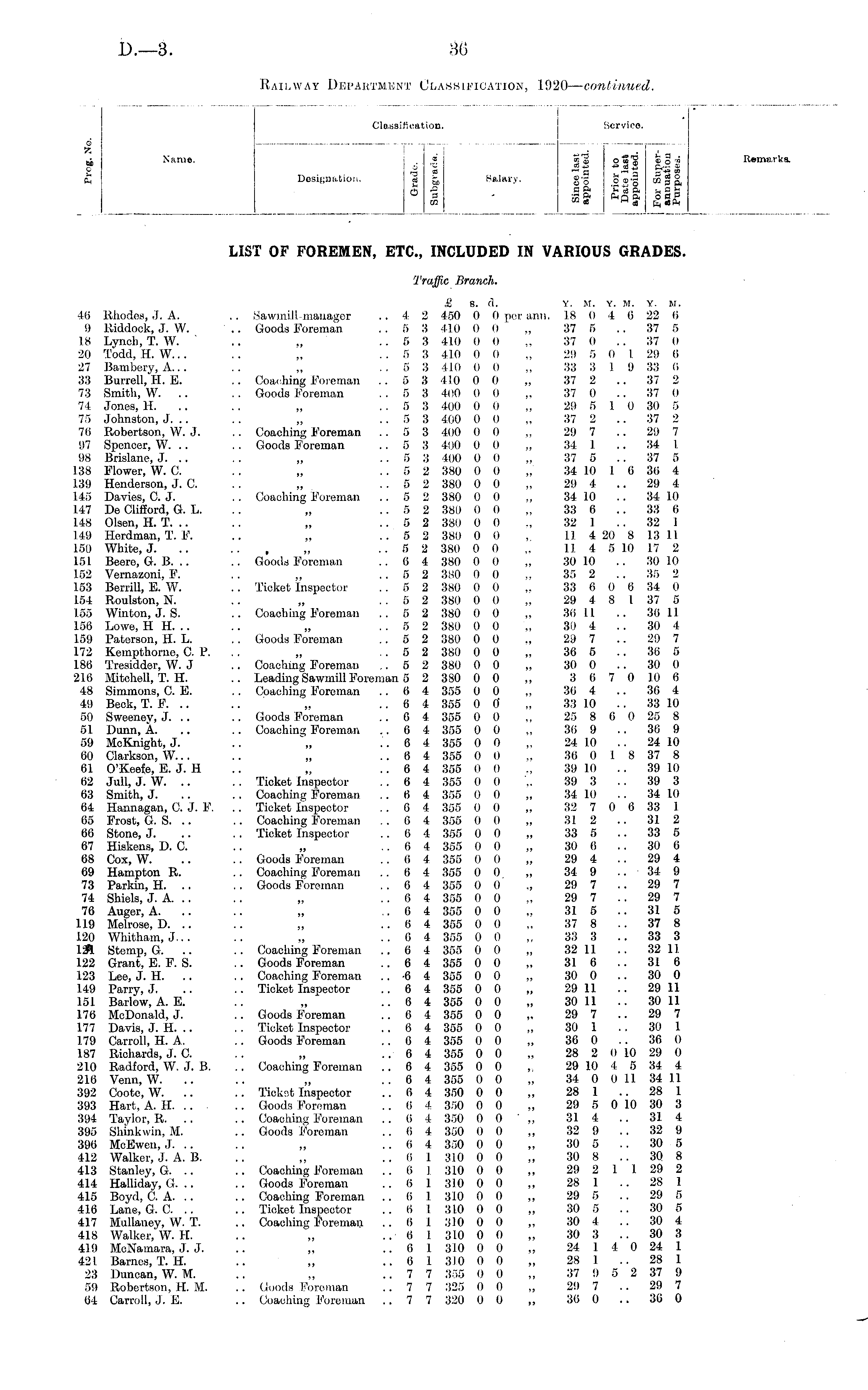 d 7. A Kara*, c to G Z tJD CO to Claris if. oat ion. 8 Designation. <a Salary, too Service. a* a a"® ir>S SS CO -r in oo oo a o oo .goo-g toogg, a ft G a ft •« a E 'too & Q °. ° 9 r? Renmrka. LIS' IT OF FOREMEN, ETC., INCLUDED IN VA fVRIOUS GRADES. Traffic Branch. 46 Rhodes, J. A. 9 Riddock, J. W. 18 Lynch, T. W. 20 Todd, H. W... 27 Bambery, A... 33 Burrell, H. E. 73 Smith, W. .. 74 Jones, H. 75 Johnston, J. .. 76 Robertson, W. J. 97 Spencer, W. .. 98 Brislane, J. .. 138 Flower, W. C 139 Henderson, J. C. 145 Davies, C. J. 147 De Clifford, G. L. 148 Olsen, H. T. .. 149 Herdman, T. F. 150 White, J. .. 151 Beere, G. B. .. 152 Vernazoni, F. 153 Berrill, E. W. 154 Roulston, N. 155 Winton, J. S. 156 Lowe, H H. .. 159 Paterson, H. L. 172 Kempthorne, C P. 186 Tresiddor, W. J 216 Mitchell, T. H. 48 Simmons, 0. E. 49 Beck, T. F. .. 50 Sweenoy, J. .. 51 Dunn, A. 59 McKnight, J. 60 Clarkson, W... 61 O'Keefe, E. J. H 62 dull, J. W. .. 63 Smith, J. 64 Hannagan, C J. F. 65 Frost, G. S. 66 Stone, J. 67 Hiskens, D. C 68 Cox, W. 69 Hampton R. 73 Parkin, H. .. 74 Shiels, J. A. .. 76 Auger, A. 119 Melrose, D. .. 120 Whitham, J.. . 121 Stetnp, G. 122 Grant, E. F. S. 123 Lee, J. H. 149 Parry, J. 151 Barlow, A. E. 176 McDonald, J. 177 Davis, J. H. .. 179 Carroll, H. A. 187 Richards, J. 0. 210 Radford, W. J. B. 216 Venn, W. 392 Coote, W. 393 Hart, A. H. .. . 894 Taylor, R. . . 395 Shinkwin, M. 396 McEwen, ,1. 412 Walker, J. A. B. 413 Stanley, G. .. 414 Haliiday, G. .. 415 Boyd, C A. 416 Lane, G. C 417 Mullaney, W. T. 418 Walker, W. H. 419 McNatnara, J. J. 421 Barnes, T. H. 23 Duncan, W. M. 59 Robertson, H. M. 64 Carroll, .1. E. £ s. d. ■Sawmill manager .. 4 2 450 0 0 per ann. Goods Foreman . . 5 3 41.0 0 0 „ .. 5 3 410 0 0 ..53 410 00. . . 5 3 410 0 0 Coaching Foreman .. 5 3 410 0 0 ,, Goods Foreman . . 5 3 400 0 0 ,. . . 5 3 400 0 0 .. 5 3 400 0 0 Coaching Foreman .. 5 3 400 0 0 Goods Foreman .. 5 3 490 0 0 „ .. 5 3 400 0 0 . . 5 2 380 0 0 .. 5 2 380 0 0 Coaching Foreman .. 5 2 380 0 0 .. 5 2 381) 0 0 .. 5 2 380 0 0 ..5 2 380 0 0 ..5 2 380 0 0 Goods Foreman ..64 380 0 0 ., 5 2 380 0 0 Ticket Inspector . . 5 2 380 0 0 ..52 380 0 0 Coaching Foreman . . 5 2 380 0 0 ,, ..52 380 0 0 Goods Foreman .. 5 2 380 0 0 .52 380 00 Coaching Foreman ,. 5 2 380 0 0 ,, Leading Sawmill Foreman 5 2 380 0 0 ,, Coaching Foreman .. 6 4 355 0 0 „ ..6 4 355 0 0 Goods Foreman .. 6 4 355 0 0 Coaching Foreman .. 6 4 355 0 0 .'. 6 4 355 0 0 ..6 4 355 0 0 ..6 4 355 0 0 Ticket Inspector . . 6 4 355 0 0 Coaching Foreman ,. 6 4 355 0 0 ,, Ticket Inspector . . 0 4 355 0 0 ,, Coaching Foreman .. 6 4 355 0 0 „ Ticket Inspector .. 6 4 355 0 0 ..6 4 355 0 0 Goods Foreman .. 6 4 355 0 0 ,, Coaching Foreman .. 6 4 355 0 0 „ Goods Foreman . . 6 4 355 0 0 , . 6 4 355 0 0 ,. 6 4 355 0 0 .. 6 4 355 0 0 ..64 355 0 0 Coaching Foreman .. 6 4 355 0 0 „ Goods Foreman .. 6 4 355 0 0 „ Coaching Foreman ..-64 355 00 ,, Ticket Inspector .. 6 4 355 0 0 ,, ..64 355 0 0 Goods Foreman . . 0 4 355 0 0 Ticket Inspector . . 6 4 355 0 0 Goods Foreman .. 6 4 355 0 0 ,, ..04 355 00 Coaching Foreman .. 6 4 355 0 0 ,, ..64 355 0 0 Tioket Inspector .. 6 4 350 0 0 Goods Foreman . . 6 4 350 0 0 Coaohing Foreman .. 6 4 350 0 0 ,, Goods Foreman .. 6 4 350 0 0 ,, ..6 4 350 0 0 .. 6 1 310 0 0 Coaching Foreman .. 6 1 310 0 0 ,, Goods Foreman ..61 310 00 Coaching Foreman .. 6 1 3.10 0 0 ,, Tioket Inspector ..6 1 310 0 0 Coaching Foreman .. 6 I. 8.10 0 0 ,, ..- 6 1 310 0 0 ..6 1 310 0 0 .. 6 1 3.10 0 0 ..7 7 355 0 0 Goods Foreman ..77 325 0 0 Coaching Foreman .. 7 7 320 0 0 ,, Y. M. Y. M. Y. M. .18 0 4 6 22 6 37 5 .. 37 5 37 0 .. 37 0 29 5 0 I 29 6 33 3 1 9 33 6 37 2 .. 37 2 37 0 .. 37 0 29 5 I 0 30 5 37 2 .. 37 2 29 7 .. 29 7 34 1 .. 84 I 37 5 .. 37 5 34 10 I 6 36 4 29 4 .. 29 4 34 10 .. 84 10 33 6 .. 38 6 32 1 .. 32 1 II 4 20 8 13 11 11 4 5 10 17 2 30 10 .. 30 10 35 2 .. 35 2 33 6 0 6 34 0 29 4 8 I 37 5 36 11 .. 36 11 39 4 .. 30 4 29 7 .. 29 7 36 5 .. 36 5 30 0 .. 30 0 3 6 7 0 10 6 36 4 .. 30 4 33 10 .. 38 10 25 8 6 0 25 8 36 9 .. 36 9 24 10 .. 24 10 36 0 1 8 37 8 39 10 .. 39 10 39 3 .. 39 3 34 10 .. 34 10 32 7 0 6 33 1 31 2 .. 31 2 33 5 .. 33 5 30 6 .. 30 6 29 4 .. 29 4 34 9 .. 34 9 29 7 .. 29 7 29 7 . . 29 7 31 5 .. 31 5 37 8 .. 37 8 33 3 .. 33 3 32 11 .. 32 11 31 6 .. 31 6 30 0 .. 30 0 29 11 .. 29 11 30 11 .. 30 11 29 7 .. 29 7 30 1 . . 30 1 36 0 .. 36 0 28 2 0 10 29 0 29 10 4 5 34 4 34 0 0 11 34 11 28 1 .. 28 1 29 5 0 10 30 3 31 4 .. 31 4 32 9 .. 32 9 30 5 .. 30 5 30 8 .. 30 8 29 2 I I 29 2 28 1 .. 28 1 29 5 .. 29 5 30 5 .. 30 5 30 4 .. 30 4 30 3 .. 30 3 24 1 4 0 24 1 28 1 .. 28 1 37 9 5 2 37 9 29 7 .. 29 7 36 0 .. 36 0