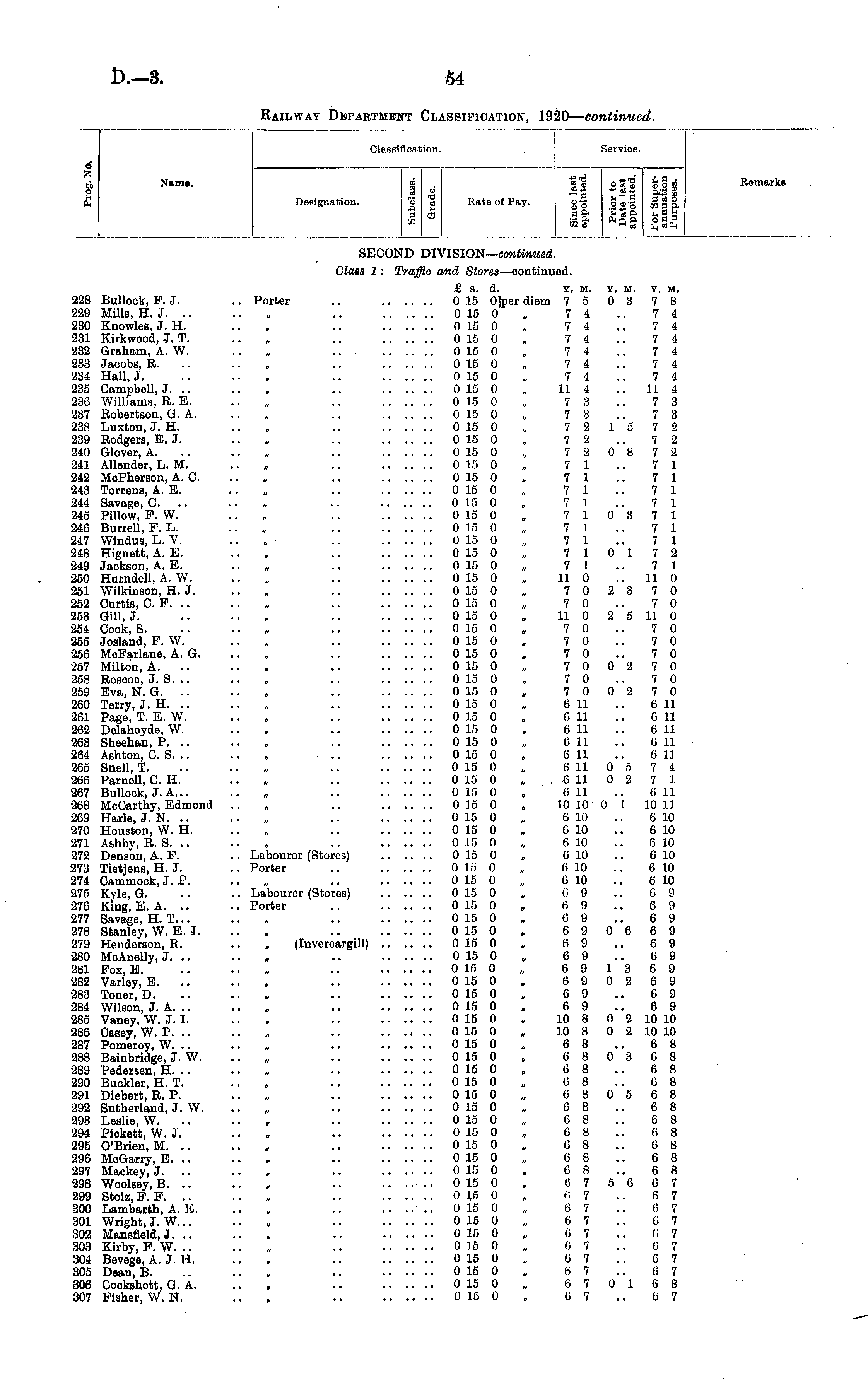 Classi: [cation. Service. Z A Name. o Cm o V, A, o IH tl 1 ] ' it aft ||s Designation. 9 <a Kate of Pay. o-g o vP, S> a o. acs n? ."aa i-SS cc =5, fiQft oaa v 1 & *H & ato K Remark* Remark* Name. ■£13 ™ a So ■2 3 "3 Pt*o> tfl a cfl o fe «fOH SECOND DIVISION— continued. Class 1: Traffic and Stores —oontinued. 228 Bullock, F. J. 229 Mills, H. J. 230 Knowles, J. H. 231 Kirkwood, J. T. 232 Graham, A. W. 233 Jacobs, R. 234 Hall, J. 285 Campbell, J. .. 236 Williams, R. E. 237 Robertson, G. A. 238 Luxton, J. H. 239 Rodgers, E. J. 240 Glover, A. 241 Allender, L. M. 242 MoPherson, A. 0. 243 Torrens, A. E. 244 Savage, C. 245 Pillow, F. W. 246 Burrell, F. L. 247 Windus, L. V. 248 Hignett, A. E. 249 Jackson, A. E. 250 Hurndell, A. W. 251 Wilkinson, H. J. 252 Curtis, C.F. .. 253 Gill, J. 254 Cook, S. 255 Josland, F. W. 256 McFarlane, A. G. 257 Milton, A. 258 Roscoe, J. S. 259 Eva, N. G. 260 Terry, J. H. .. 261 Page, T. E. W. 262 Delahoyde, W. 263 Sheehan, P. .. 264 Ashton, CS... 265 Snell, T. 266 Parnell, 0. H. 267 Bullock, J. A... 268 McCarthy, Edmond 269 Harle, J. N. 270 Houeton, W. H. 271 Ashby, R. S. 272 Denson, A. F. 273 Tietjens, H. J. 274 Cammock, J. P. 275 Kyle, G. 276 King, E. A. 277 Savage, H. T... 278 Stanley, W. E. J. 279 Henderson, R. 280 MoAnelly, J. .. 281 Fox, E. 282 Varley, E. 283 Toner, D. 284 Wilson, J. A. 285 Vaney, W. J. I. 286 Casey, W. P. 287 Pomeroy, W. .. 288 Bainbridge, J. W. 289 Pederson, H. .. 290 Buckler, H. T. 291 Diebert, R. P. 292 Sutherland, J. W. 293 Leslie, W. 294 Piokett, W. J. 295 O'Brion, M. .. 296 MoGarry, B. .. 297 Maokey, J. .. 298 Woolsey, B. .. 299 Stolz, F. F. 300 Lambarth, A. B. 301 Wright, J. W... 302 Mansfield, J. .. 303 Kirby, F. W. .. 304 Bevoge, A. J. H. 305 Dean, B. 306 Cookshott, G. A. 307 Fisher, W. N. £ S. d. Y. M. Y. M. Y. M. .. Porter .. 0 15 0]per diem 7 5 0 3 7 8 0 15 0 „ 7 4 .. 7 4 0 15 0 , 7 4 .. 7 4 0 15 0 „ 7 4 .. 7 4 0 15 0 „ 7 4 .. 7 4 0 15 0 „ 7 4 .. 7 4 0 15 0 „ 7 4 .. 7 4 0 15 0 „ 11 4 ..114 0 15 0 „ 7 3 .. 7 3 0 15 0 „ 7 3 .. 7 3 0 15 0 „ 7 2 15 7 2 0 15 0 „ 7 2 .. 7 2 0 15 0 „ 7 2 0 8 7 2 0 15 0 „ 7 1 .. 7 1 0 15 0 , 7 1 .. 7 1 0 15 0 „ 7 1 .. 7 1 0 15 0 „ 7 1 .. 7 1 0 15 0 „ 7 10 3 7 1 0 15 0 „ 7 1 .. 7 1 0 15 0 „ 7 1 .■. 7 1 0 15 0 „ 7 10 17 2 0 15 0 „ 7 1 .. 7 1 0 15 0 „ 11 0 .. 11 0 0 15 0 , 7 0 2 3 7 0 0 15 0 „ 7 0 .. 7 0 0 15 0 , 11 0 2 5 11 0 0 15 0 „ 7 0 .. 7 0 0 15 0 . 7 0 .. 7 0 0 15 0 . 70 .. 70 0 15 0 „ 7 0 0 2 7 0 0 15 0 „ 7 0 .. 7 0 0 15 0 . 7002 70 0 15 0 . 6 11 .. 6 11 0 15 0 , 6 11 .. 6 11 0 15 0 . 6 11 .. 6 11 0 15 0 . 6 11 .. 6 11 .. 0 15 0 . 6 11 .. 6 11 0 15 0 „ 6 11 0 5 7 4 0 15 0 , , 6 11 0 2 7 1 0 15 0 , 6 11 .. 6 11 0 15 0 „ 10 10 0 1 10 11 0 15 0 „ 6 10 .. 6 10 0 15 0 , 6 10 .. 6 10 0 15 0 „ 6 10 .. 6 10 .. Labourer (Stores) 0 15 0 . 6 10 .. 6 10 .. Porter .. 0 15 0 „ 6 10 .. 6 10 0 15 0 „ 6 10 .. 6 10 .. Labourer (Stores) 0 15 0 , 6 9 .. 6 9 .. Porter .. 0 15 0 „ 6 9 .. 6 9 0 15 0 , 6 9 .. 6 9 0 15 0 . 6 9 0 6 6 9 (Invorcargill) 0 15 0 . 0 9 .. 6 9 0 15 0 . 6 9 .. 6 9 0 15 0 „ 6 9 13 6 9 0 15 0 . 690269 0 15 0 „ 6 9 .. 6 9 0 15 0 . 69 .. 69 0 15 0 . 10 8 0 2 10 10 .... .. 0 15 0 „ 10 8 0 2 10 10 0 15 0 „ 6 8 .. 6 8 0 15 0 „ 680368 0 15 0 „ 6 8 .. 6 8 0 15 0 „ 6 8 .. 6 8 0 15 0 „ 6 8 0 5 6 8 0 15 0 „ 6 8 .. 6 8 0 15 0 „ 6 8 .. 6 8 0 15 0 „ 6 8 .. 6 8 0 15 0 . 6 8 .. 6 8 0 15 0 „ 6 8 .. 6 8 0 15 0 , 68 .. 68 ...... 0 15 0 „ 6 7 5 6 6 7 0 1.5 0 „ 6 7 .. 6 7 0 15 0 „ 6 7 .. 6 7 0 15 0 „ 6 7 .. 6 7 0 15 0 „ 6 7 .. 6 7 0 15 0 „ 6 7 .. 6 7 0 15 0 „ 0 7 .. 6 7 0 15 0 „ 6 7 .. 6 7 0 15 0 , 670168 0 15 0 , 0 7 .. 6 7