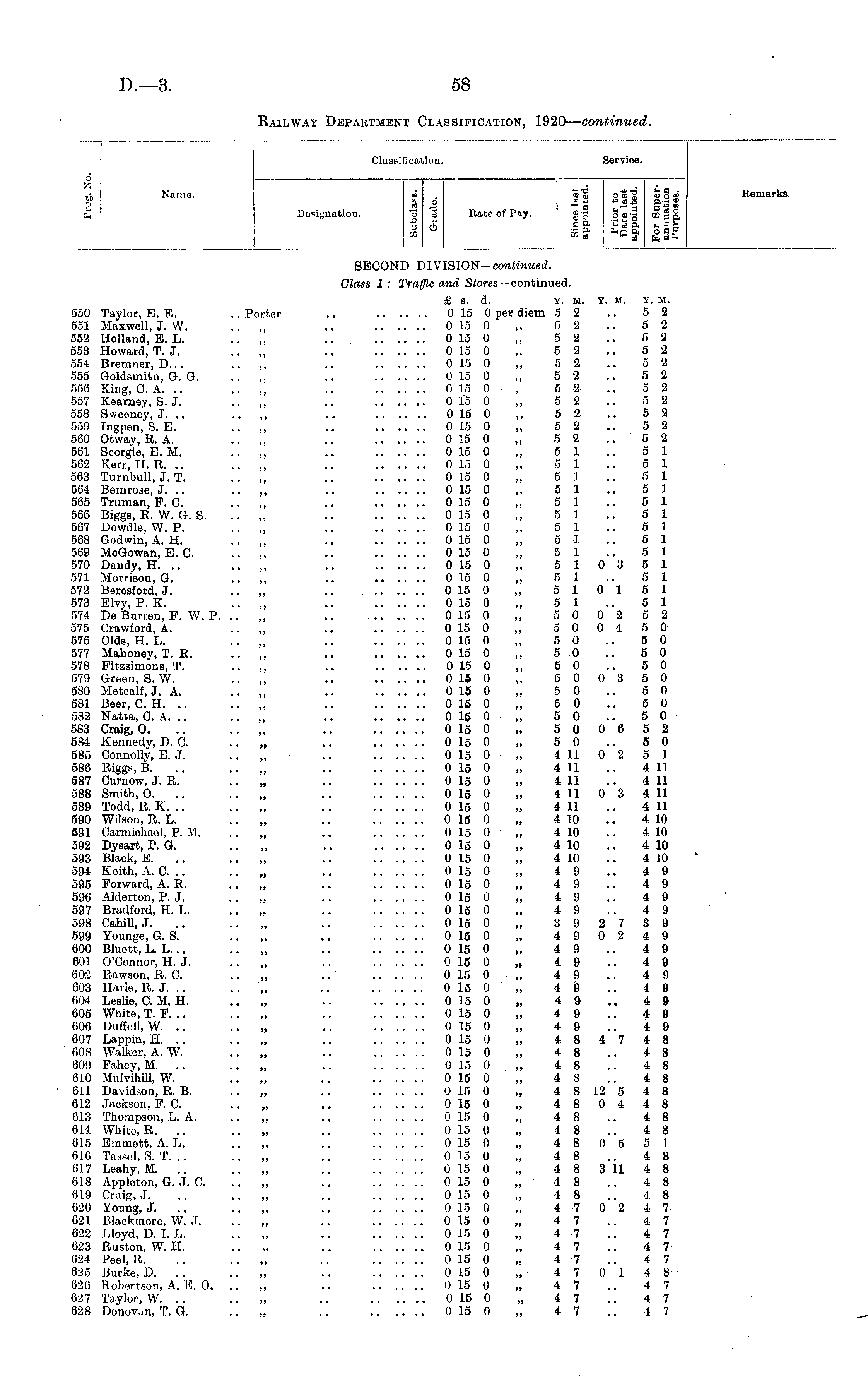 Classification. Servl Classification. ice. Service. 6 A fA Name. o 6 A p uiassincatiic'ti. oervt. nrroi +. to to u, o to HI 9 £ *n **£ 9 13 a . r Designation. t <e Bate of Pay. g-g o cd D t§ a o, ' a -g coo cog- rt P ft si's C 4_J ->«« ctJ.2 2.^.3 o o> .2 2 3 a to B ce a, Kg 1 *<Q§. ice. .rrj i. a . 3 9 9 o OO a a a o IS m a» 19, i,£S o o, oaa J cS to "to il, a . 01 o OO C-v.00 CD or« m ,0*0 co 3 ft 3a a Ec cap. Be Remarks. SECOND DIVISION- continued. Class 1 : Traffic and .Stores—oontinued. 550 Taylor, E. E. .. Porter 551 Maxwell, J. W. .. ,, 552 Holland, E. L. .. ,, 553 Howard, T. J. .. ,, 554 Bremner, D... .. ,, 555 Goldsmith, G. G. .. ,, 556 King, 0. A. .. .. ,, 557 Kearney, S. J. .. ,, 558 Sweeney, J. .. .. ,, 559 Ingpen, S. E. ,, 560 Otway, R. A. .. „ 561 Soorgie, E. M. .. ,, 562 Kerr, H. R. .. .. ,, 563 Turnbull, J. T. .. ,, 564 Bemrose, J. .. .. ,, 565 Truman, F. C 566 Biggs, R. W. G. S. .. ,, 567 Dowdle, W. P. .. ,, 568 Godwin, A. H. .. ,, 569 McGowan, E. 0. .. ,, 570 Dandy, H. .. .. ,, 571 Morrison, G. ,, 572 Beresford, J. .. ,, 573 Elvy, P. K. .. ,, 574 De Burren, F. W. P 575 Crawford, A. ,, 576 Olds, H. L. .. ,, 577 Mahoney, T. R. .. ,, 578 Fitzsimons, T. .. ,, 579 Green, S. W. •• ,, 580 Metcalf, J. A. .. ,, 581 Beer, 0. H. .. .. „ 582 Natta, 0. A. .. .. ,, 583 Craig, O. .. .. „ 584 Kennedy, D. C 585 Connolly, E. J. 586 Riggs, B. .. 587 Curnow, J. R. .. „ 588 Smith, 0. .. 589 Todd, R. K. .. .. „ 590 Wilson, R. L. 591 Carmiohael, P. M. .. „ 592 Dysart, P. G. 593 Black, E. 594 Keith, A. C .. 595 Forward, A. R. 596 Alderton, P. J. 597 Bradford, H. L. 598 Cahill, J. 599 Younge, G. S. 600 Bluott, L. L... 601 O'Connor, H. J. 602 Rawson, R. C 603 Harle, R. J. .. .. „ 604 Leslie, C. M. H. .. „ 605 White, T. F. .. 606 DtifEoU, W. .. .. „ 607 Lappin, H. .. 608 Walker, A. W. 609 Fahey, M. .. 610 Mulvihffl, W. .. „ 611 Davidson, R. B. .. 612 Jackson, F. 0. 613 Thompson, L. A. .. „ 614 White, R. .. .. „ 615 Emmott, A. L. .. „ 616 Tassel, S. T. .. .. „ 617 Leahy,M. .. .. „ 618 Appleton, G. J. C. 619 Craig, J. 620 Young, J. .. .. „ 621 Blackmore, W. J. .. ,, 622 Lloyd, D. I. L. 623 Ruston, W. H. 624 Peel, R. .. .. 625 Burke, D. .. .. „ 626 Robertson, A. E. O. .. 627 Taylor, W. .. .. „ 628 Donovan, T. G. .. „ £ s. d. Y. M. Y. M. 0 15 0 per diem 5 2 0 15 0 „•■ 5 2 0 15 0 ,, 5 2 0 15 0 ,, 5 2 0 15 0 ,, 5 2 0 15 0 ,, 5 2 0 15 0 , 5 2 0 15 0 ,, 5 2 0 15 0 ,, 5 2 0 15 0 ,, 5 2 0 15 0 ,, 5 2 0 15 0 ,, 5 1 0 15 0 ,, 5 1 0 15 0 ,, 5 1 0 15 0 ,, 5 1 0 15 0 ,, 5 1 0 15 0 ,, 5 1 0 15 0 ,, 5 1 0 15 0 ,, 5 1 0 15 0 ,, 5 1 0 15 0 ,, 5 1 0 3 0 15 0 ,, 5 1 0 15 0 ,, 5 1 0 1 0 15 0 ,, 5 1 0 15 0 ,, 5 0 0 2 0 15 0 ,, 5 0 0 4 0 15 0 ,, 5 0 0 15 0 ,, 5 0 0 15 0 ,, 5 0 0 15 0 ,, 5 0 0 3 0 15 0 „ 5 0 0 15 0 ,, 5 0 0 15 0 ,, 5 0 0 15 0 „ 5 0 0 6 0 15 0 „ 5 0 0 15 0 „ 4 11 0 2 0 15 0 „ 4 11 0 15 0 „ 4 11 0 15 0 „ 4 11 0 3 0 15 0 „ 4 11 0 15 0 „ 4 10 0 15 0 „ 4 10 0 15 0 „ 4 10 0 15 0 „ 4 10 0 15 0 „ 4 9 0 15 0 „ 4 9 0 15 0 „ 4 9 0 15 0 „ 4 9 0 15 0 „ 3 9 2 7 0 15 0 „ 4 9 0 2 0 15 0 „ 4 9 0 15 0 „ 4 9 0 15 0 ■ „ 4 9 0 15 0 „ 4 9 0 15 0 „ 4 9 0 15 0 „ 4 9 0 15 0 „ 4 9 0 15 0 „ 4 8 4 7 0 15 0 „ 4 8 0 15 0 „ 4 8 0 15 0 „ 4 8 0 15 0 „ 4 8 12 5 0 15 0 „ 4 8 0 4 0 15 0 „ 4 8 0 15 0 „ 4 8 0 15 0 „ 4 8 0 5 0 15 0 „ 4 8 0 15 0 ,, 4 8 3 11 0 15 0 „ 4 8 0 1.5 0 „ 4 8 0 15 0 „ 4 7 0 2 0 15 0 „ 4 7 0 15 0 „ 4 7 0 15 0 „ 4 7 0 15 0 „ 4 7 0 15 0 „ 4 7 0 1 0 15 0 „ 4 7 0 15 0 „ 4 7 0 15 0 „ 4 7 Y. M. 5 2 5 2 5 2 5 2 5 2 5 2 5 2 5 2 5 2 5 2 5 2 5 1 5 1 5 1 5 1 5 1 5 1 5 1 5 1 5 1 5 1 5 1 5 1 5 1 5 2 5 0 5 0 5 0 5 0 5 0 5 0 5 0 5 0 5 2 5 0 5 1 4 11 4 11 4 11 4 11 4 10 4 10 4 10 4 10 4 9 4 9 4 9 4 9 3 9 4 9 4 9 4 9 4 9 4 9 4 9 4 9 4 9 4 8 4 8 4 8 4 8 4 8 4 8 4 8 4 8 5 1 4 8 4 8 4 8 4 8 4 7 4 7 4 7 4 7 4 7 4 8 4 7 4 7 4 7 *