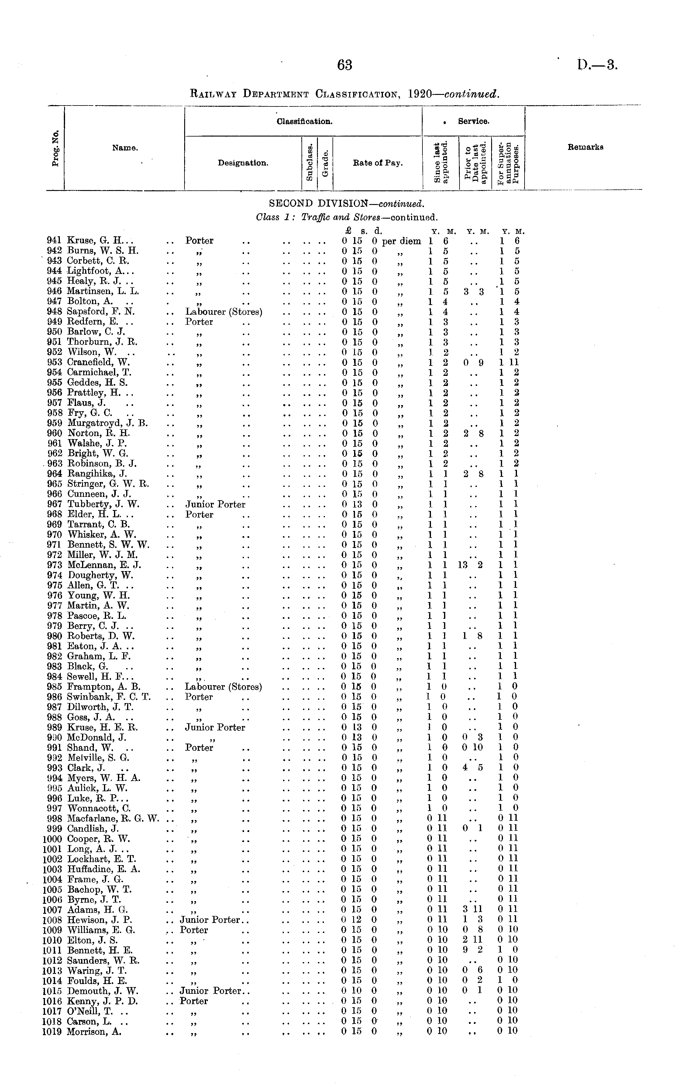 Classification. e Service. 6 Z A o fa Name. Designation. m CC | O fl P CC ll si? Hi 9° .25 3 m a a. o« j* a g. h a § Bemarkd cS 5 Bate of Pay. SECOND DIVISION— continued. Glass 1 : Traffic and Stores —continued. £ s. d. Y. M. Y. M. 941 Kruse, G. H... .. Porter .. 0 15 0 per diem 16 942 Burns, W. S. H. .. „ .. 0 15 0 „ 15 943 Corbett, C. R. .. „ .. 0 15 0 „ 15 944 Lightfoot, A... .. „ .. 0 15 0 „ 15 945 Healy, R. J. .. .. „ .. 0 15 0 ,. 15 946 Martinson, L. L. .. „ .. 0 15 0 „ 15 3 3 947 Bolton, A. .. . „ .. 0 15 0 „ 14 948 Sapsford, F. N. .. Labourer (Stores) 0 15 0 „ 14 949 Redfern, E. .. .. Porter ' .. 0 15 0 „ 13 950 Barlow, C J. .. „ .. 0 15 0 „ 13 951 Thorburn, J. R .. 0 15 0 „ 13 952 Wilson, W. .. .. „ .. 0 15 0 „ 12 953 Cranefield, W. .. „ .. 0 15 0 „ 12 0 9 954 Carmichael, T. .. „ .. 0 15 0 „ 12 955 Geddes, H. S. .. „ .. 0 15 0 „ 12 956 Prattley, H. .. .. „ .. 0 15 0 „ 12 957 Flaus, J. .. .. „ .. 0 15 0 „ 12 958 Fry, G. C .. .. „ .. 0 15 0 „ 12 959 Murgatroyd, J. B. .. „ .. 0 15 0 „ 12 960 Norton, R. H- .. „ .. 0 15 0 „ 12 2 8 961 Walshe, J. P. .. „ .. 0 15 0 „ 12 962 Bright, W. G. .. „ .. 0 15 0 „ 12 963 Robinson, B. J. .. „ .. 0 15 0 „ 12 964 Rangihika, J. .. ,, .. 0 15 0 „ 112 8 965 Stringer, G. W. R. .. „ .. 0 15 0 „ II 960 Cunneen, J. J. .. „ .. 0 15 0 „ 11 967 Tubberty, J. W. .. Junior Porter 0 13 0 „ 11 968 Elder, H. L. .. .. Porter .. 0 15 0 ., 11 969 Tarrant, C B. .. „ .. 0 15 0 „ 11 970 Whisker, A. W. .. „ .. 0 15 0 „ 11 971 Bennett, S. W. W. .. „ .. 0 15 0 ,,.11 972 Miller, W. J. M .. 0 15 0 „ 11 973 McLennan, E. J. .. „ .. 0 15 0 „ 1 1 13 2 974 Dougherty, W. .. „ .. 0 15 0 „ 11 975 Allen, G. T. .. .. „ .. 0 15 0 „ 11 976 Young, W. H. .. „ .. 0 15 0 „ 11 977 Martin, A. W. .. „ .. 0 15 0 „ 11 978 Pascoe, R. L. .. „ .. 0 15 0 „ 11 979 Berry, C. J. .. .. „ .. 0 15 0 „ 11 980 Roberts, D. W. .. „ .. 0 15 0 „ 1118 981 Eaton, J. A. .. .. „ .. 0 15 0 „ 11 982 Graham, L. F. .. „ .. 0 15 0 „ 11 983 Black, G. .. .. „ .. 0 15 0 „ 11 984 Sewell, H. F... .. „ .. 0 15 0 „ 11 985 Frampton, A. B. .. Labourer (Stores) 0 15 0 „ 10 986 Swinbank, F. C T. .. Porter ' ,. 0 15 0 „ 10 987 Dilworth, J. T. .. „ .. 0 15 0 „ 10 988 Goss, J. A. .. .. „ .. 0 15 0 „ 10 989 Kruse, H. E. R. .. Junior Porter 0 13 0 „ 10 900 McDonald, J. .. „ 0 13 0 „ 10 0 3 991 Shand, W. .. .. Porter .. 0 15 0 „ 1 0 0 10 992 Melville, S. G. .. „ .. 0 15 0 „ 10 993 Clark, J. .. .. „ .. 0 15 0 „ 10 4 5 994 Myers, W. H. A. .. „ .. 0 15 0 „ 10 995 Aulick, L. W. .. „ .. 0 15 0 „ 10 996 Luke, R. P... .. „ .. 0 15 0 „ 10 997 Wonnacott, 0. .. „ .. 0 15 0 „ 10 998 Macfarlane, R. G. W. .. „ .. 0 15 0 „ 0 11 999 Candlish, J. .. „ .. 0 15 0 „ 0 11 0 1 L000 Cooper, R. W. .. „ .. 0 15 0 „ 0 11 L001 Long, A. J. .. .. „ .. 0 15 0 „ 0 11 L002 Lockhart, E. T. .. „ .. 0 15 0 „ 0 11 1003 Huffadine, E. A. .. „ .. ...... 0 15 0 „ 011 1004 Frame, J. G. „ .. 0 15 0 „ 0 11 [005 Baehop, W. T. .. „ .. 0 15 0 „ 0 11 1000 Byrne, J. T. .. „ .. 0 15 0 „ 0 11 1007 Adams, H. G. .. „ .. 0 15 0 „ Oil 311 1008 Hewison, J. P. .. Junior Porter.. 0 12 0 „ 0 11 1 3 1009 Williams, E. G. .. Porter .. 0 15 0 „ 0 10 0 8 010 Elton, J. S. .. „ .. 0 15 0 „ 0 10 2 11 011 Bennett, H. E. .. „ .. 0 15 0 „ 0 10 9 2 1012 Saunders, W. R. .. „ .. 0 15 0 „ 0 10 .013 Waring, J. T. .. „ .. 0 15 0 „ 0 10 0 6 .014 Foulds, H. E. .. „ .. 0 15 0 „ 0 10 0 2 015 Demouth, J. W. .. Junior Porter.. 0 10 0 „ 0 10 0 1 016 Kenny, J. P. D. .. Porter .. 0 15 0 „ 0 10 .017 O'Neill, T. .. .. „ .. 0 15 0 „ 0 10 .018 Carson, L. .. .. „ .. 0 15 0 ,," 0 10 .019 Morrison, A. .. „ ,. 0 15 0 „ 0 10 Y. M. 1 6 1 5 1 5 1 5 1 5 '1 5 I 4 1 4 1 3 1 3 1 3 I 2 1 11 I 2 1 2 1 2 1 2 1 2 1 2 1 2 1 2 1 2 1 2 1 1 1 1 1 1 1 1 1 1 1 1 1 1 1 1 1 1 1 1 1 1 1 1 1 1 1 1 1 1 1 1 1 1 1 1 1 1 1 1 1 1 1 0 1 0 I 0 1 0 1 0 1 0 1 0 1 0 1 0 1 0 1 0 1 0 1 0 0 11 0 11 0 11 0 11 0 11 0 11 0 11 0 11 0 11 0 11 0 11 0 10 0 10 1 0 0 10 0 10 1 0 0 10 0 10 0 10 0 10 0 10