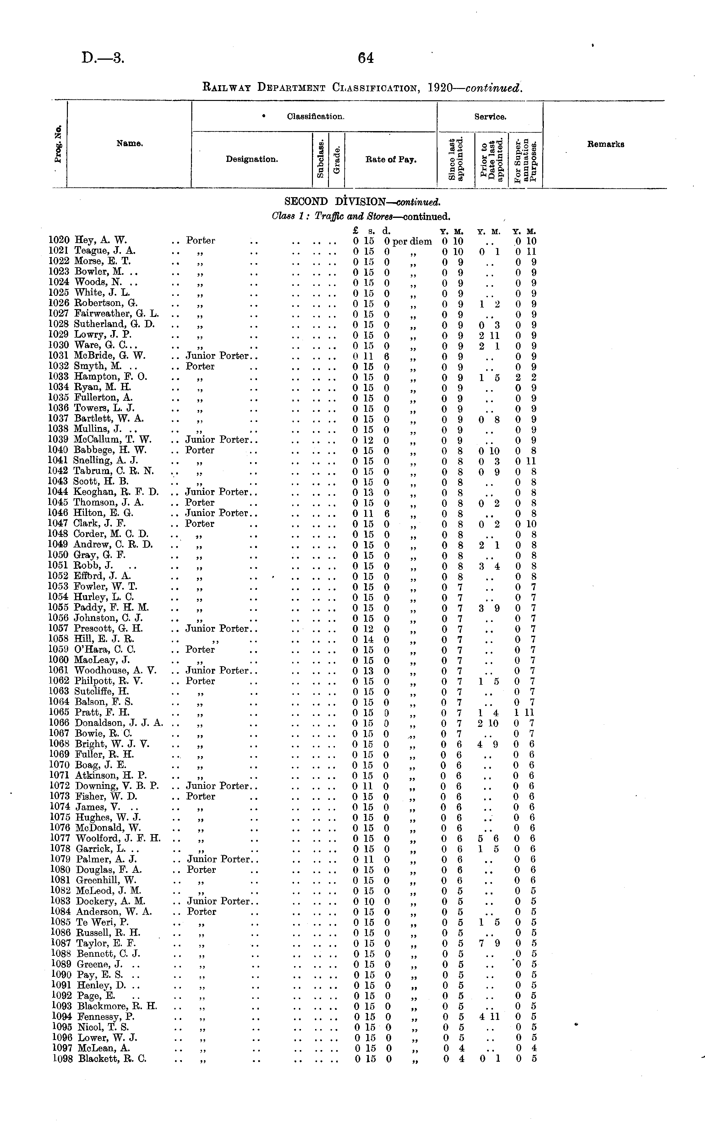 Classification. Service. 6 A % u to Name. CO ca A a Kate of Pay. o.a >h~5 a ca o go .223 ma to 'rT, to fan Pi O S3p m c8 H ca fa cafa Remarks Designation. CD "H 3 o SECOND DIVISION— continued. Glass 1: Traffic and Stores —continued. 1020 Hey, A. W. .. Porter 1021 Teague, J. A. 1022 Morse, E. T. „ 1023 Bowler, M. .. 1024 Woods, N. .. 1025 White, J. L. 1026 Robertson, G. 1027 Fairweather, G. L. .. 1028 Sutherland, G. D. .. 1029 Lowry, J. P. 1030 Ware, G. C.. 1031 McBride, G. W. .. Junior Porter.. 1032 Smyth, M. .. .. Porter 1033 Hampton, F. O. 1034 Ryan, M. H. 1035 Fullerton, A. 1036 Towers, L. J. 1037 Bartlett, W. A. 1038 Mullins, J. .. 1039 MeCallum, T. W. .. Junior Porter.. 1040 Babbege, H. W. .. Porter 1041 Snelling, A. J. 1042 Tabrum, 0. R. N. 1043 Scott, H. B. .. „ 1044 Keoghan, R. F. D. .. Junior Porter.. 1045 Thomson, J. A. .. Porter 1046 Hilton, E. G. .. Junior Porter.. 1047 Clark, J. F. .. Porter 1048 Corder, M. C. D. .. „ 1049 Andrew, C R. D. 1050 Gray, G. F. 1051 Robb, J. .. .. „ 1052 Effbrd, J. A. 1053 Fowler, W. T. 1054 Hurley, L. C. 1055 Paddy, F. H. M. 1056 Johnston, C.J. 1057 Prescott, G. H. .. Junior Porter.. 1058 Hill, E. J. R. 1059 O'Hara, CC, .. Porter 1060 MacLeay, J. 1061 Woodhouse, A. V. .. Junior Porter.. 1062 Philpott, R. V. .. Porter 1063 Sutciiffe, H. „ 1004 Balson, F. S. 1065 Pratt, F. H. 1066 Donaldson, J. J. A. .. 1067 Bowie, R. 0. 1068 Bright, W. J. V. 1069 Fuller, R. H. .. „ 1070 Boag, J. E. 1071 Atkinson, H. P. .. „ 1072 Downing, V. B. P. .. Junior Porter.. 1073 Fisher, W. D. .. Porter 1074 James, V. .. .. „ 1075 Hughes, W. J. 1076 McDonald, W. 1077 Woolford, J. F. H. .. 1078 Garrick, L. .. 1079 Palmer, A. J. .. Junior Porter.. 1080 Douglas, F. A. .. Porter 1081 Greenhill, W. .. „ 1082 McLeod, J. M. 1083 Dockery, A. M. .. Junior Porter.. 1084 Anderson, W. A. .. Porter 1085 To Weri, P. 1086 Russell, R. H. 1087 Taylor, E. F. .. „ 1088 Bennett, C J. 1089 Greene, J. .. 1090 Pay, E. S. .. 1091 Henley, D. .. 1092 Page, E. .. „ 1093 Blackmore, R. H. 1094 Fennessy, P. 1095 Niool, T. S. .. „ 1096 Lower, W. J. „ 1097 McLean, A. 1-098 Blackett, R. C £ s. d. Y. M. 0 15 0 per diem 0 10 0 15 0 „ 0 10 0 15 0 „ 0 9 0 15 0 „ 0 9 0 1.5 0 „ 0 9 0 15 0 „ 0 9 0 15 0 „ 0 9 0 15 0 „ 0 9 0 15 0 „ 0 9 0 15 0 „ 0 9 0 15 0 „ 0 9 0 II 6 „ 0 9 0 15 0 „ 0 9 0 15 0 „ 0 9 0 15 0 „ 0 9 0 15 0 „ 0 9 0 15 0 „ 0 9 0 15 0 „ 0 9 0 15 0 „ 0 9 0 12 0 „ 0 9 0 15 0 „ 0 8 0 15 0 „ 0 8 0 15 0 „ 0 8 0 15 0 „ 0 8 0 13 0 „ 0 8 0 15 0 „ 0 8 0 11 6 „ 0 8 0 15 0 „ 0 8 0 15 0 „ 0 8 0 15 0 „ 0 8 0 15 0 „ 0 8 0 15 0 „ 0 8 - 0 15 0 „ 0 8 0 15 0 „ 0 7 0 15 0 „ 0 7 0 15 0 „ 0 7 0 15 0 „ 0 7 0 12 0 „ 0 7 0 14 0 „ 0 7 0 15 0 „ 0 7 0 15 0 „ 0 7 0 13 0 „ 0 7 0 15 0 „ 0 7 0 15 0 „ 0 7 0 15 0 „ 0 7 0 15 0 „ 0 7 0 15 0 „ 0 7 0 15 0 „ 0 7 0 15 0 „ 0 6 0 15 0 „ 0 6 0 1.5 0 „ 0 6 0 15 0 „ 0 6 0 11 0 „ 0 6 0 1.5 0 „ 0 6 0 15 0 „ 0 6 0 15 0 „ 0 6 0 15 0 „ 0 6 0 15 0 „ 0 6 0 15 0 „ 0 6 0 11 0 „ 0 6 0 15 0 „ 0 6 0 15 0 „ 0 6 0 15 0 „ 0 5 0 10 0 „ 0 5 0 15 0 „ 0 5 0 15 0 „ 0 5 0 15 0 „ 0 5 0 1.5 0 „ 0 5 0 15 0 „ 0 5 0 15 0 „ 0 5 0 15 0 „ 0 5 0 15 0 „ 0 5 0 15 0 „ 0 5 0 15 0 „ 0 5 0 15 0 „ 0 5 0 15 0 „ 0 5 0 15 0 „ 0 5 0 15 0 „ 0 4 0 15 0 „ 0 4 Y. M. Y. M. 0 10 0 1 0 11 0 9 0 9 0 9 0 9 12 0 9 0 9 0 3 0 9 2 11 0 9 2 10 9 0 9 0 9 15 2 2 0 9 0 9 0 9 0 8 0 9 0 9 0 9 0 10 0 8 0 3 0 11 0 9 0 8 0 8 0 8 0 2 0 8 0 8 0 2 0 10 0 8 2 10 8 0 8 3 4 0 8 0 8 0 7 0 7 3 9 0 7 0 7 0 7 0 7 0 7 0 7 0 7 15 0 7 0 7 0 7 14 1 11 2 10 0 7 0 7 4 9 0 6 0 6 0 6 0 6 0 0 0 6 0 6 0 0 0 6 5 6 0 6 1 5 0 6 0 6 0 6 0 6 0 5 0 5 0 5 15 0 5 0 5 7 9 0 5 0 5 '0 5 0 5 0 5 0 5 0 5 4 11 0 5 0 5 0 5 0 4 0 10 5 •