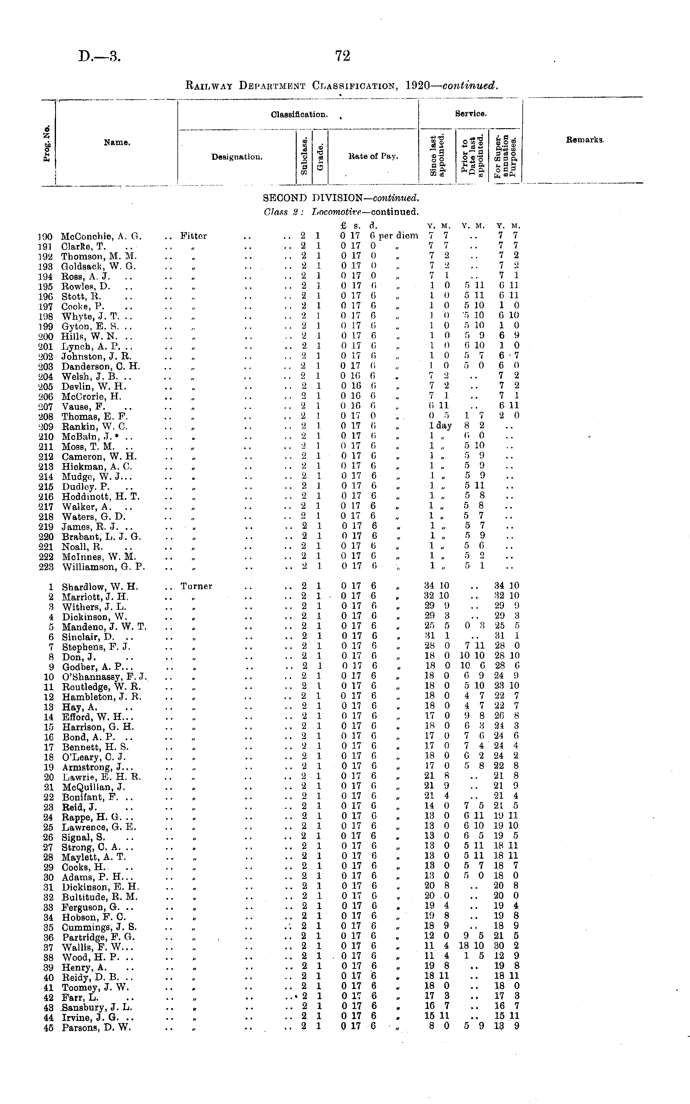 o ■ Z A Name. p £ Designation. , . Classification. , Service. ca a .a £ " *h a03 to "3 la Bate of Pay. g| gj| = g ° a 3 aa'S-gaca" Classification. Service. EeiTiarks. SECON D I nVISION—continued. Class 2 : Locomotive —oontinued. 190 McConchie, A. G. .. Fitter 191 Clarke, T. .. ... ', 192 Thomson, M. M. .... 193 Goldsack, W. G. .. „ .. 194 Ross, A. J. .. 195 Rowles, D. .. 196 Stott, R. .. 197 Cooke, P. 198 Whyte, J. T. .. 199 Gyton, E. S. .. 200 Hills, W.N. .. 201 Lynch, A. P. .. 202 Johnston, J. R. .. „ 203 Danderson, C H. 204 Welsh, J. B. .. 205 Devlin, W. H. .. „ 206 MoCrorio, H. .. „ 207 Vause, F. .. 208 Thomas, E, F. 209 Rankin, W. C 210 McBain, J. • .. 211 Moss, T. M. .. 212 Cameron, W. H. .. „ 213 Hickman, A. 0. 214 Mudge, W.J... 215 Dudley. P. .. 216 Hoddinott, H. T. 217 Walker, A. .. .. „ 218 Waters, G. D. 219 James, R. J. .. 220 Brabant, L. J. G. 221 Noall, R. .. 222 Mclnnes, W. M. 228 Williamson, G. P. £ s. d. Y. M. Y. M. Y. M. ..2 1 0 17 6 per diem 7 7 .. 7 7 ..2 1 0 17 0 „ 7 7 .. 7 7 ..21 0 17 0 „ 72 .. 72 ..21 0 17 0 „ 72 .. 7 2 ..2 1 0 17 0 „ 7 1 .. 7 1 ..2 1 0 17 6 „ 10 5 11 6 1.1 ..2 1 0 17 6 „ I 0 5 11 6 11 ..2 1 0 17 0 , 1 0 5 10 1 0 ..21 0 17 6 „ 1 0 5 10 6 10 ..21 0 17 6 „ 1 0 5 10 1 0 .. 2 .1 0 1.7 6 , 10 5 9 6 9 .. 2 1 0 1.7 6 „ 1 0 6 10 3 0 .. 2 1 0 17 6 „ .10 5 7 6-7 ..2 1 0 17 6 „ 10 5 0 6 0 ..21 0 16 6 . 72 .. 72 ..2 1 0 16 6 „ 7 2 .. 7 2 ..2 1 0 16 6 „ 7 1 .. 7 1 ..21 0 16 6 „ 6 11 .. 6 11 ..21 0 17 0 „ 0 5 1 7 2 0 .. 2 1 0 1.7 6 „ Iday 8 2 ..21 0 1.7 6 „ I „ 60 .. ■>, 1 0 1.7 6 „ 1 „ 5 10 .. 2 1 0 17 6 „ 1 „ 5 9 ..2 1 0 17 6 , 1 „ 5 9 ..2 1 0 17 6 „ 1 , 5 9 ..2 1 0 17 6 „ 1 „ 5 11 ..2 1 0 1.7 6 „ 1 „ 5 8 ..2 1 0 17 6 „ 1 „ 5 8 ..21 0 17 6 „ 1 „ 57 ..2 1 0 17 6 „ 1 „ 5 7 ..21 0 17 6 „ 1 „ 59 ..2 1 0 17 6 „ 1 „ 5 6 .. 2 1 0 17 6 „ 1 , 5 2 ..2 1 0 1.7 6 „ 1 „ 5 1 1 Shardlow, W. H. .. Turner 2 Marriott, J. H, .. „ ' 3 Withers, J. L. 4 Dickinson, W. 5 Mandeno, J. W. T. 6 Sinclair, D. .. 7 Stephens, F. J. 8 Don, J. .. .. „ 9 Godber, A. P... 10 O'Shannassy, F. J. .. „ 11 Routledge, W. R 12 Hambleton, J. R. 13 Hay, A. .. 14 Efford, W. H... .. „ 15 Harrison, G. H. 10 Bond, A. P. .. 17 Bennett, H. S. 18 O'Leary, 0. J. 19 Armstrong, J... .. 20 Lawne, E. H. R. .. „ 21 McQuillan, J. .. „ 22 Bonifant, F. .. 28 Reid, J. 24 Rappe, H. G. .. 25 Lawrence, G. B. .. „ 26 Signal, S. .. 27 Strong, CA. „ 28 Maylett, A. T. 29 Cocks, H. .. 80 Adams, P. H... 31 Dickinson, E. H. 32 Bultitude, R. M. 33 Ferguson, G. .. .. 34 Hobson, F. 0. ... 35 Cummings, J. S. 36 Partridge, F. G. 37 Wallis, F. W... 38 Wood, H. P. .. 39 Henry, A. 40 Reidy, D. B. .. 41 Toomoy, J. W. 42 Farr, L. .. 43 .Sansbury, J. L. 44 Irvine, J. G. .. 45 Parsons, D. W. ..2 1 0 17 6 „ 34 10 .. 34 10 ..2 1 0 17 6 , 32 10 .. 32 10 ..2 1 0 17 6 „ 29 9 ..29 9 ,.2 1 0 17 6 , 29 3 .. 29 3 ..2 1 0 17 6 „ 25 5 0 3 25 5 ..2 1 0 17 6 „ 81 1 .. 31 1 ..2 1 0 17 6 „ 28 0 7 11 28 0 ..2 1 0 17 6 „ 18 0 10 10 28 10 ..2 1 0 17 6 „ 18 0 10 6 28 6 ..21 0 17 6 „ 18 0 6 9 24 9 ..2 1 0 17 6 „ 18 0 5 10 23 10 ..2 1 0 17 6 „ 18 0 4 7 22 7 ..2 1 0 17 6 „ 18 0 4 7 22 7 ..21 0 17 6 „ 1.7 0 9 8 26 8 ..2 1 0 17 6 „ 18 0 6 3 24 3 ..21 0 17 6 „ 17 0 7 6 24 6 .. 2 1 0 17 6 „ 17 0 7 4 24 4 ..2 1 0 17 6 „ 18 0 6 2 24 2 ..2 1 0 17 6 „ 17 0 5 8 22 8 ..2 1 0 17 6 , 21 8 .. 21 8 ..2 1 0 17 6 „ 21 9 21 9 ..2 1 0 17 6 „ 21 4 .. 21 4 ..2 1 0 17 6 „ 14 0 7 5 21. 5 ..21 0 17 0 „ 13 0 6 11 19 11 ..2 1 0 17 6 „ 13 0 6 10 19 10 ..2 1 0 1.7 6 „ 13 0 6 5 19 5 ..2 1 0 1.7 6 „ 13 0 5 11 18 11 ..2 1 0 17 6 „ 13 0 5 11 18 11 ..2 1 0 17 6 , 13 0 5 7 18 7 ..2 1 0 17 6 „ 13 0 5 0 18 0 ..2 1 0 17 0 „ 20 8 .. 20 8 ..2 1 0 1.7 6 ., 20 0 .. 20 0 ..21 0 17 6 , 19 4 .. 19 4 ..21 0 17 6 „ 19 8 .. 19 8 .-.21 0 17 6 „ 18 9 .. 18 9 ..2 1 0 17 6 „ 12 0 9 5 21 5 ..2 1 0 17 6 , 11 4 18 10 30 2 ..2 1 0 17 6 , 11 4 1 5 12 9 ..21 0 17 6 „ 19 8 .. 19 8 ..2 1 0 17 6 , 18 11 .. 18 11 ..2 1 0 17 6 „ 18 0 .. 18 0 ..•21 0 17 6 „ 17 3 .. 17 3 ..2 1 0 17 6 „ 10 7 .. 16 7 ..2 1 0 17 6 . 15 11 .. 15 11 ..21 017 6 „ 8 0 5 9 13 9