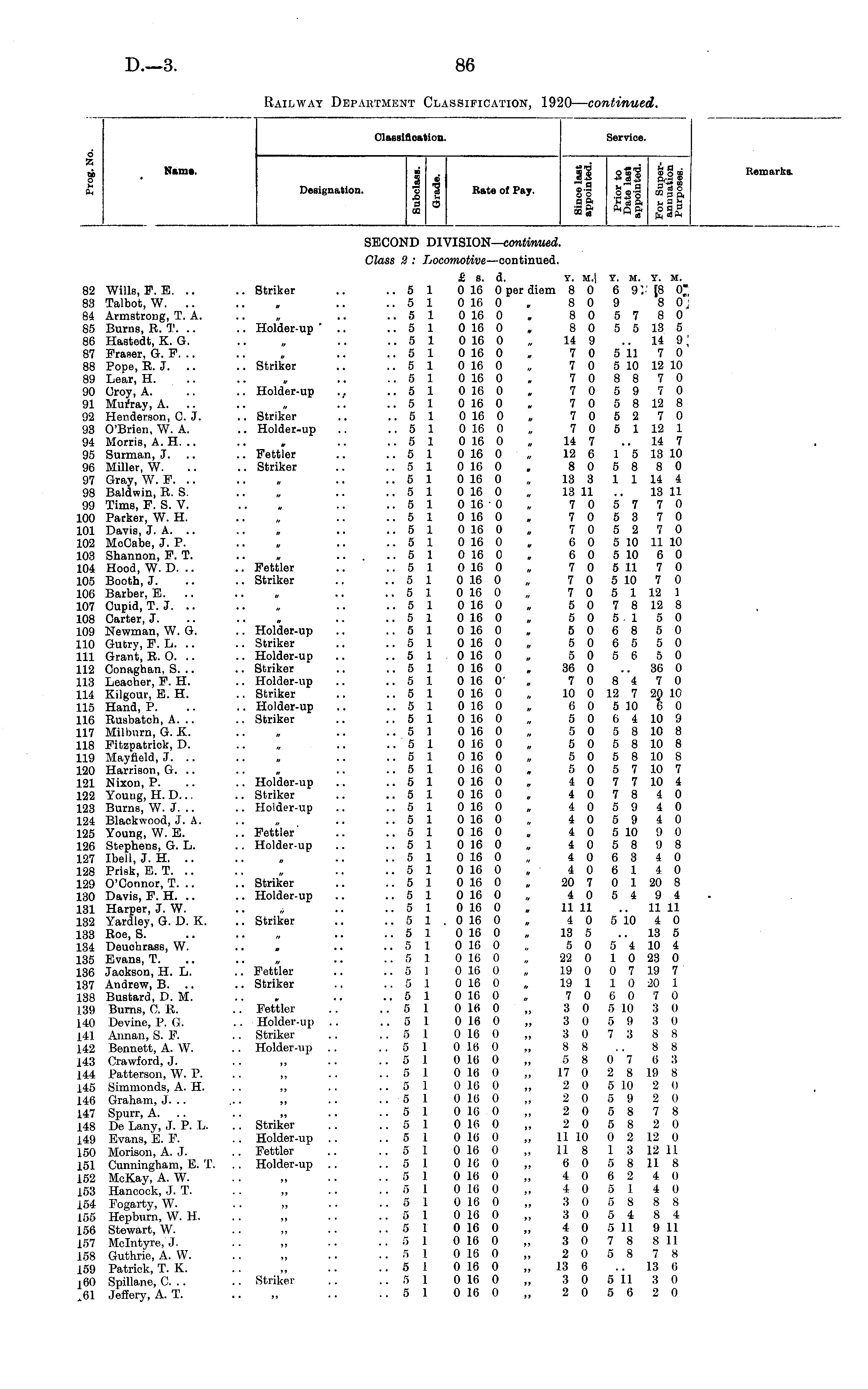 Classification. Servioe. d 15 ci CO h a, Nam*. ri £ • ■9 'A a 0 co Bate of Pay. — .a -*»ie t; fl • So .SSo t °3ft aa „ncaa n a jS & *p«. oa.a *ts J-* a ri, "to Bemarks. Designation. SECOND DIVISION— continued. Class 2 : Locomotive —continued. 82 Wills, F. B. .. 83 Talbot, W. .. 84 Armstrong, T. A. 85 Burns, R. T. .. 86 Hastedt, K. G. 87 Fraser, G. F. .. 88 Pope, R. J. .. 89 Lear, H. 90 Oroy, A. 91 Murray, A. 92 Henderson, 0. J. 93 O'Brien, W. A. 94 Morris, A. H. .. 95 Surman, J. 96 Miller, W. 97 Gray, W. F. 98 Baldwin, R. S. 99 Tims, F. S. V. 100 Parker, W. H. 101 Davis, J. A. 102 MeCabe, J. P. 103 Shannon, F. T. 104 Hood, W. D. .. 105 Booth, J. 106 Barber, E. .. 107 Cupid, T. J. 108 Carter, J. 109 Newman, W. G. 110 Gutry, F. L. 111 Grant, R. O. 112 Conaghan, S. .. 113 Leacher, F. H. 114 Kilgour, E. H. 115 Hand, P. 116 Rusbatch, A. .. 117 Milburn, G. K. 118 Fitzpatrick, D. 119 Mayfield, J. .. 120 Harrison, G. .. 121 Nixon, P. 122 Young, H. D... 123 Burns, W. J. .. 124 Blackwood, J. A. 125 Young, W. E. 126 Stephens, G. L. 127 Ibell, J. H. .. 128 Prisk, E. T. 129 O'Connor, T. .. 130 Davis, F. H. 131 Harper, J. W. 132 Yardley, G. D. K. 133 Roe, S. 134 Deuchrass, W. 135 Evans, T. 136 Jaokson, H. L. 137 Andrew, B. .. 138 Bustard, D. M. 139 Burns, C R. 140 Devine, P. G. J 41 Annan, S. F. 142 Bennett, A. VV. 143 Crawford, J. 144 Patterson, W. P. 145 Simmonds, A. H. 146 Graham, J. .. 147 Spurr, A. 148 De Lany, J. P. L. 149 Evans, E. F. 150 Morison, A. J. 151 Cunningham, E. T. 152 McKay, A. W. 153 Hancock, J. T. 164 Fogarty, W. 155 Hepburn, W. H. 156 Stewart, W. 157 Mclntyre, J. 158 Guthrie, A. W. 159 Patrick, T. K. j60 Spillane, C .. ,.61 Jeffery, A. T. .. Striker .. Holder-up .. Striker .. Holder-up .. Striker .. Holder-up .. Fettler .. Striker .. Fettler .. Striker .. Holder-up .. Striker .. Holder-up .. Striker .. Holder-up .. Striker .. Holder-up .. Striker .. Holder-up .. Striker .. Holder-up .. Pettier' .. Holder-up .. Striker .. Holder-up .. Striker .. Fett'ler .. Striker .. Fettler .. Holder-up .. Striker Holder-up . . Striker .. Holder-up .. Fettler . . Holder-up .. Striker • • J! '/ £ b. d. Y. M.j Y. M. Y. M. ..5 1 0 16 0 per diem 8 0 6 9 n ,. [8 0" ..5 1 0 16 0 „ 8 0 9 8 0,: ..51 0 16 0 „ 80 57 80 ..51 0 16 0 „ 80 55 13 5 ..51 0 16 0 „ 14 9 .. 14 9; ..51 0 16 0 „ 70 5 11 70 ..5 1 0 16 0 „ 7 0 5 10 12 10 ..51 0 16 0 „ 70 88 70 ..5 1 0 16 0 „ 7 0 5 9 7 0 ..5 1 0 16 0 „ 7 0 5 8 12 8 ..51 0 16 0 „ 70 52 70 ..5 1 0 16 0 „ 7 0 5 1 12 1 ..5 1 0 16 0 „ 14 7 .. 14 7 ..5 1 0 16 0 „ 12 6 1 5 13 10 ..51 0 16 0 „ 80 58 80 ..5 1 0 16 0 „ 13 3 1 1 14 4 ..51 0 16 0 „ 13 11 .. 13 11 ..51 0 16 0 „ 70 57 70 ..51 0 16 0 , 70 53 70 ..51 0 16 0 „ 70 52 70 ..5 1 0 16 0 „ 6 0 5 10 11 10 ..51 0 16 0 „ 60 5 10 60 ..51 0 16 0 „ 70 5 11 70 ..5 1 0 16 0 „ 7 0 5 10 7 0 ..5 1 0 16 0 „ 7 0 5 1 12 1 ..5 1 0 16 0 „ 5 0 7 8 12 8 ..51 0 16 0 „ 50 5150 ..5 1 0 16 0 „ 5 0 6 8 5 0 ..51 0 16 0 „ 50 6 5 50 ..51 0 16 0 „ 50 56 50 ..5 1 0 16 0 „ 36 0 .. 36 0 ..5 1 0 16 0 „ 7 0 8 4 7 0 ..5 1 0 16 0 „ 10 0 12 7 20 10 ..5 1 0 16 0 „ 6 0 5 10 6 0 ..51 0 16 0 „ 5 0 6 4 10 9 ..5 1 0 16 0 „ 5 0 5 8 10 8 ..5 1 0 16 0 „ 5 0 5 8 10 8 ..5 1 0 16 0 „ 5 0 5 8 10 8 ..5 1 0 16 0 „ 5 0 5 7 10 7 ..5 1 0 16 0 „ 4 0 7 7 10 4 ..51 0 16 0 „ 40 78 40 ..51 0 16 0 „ 40 5 9 40 ..51 0 16 0 „ 40 59 40 ..5 1 0 16 0 „ 4 0 5 10 9 0 ..5 1 0 16 0 „ 4 0 5 8 9 8 ..51 0 16 0 „ 40 63 40 ..51 0 16 0 „ 40 61 40 ..5 1 0 16 0 „ 20 7 0 1 20 8 ..51 0 16 0 „ 40 54 94 ..5 1 0 16 0 „ 11 11 .. 11 11 .. 5 1 . 0 16 0 „ 4 0 5 10 4 0 ..51 0 16 0 „ 13 5 .. 13 5 ..5 1 0 16 0 „ 5 0 5 4 10 4 ..5 1 0 16 0 „ 22 0 1 0 23 0 ..5 1 0 16 0 „ 19 0 0 7 19 7 .. 5 1 0 16 0 „ 19 1 1 0 20 1 ..5 1 0 16 0 „ 7 0 6 0 7 0 ..5 1 0 16 0 „ 3 0 5 10 3 O ..5 1 0 16 0 „ 3 0 5 9 3 0 ..5 1 0 16 0 „ 3 0 7 3 8 8 ..5 1 0 16 0 „ 8 8 .. 8 8 ..5 1 0 16 0 „ 5 8 0 7 0 3 ..51 0 16 0 „ 17 0 2 8 19 8 .. 5 I 0 16 0 „ 2 0 5 10 2 O .. 5 1 0 1.6 0 „ 2 0 5 9 2 O ..5 1 0 16 0 „ 2 0 5 8 7 8 ..5 1 0 16 0 „ 2 0 5 8 2 0 .. 5 1 0 16 0 „ It 10 0 2 12 0 ..5 1 0 16 0 „ 11 8 1 3 12 11 ..5 1 0 16 0 „ 6 0 5 8 11 8 .. 5 I 0 1.6 0 „ 4 0 6 2 4 0 .. 5 I 0 16 0 ,, 4 0 5 I. 4 0 .. 5 1 0 16 0 „ 3 O 5 8 8 8 ..5 1 0 16 0 „ 3 0 5 4 8 4 ..5 1 0 16 0 „ 4 0 5 11 9 11 ..5 1 0 16 0 „ 3 0 7 8 8 11 . . 5 I 0 16 0 „ 2 0 5 8 7 8 ..5 1 0 16 0 „ 13 6 .. 13 6 .. 5 I 0 16 0 „ 3 0 5 11 3 0 ..51 0 16 0 „ 20 50 20