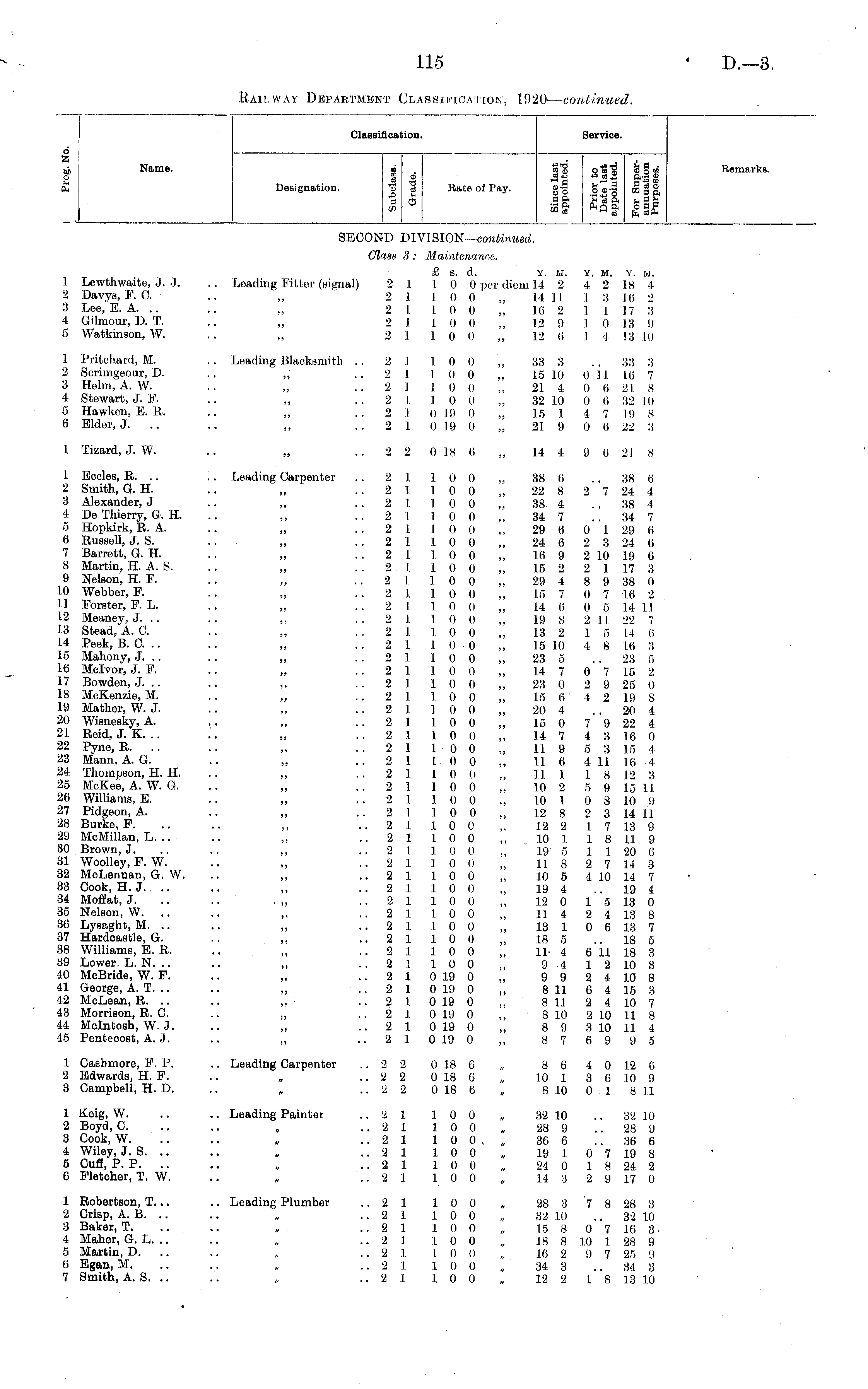 Classification. Service. 6 A A o 0. Name. Designation. 1 9 £ -a o cd A to g c5 CQ Rate of Pay. b 7 © OB'S cio o b £ -5 *= ca 2 Dtl £ c.S t-.'-'g B-gg So .33 3 "so, 3 to >i|a h a 5 3 2" ton to o fl a CO pj M £ to "iH Remarks. SECOND DIVISION continued. Glass ii: Maintenance. 1 Lewthwaite, J. ,1. 2 Davys, F. 0. 3 Lee,' E. A. 4 Gilmour, D. T. 5 Watkinson, W. £ S. d. Y. M. Y. M. Y. M. .. Leading Fitter (signal) 2 I 1 0 0 per diem 14 2 4 2 18 4 2 110 0 „ 14 11 1 3 16 2 2 110 0 „ 16 2 I 1 17 3 2 110 0 „ 12 9 I 0 13 9 2 110 0 „ 12 6 1 4 13 10 1 Pritchard, M. 2 Scrimgeour, D. 3 Helm, A. W. 4 Stewart, J. F. 5 Hawken, E. R. 6 Elder, J. .. .. Leading Blaoksmith .. 2 1 10 0 ,, 33 3 .. 33 3 ..21100 ,, 15 10 0 I I 16 7 • •21100,, 21 406 21 8 ..21100,, 32 10 0 6 32 10 2 1 0 19 0 „ 15 I 4 7 19 S ..210 19 0 „ 2.1 906 22 3 1 'lizard, J. W. ..220 18 6 „ 14 4 9 6 21 S 1 Eceles, R. .. 2 Smith, G. H. 3 Alexander, J 4 De Thierry, G. H. 5 Hopkirk, R. A. 6 Russell, J. S. 7 Barrett, G. H. 8 Martin, H. A. S. 9 Nelson, H. F. 10 Webber, F. 11 Forster, F. L. 12 Meaney, J. .. 13 Stead, A. C 14 Peek, B. C .. 15 Mahony, J. . . 16 Mclvor, J. F. 17 Bowden, J. .. 18 MeKenzie, M. 19 Mather, W. J. 20 Wisnesky, A. 21 Reid, J. K. . . 22 Pyne, R. .. 23 Mann, A. G. 24 Thompson, H. H. 25 McK.ee, A. W. G. 26 Williams, E. 27 Pidgeon, A. 28 Burke, F. 29 McMillan, L. .. 30 Brown, J. 31 Woolley, F. W. 32 MoLennan, G. W. 33 Cook, H. J., .. 34 Moffat, J. 35 Nelson, W. .. 36 Lysaght, M. .. 37 Hardcastle, G. 38 Williams, E. R. H9 Lower. L. N. 10 McBride, W. F. 41 George, A. T. .. 12 McLean, R. .. 13 Morrison, R. 0. 14 Mcintosh, W. J. 15 Pentecost, A. ,1. .. Leading Carpenter .. 2 1 10 0 ,, 38 6 .. 38 6 • •21100., 22 8 2 7 24 4 ..21100,, 38 4 . . 38 4 2 I I 0 0 34 7 .. 34 7 ■ •21100,, 29 6 0 I 29 6 • •21 I 0 0 „ 24 6 2 3 24 6 ..21100,, 16 9 2 10 19 6 ..21100,, 15 2 2 1 17 3 ..21100,, 29 4 8 9 38 0 ..21100 „ 15 707 16 2 2 I 1 0 0 „ 14 6 0 5 14 11 •2 I I 0 0 ,, 19 8 2 11 22 7 ..21100 ,, 13 2 1 5 14 6 ■ ■ 2 1 1 0 0 „ 15 10 4 8 16 3 • •21100,, 23 5 23 5 ..21100 „ 14 707 15 2 ..21100,, 23 029 25 0 ..21100,, 15 6 4 2 19 8 • •21100,, 20 4 20 4 ..21100,, 15 0 7 9 22 4 • •21100,, 14 7 4 3 16 0 2 1 10 0 11 9 5 3 15 4 ..21100 ,, 11 6 4 11 16 4 ..21100,, 11 1 1 8 12 3 ..21100,, 10 2 5 9 15 II • •21100,, 10 1 0 8 1.0 9 ..21100,, 12 8 2 3 14 11 • •21100,, 12 2 1 7 13 9 ..'21100 ,, , 10 1 1 8 11 9 ..21100,, 19 5 1 1 20 6 • •21100,, 11 8 2 7 14 3 ..21100,, 10 5 4 1.0 14 7 • •21100 ,, 19 4 19 4 • •21100 ,, 12 0 1 5 13 0 ..21100 „ 11 4 2 4 13 8 ,, ..21100 ,, 13 1 06 13 7 ,, ..21100 „ 18 5 18 5 ..21100,, 11 4 6 11 18 3 -.21100,, 9 4 1 2 10 3 ■ ■ 2 1 0 19 0 „ 9 9 2 4 10 8 ■ .. 2 1 0 19 0 ,, 8 11 6 4 15 3 ■. 2 1 0 19 0 8 11 2 4 10 7 ..210 19 0 ,, 8 10 2 10 11 8 • ■ 2 1 0 19 0 8 9 3 10 11 4 .. 2 1 0 19 0 8 7 6 9 9 5 1 Cashmore, F. P. 2 Edwards, H. F. 3 Campbell, H. D. .. Leading Carpenter ..22 0 18 6 „ 8640 12 (i .. 2 2 0 18 6 „ 10 1 3 6 10 9 ..2 2 0 18 6 „ 8 10 0 .1,8 11 1 Keig, W. 2 Boyd, 0. 3 Cook, W. 4 Wilev, J. S. 5 Cuff," P. P. .. 6 Fletoher, T. W. .. Leading Painter ..21 100 „ 32 10 .. 32 10 ..21100,, 28 9 .. 28 9 -.21 100,,, 36 6 36 6 ..2 1 10 0 „ 19 1 0 7 19 8 ..21100,, 24 0 1 8 24 2 -.21100,, 14 3 2 9 17 0 1 Robertson, T... 2 Crisp, A. B. .. 3 Baker, T. 4 Maher, G. L. .. 5 Martin, D. 6 Egan, M. 7 Smith, A. S. .. .. Leading Plumber ..21 100 „ 28 3 7 8 28 3 ..21100,, 32 10 .. 32 10 ..2 1 10 0 „ 15 8 0 7 16 3 .-21100,, 18 8 10 1 28 9 ..21100,, 16 2 9 7 25 9 ..21100,, 34 3 .. 34 3 ..21100,, 12 2 1 8 13 10