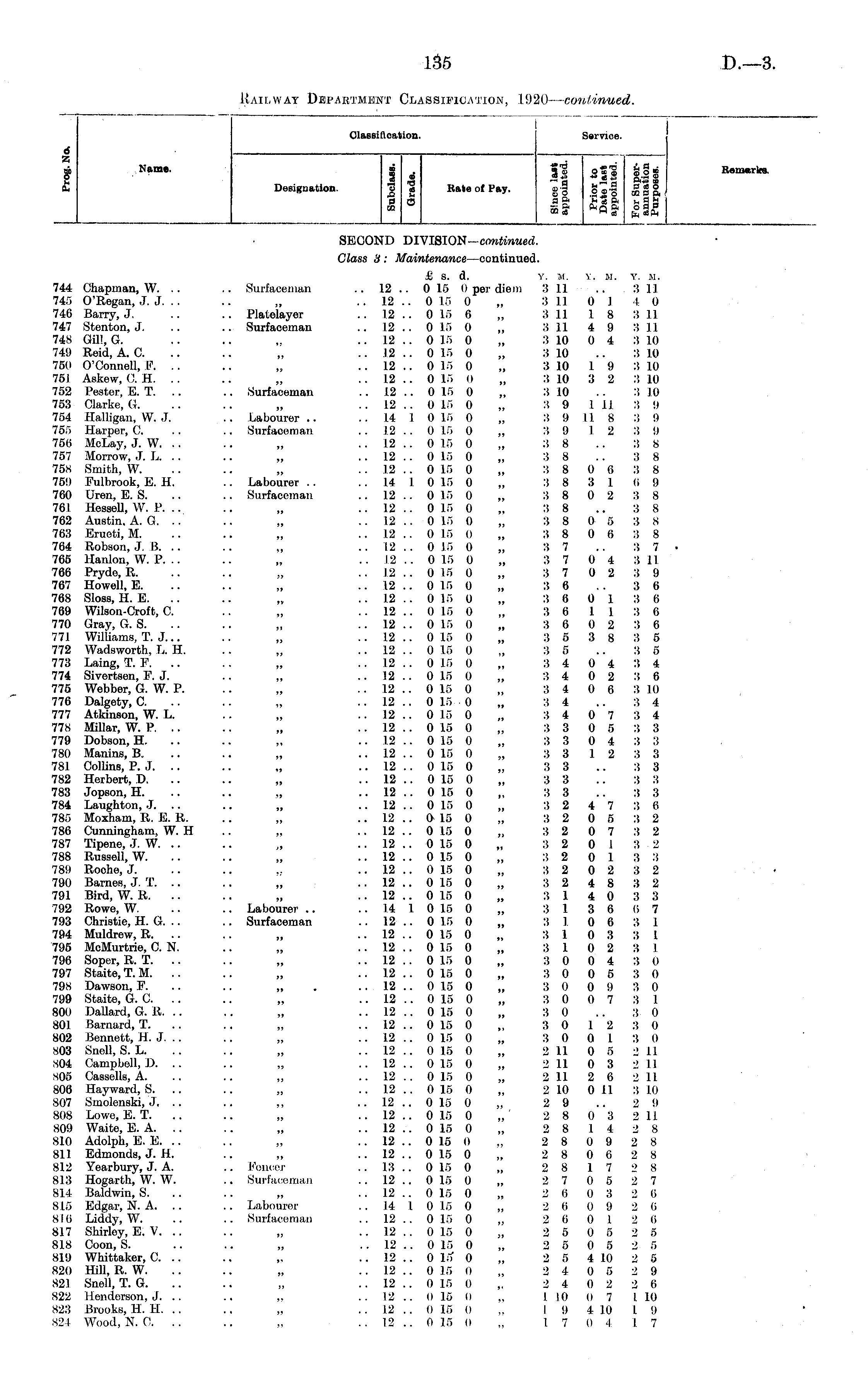 Service. I Classification. 6 A i° c a. Name. CD EG £ A a CO 33 9-g 9 2 a to a a to S a ss n" a .23'3 Psv ton to to cd i-Ii a.*, co B ctt O co b a, Si B a to"to KemarlM. Designation. 9 •n ta rt o Rate of Pay. SECOND DIVISION- continued. Class 3 : Maintenance —continued. 744 Chapman, W. .. 745 O'Regan, J. J. . . 746 Barry, J. 747 Stenton, J. 748 Gil!, G. 749 Reid, A. C. 750 O'Connell, F. . . 751 Askew, 0. H. .. 752 Pester, E. T. 753 Clarke, G. 754 Halligan, VV. J. 755 Harper, 0. 756 McLay, J. W. . . 757 Morrow, J. L. .. 758 Smith, W. 759 Fulbrook, E. H. 760 Oren, E. S. 761 Hessell, W. P. .. 762 Austin, A. G. 763 Erueti, M. 764 Robson, J, B. .. 765 Hanlon, W. P. .. 766 Pryde, R. 767 Howell, E. 768 Sloss, H. E. 769 Wilson-Croft, C. 770 Gray, G. S. 771 Williams, T. J... 772 Wadsworth, L. H. 773 Laing, T. F. .. 774 Sivertsen, F. J. 775 Webber, G. W. P. 776 Dalgety, C 777 Atkinson, W. L. 778 Millar, W. P. 779 Dobson, H. 780 Manins, B. 781 Collins, P. J. .. 782 Herbert, D, 783 Jopson, H. 784 Laughton, J. .. 785 Moxham, R. E. R. 786 Cunningham. W. H 787 Tipene, J. W. .. 788 Russell, W. 789 Roohe, J. 790 Barnes, J. T. .. 791 Bird, W. R. .. 792 Rowe, W. 793 Christie, H. G. .. 794 Muldrew, R. .. 795 McMurtrie, C N. 796 Soper, R. T. 797 Staite, T. M. 798 Dawson, F. 799 Staite, G. C 800 Dallard, G. R. .. 801 Barnard, T. 802 Bennett, H. J. .. 803 Snell, S. L. 804 Campbell, 1). .. 805 Cassells, A. 806 Hayward, S. .. 807 Smolenski, J, .. 808 Lowe, E. T. 809 Waite, E. A. 810 Adolph, E. E. .. 811 Edmonds, J. H. 812 Yearbury, J. A. 813 Hogarth, W. W. 814 Baldwin, S. 815 Edgar, N. A. .. 816 Liddy, W. 817 Shirley, E. V. 818 Coon, S. 819 Whittaker, 0. .. 820 Hill, R. W. 821 Snell, T. G. 822 Henderson, J. 823 Brooks, H. H. .. 824 Wood, N. C Surfaceman Platelayer Surfaceman Surfaceman ,, Labourer .. Surfaceman Labourer .. Surfaceman ii ii ii ii ii Labourer .. Surfaceman Foncer Surfaceman Labourer Surfaceman £ s. d. Y. M. .. 12 .. 0 15 0 per diem 3 11 .. 12 .. 0 15 0 „ 3 11 .. 12 .. 0 15 6 „ 3 11 .. 12 .. 0 15 0 „ 3 11 .. 12 .. 0 15 0 „ 3 10 .. 12 .. 0 15 0 „ 3 10 .. 12 .. 0 15 0 „ 3 10 .. 12 .. 0 15 0 „ 3 10 .. 12 .. 0 15 0 „ 3 10 .. 12 .. 0 15 0 „ 3 9 .. 14 1 0 15 0 „ 3 9 .. 12 .. 0 15 0 „ 3 9 .. 12 .. 0 15 0 „ 3 8 .. 12 .. 0 15 0 „ 3 8 .. 12 .. 0 15 0 „ 3 8 .. 14 1 0 15 0 „ 3 8 .. 12 .. 0 15 0 „ 3 8 .. 12 .. 0 15 0 3 8 .. 12 .. 0 15 0 „ 3 8 .. 12 .. 0 15 0 „ 3 8 .. 12 .. 0 15 0 „ 3 7 .. 12 .. 0 15 0 „ 3 7 .. 1.2 .. 0 15 0 „ 3 7 .. 12 .. 0 15 0 „ 3 6 .. 12 .. 0 15 0 „ 3 6 .. 12 .. 0 15 0 „ 3 6 .. 12 .. 0 15 0 „ 3 6 .. 12 .. 0 15 0 „ 3 5 .. 12 .. 0 1.5 0 3 5 .. 12 .. 0 15 0 „ 3 4 .. 12 .. 0 15 0 „ 3 4 .. 12 .. 0 15 0 „ 3 4 .. 12 .. 0 15 0 „ 3 4 .. 12 .. 0 15 0 „ 3 4 .. 12 .. 0 15 0 „ 3 3 .. 12... 0 15 0 „ 3 3 .. 12 .. 0 15 0 „ 3 3 .. 12 .. 0 15 0 „ 3 3 .. 12 .. 0 15 0 „ 3 3 .. 12 .. 0 15 0 „ 3 3 .. 12 .. 0 15 0 „ 3 2 .. 12 .. O 15 0 „ 3 2 .. 12 .. 0 15 0 „ 3 2 .. 12 .. 0 15 0 „ 3 2 .. 12 .. 0 15 0 „ 3 2 .. 12 .. 0 15 0 „ 3 2 .. 12 .. 0 15 0 „ 3 2 .. 12 .. 0 15 0 „ 3 1 .. 14 1 0 15 0 3 1 .. 12 .. 0 15 0 „ 3 1 .. 12 .. 0 15 0 3 1 .. 12 .. 0 15 0 „ 3 1 .. 12 .. 0 15 0 „ 3 0 .. 12 .. 0 15 0 „ 3 0 .. 12 .. 0 15 0 „ 3 0 .. 12 .. 0 15 0 „ 3 0 .. 12 .. 0 15 0 „ 3 0 .. 12 .. 0 15 0 „ 3 0 .. 12 .. 0 15 0 „ 3 0 .. 12 .. 0 15 0 „ 2 11 .. 12 .. 0 15 0 „ 2 11 .. 12 .. 0 15 0 „ 2 11 .. 12 .. 0 15 0 „ 2 10 .. 12 .. 0 15 0 „ 2 9 .. 12 .. 0 15 0 „' 2 8 .. 12 .. 0 15 0 „ 2 8 .. 12 .. 0 15 0 „ 2 8 .. 12 .. 0 15 0 „ 2 8 .. 13 .. 0 15 0 „ 2 8 .. 12 .. 0 15 0 „ 2 7 .. 12 .. 0 15 0 „ 2 6 .. 14 I 0 15 0 „ 2 6 .. 12 .. 0 15 0 „ 2 6 .. 12 .. 0 15 0 „ 2 5 .. 12 .. 0 15 0 „ 2 5 .. 12 .. 0 15 0 „ 2 5 .. 12 .. 0 15 0 „ 2 4 .. 12 .. 0 15 0 „ 2 4 . . 12 .. 0 15 0 „ 110 .. 12 .. 0 15 0 ,. I 9 .. 12 .. 0 15 0 „ 1 7 Y. M. Y. M. .. 3 11 0 1 4 0 1 8 3 11 4 9 3 11 0 4 3 10 3 10 19 3 10 3 2 3 10 3 10 1 11 3 9 11 8 3 9 1 2 3 9 3 8 3 8 0 6 3 8 3 16 9 0 2 3 8 3 8 0 5 3 8 0 6 3 8 3 7 0 4 3 11 0 2 3 9 3 6 0 1 3 6 1 1 3 6 0 2 3 6 3 8 3 5 3 5 0 4 3 4 0 2 3 6 0 6 3 10 3 4 0 7 3 4 0 5 3 3 0 4 3 3 1 2 3 3 3 3 3 3 3 3 4 7 3 6 0 5 3 2 0 7 3 2 0 1 3 2 0 1 3 3 0 2 3 2 4 8 3 2 4 0 3 3 3 6 6 7 0 6 3 1 0 3 3 1 0 2 3 1 0 4 3 0 0 5 3 0 0 9 3 0 0 7 3 1 3 0 1 2 3 0 0 1 3 0 0 5 2 11 0 3 2 11 2 6 2 11 0 11 3 10 2 9 0 3 2 11 14 2 8 0 9 2 8 0 6 2 8 17 2 8 0 5 2 7 0 3 2 6 0 9 2 6 0 1 2 6 0 5 2 5 0 5 2 5 4 10 2 5 0 5 2 9 0 2 2 6 0 7 1. 10 4 10 1 9 0 4 I 7
